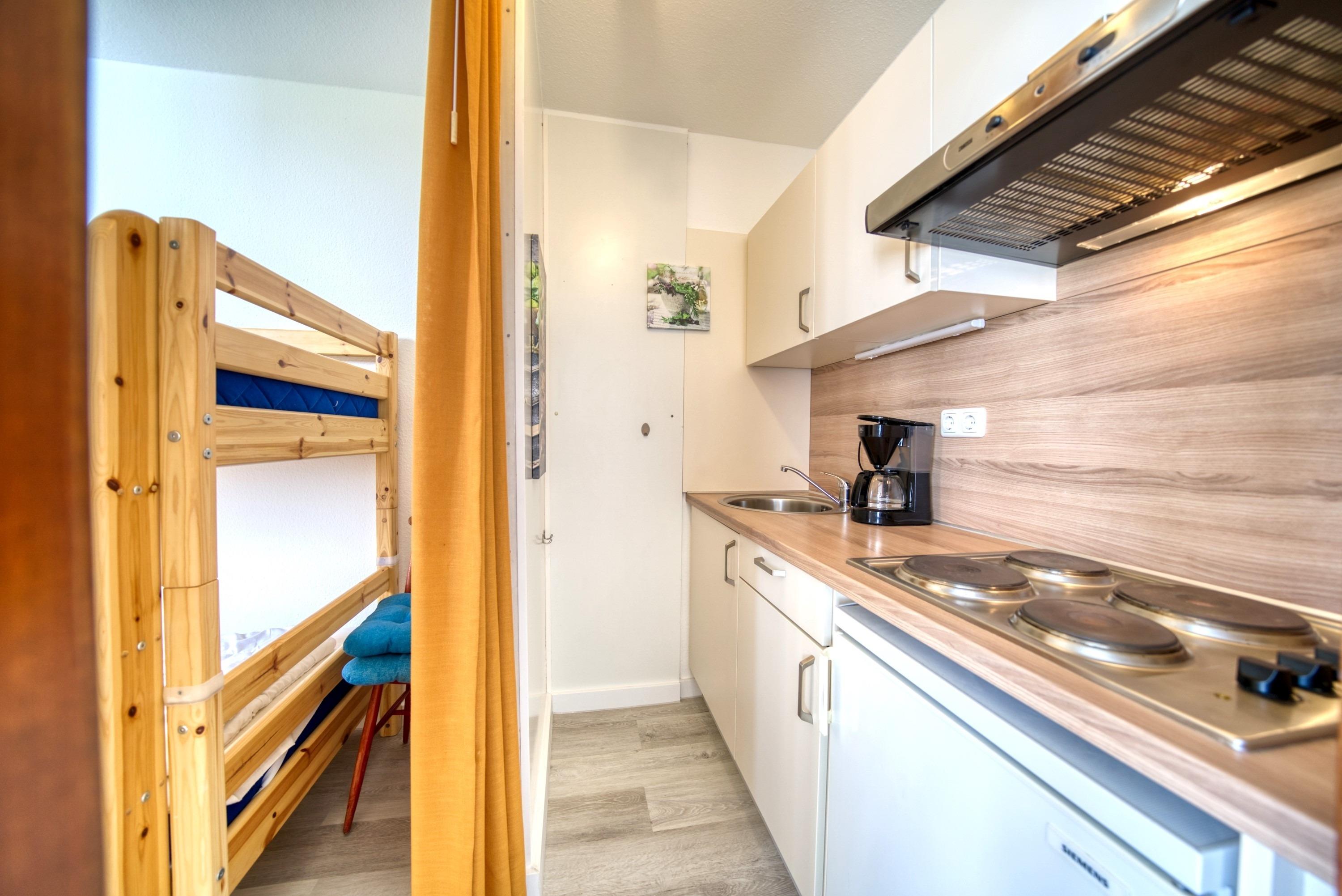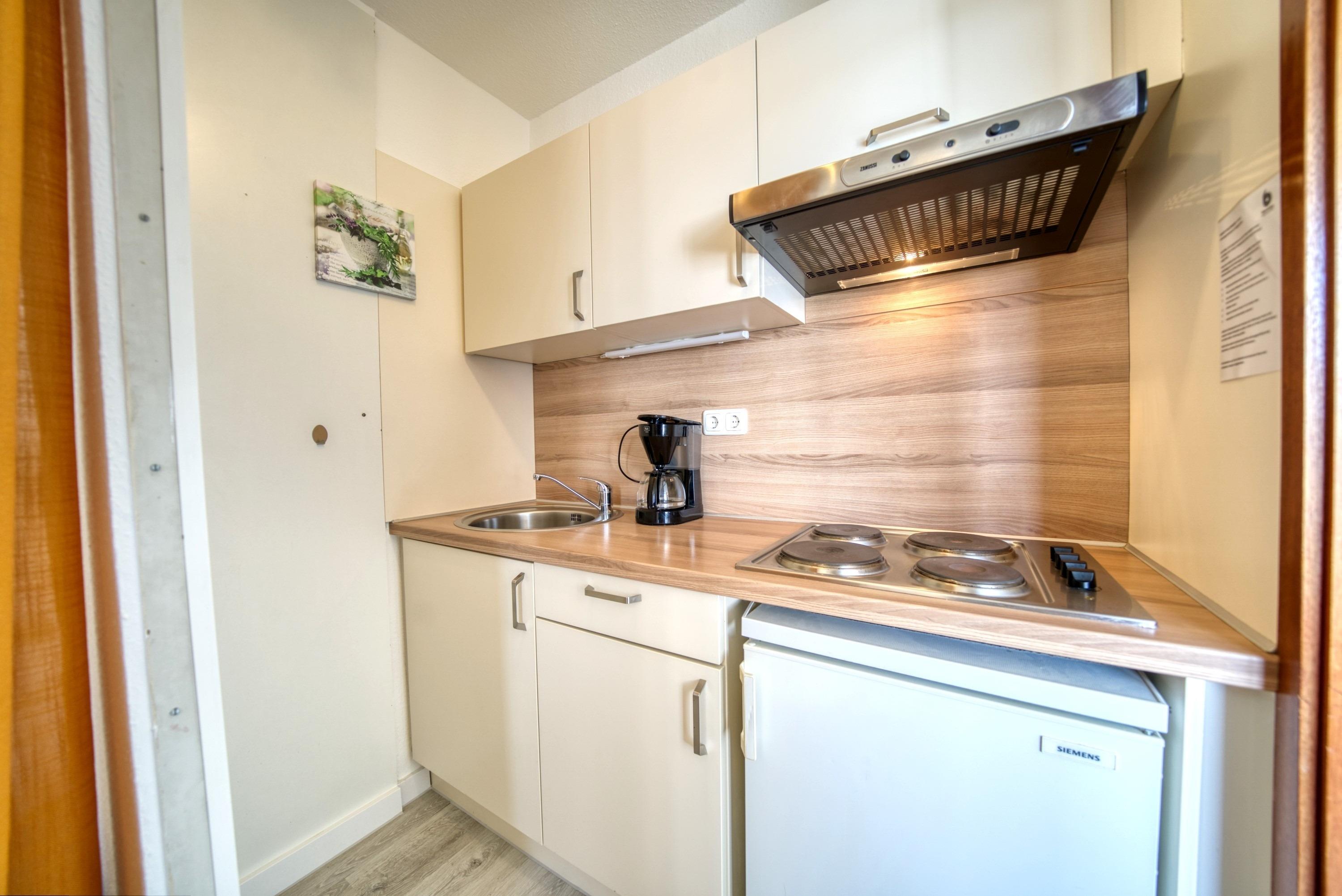 Praktische Küche mit 4-Plattenherd, Kühlschrank mit Gefrierfach, Filterkaffeemaschine, Toaster und Wasserkocher