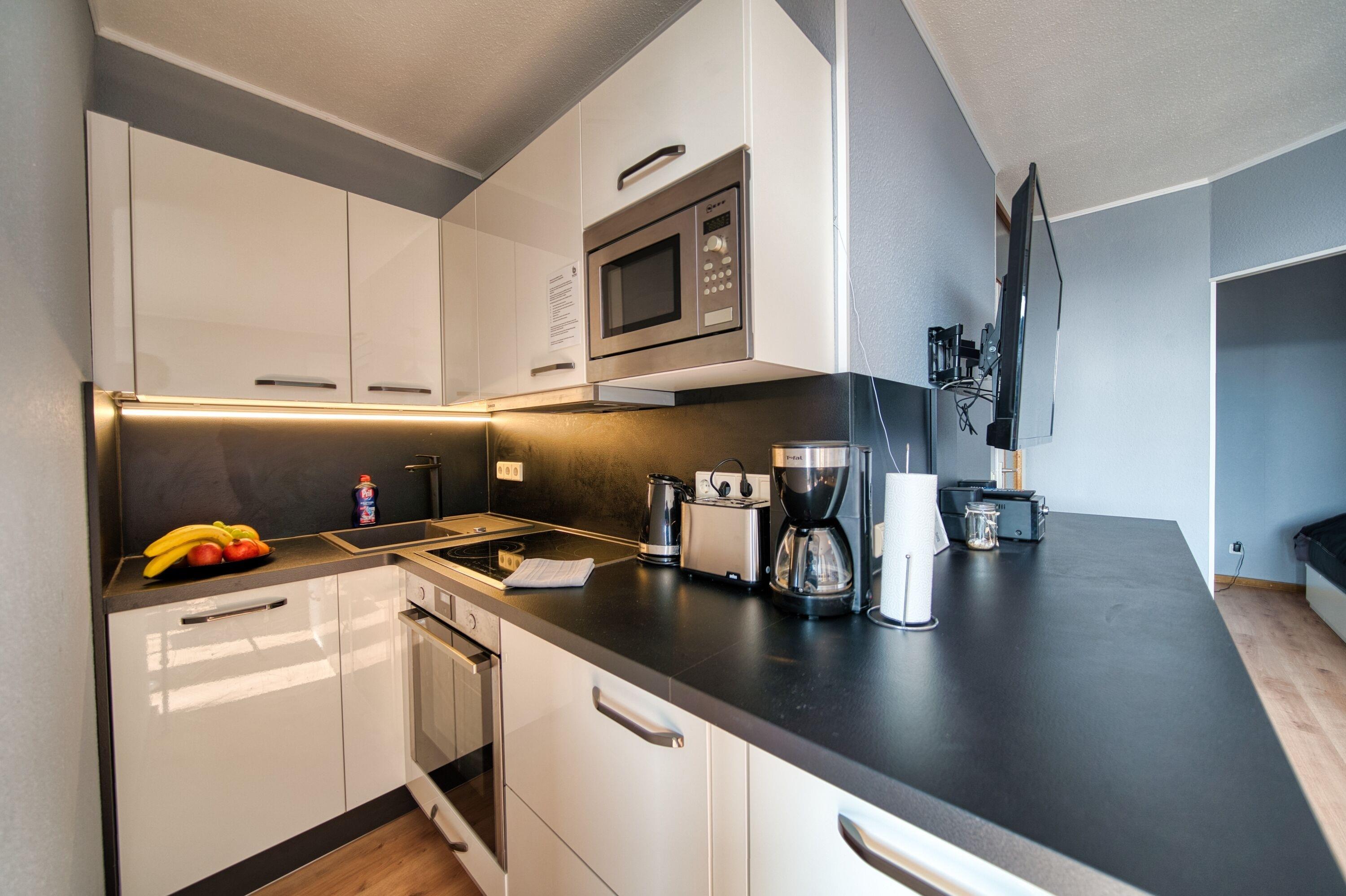 Küche: Einbauküche mit Geschirrspüler, Backofen, Mikrowelle und Ceranfeld