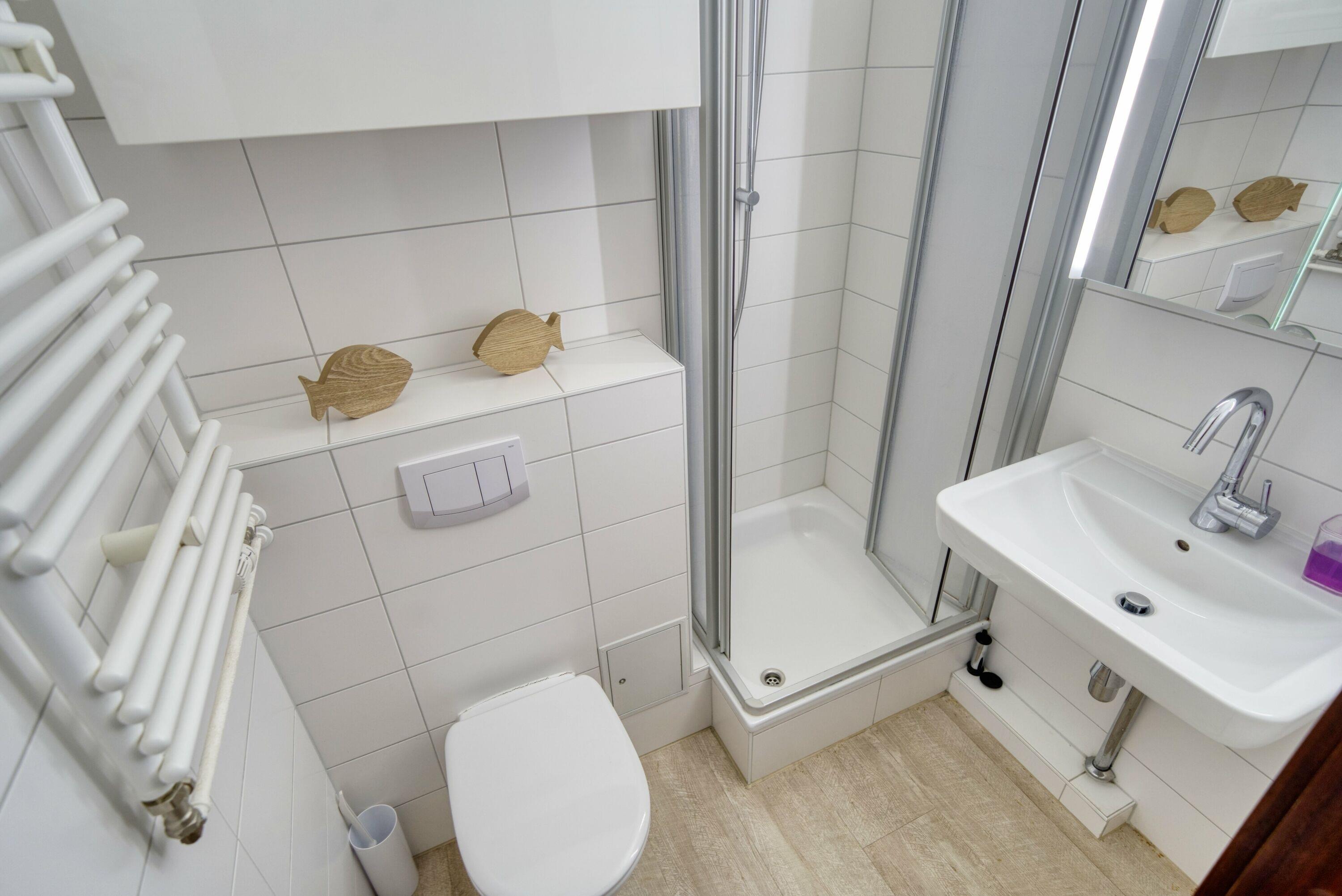 Badezimmer mit Duschkabine, WC und Handtuchtrockner