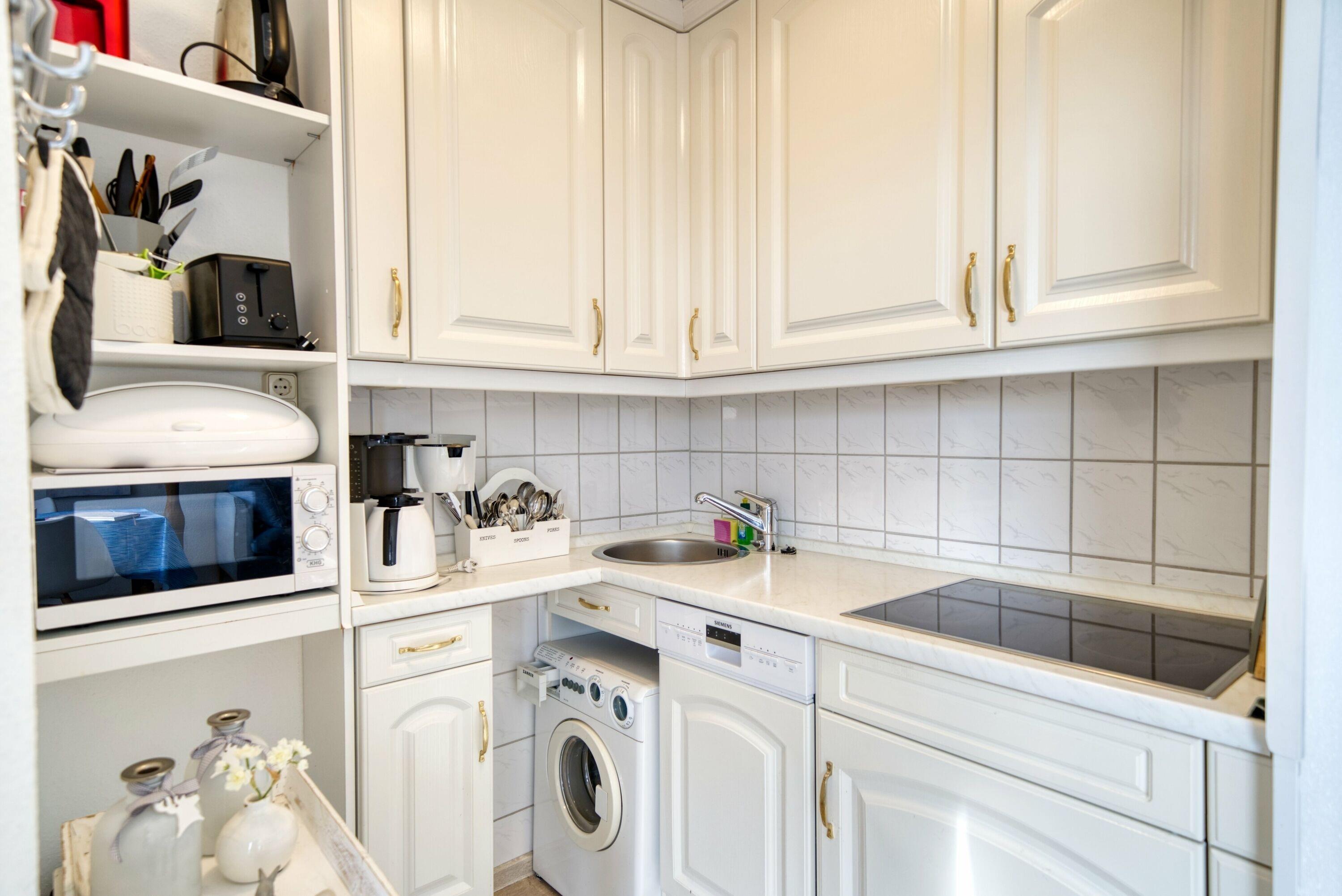 Voll ausgestattete Küche mit Ceranherd, Geschirrspüler, Mikrowelle, Toaster, Filterkaffeemaschine und sogar Waschmaschine
