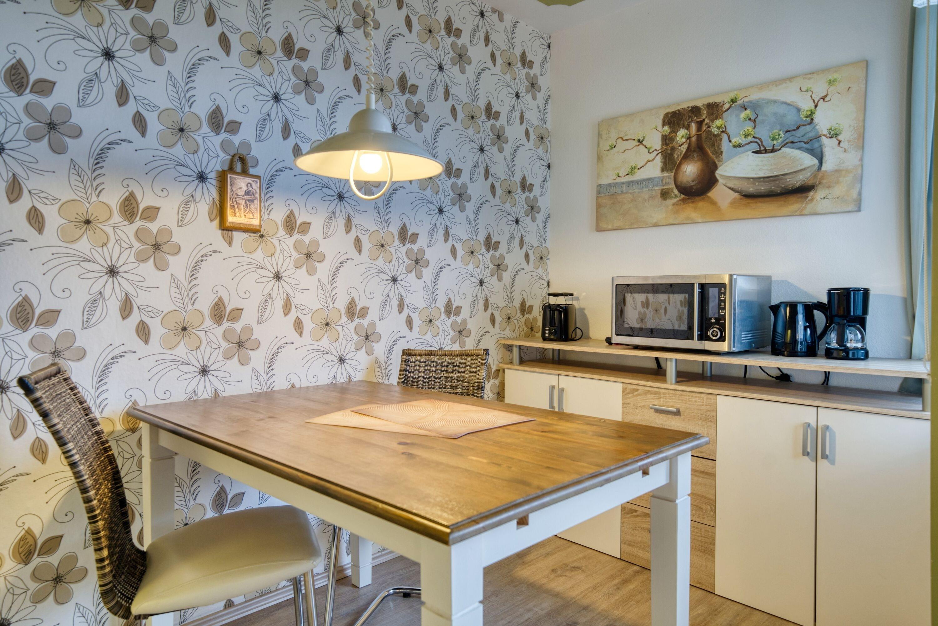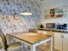 Küche mit 4-Plattenherd, Kühlschrank mit Gefrierfach, Toaster, Wasserkocher, Filterkaffeemaschine und Mikrowelle
