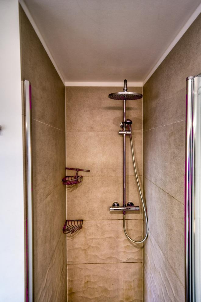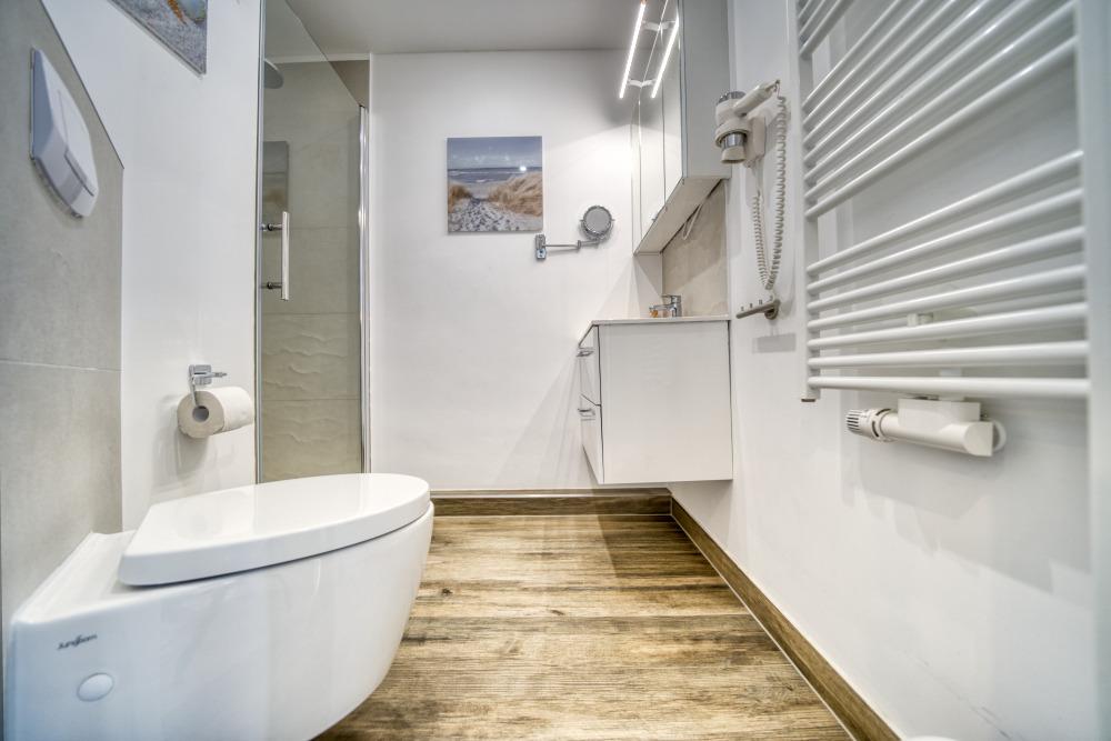 Badezimmer mit Duschkabine mit niedrigem Einstieg, WC und Handtuchtrockner