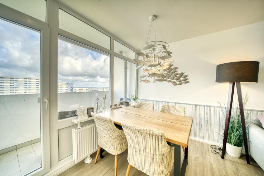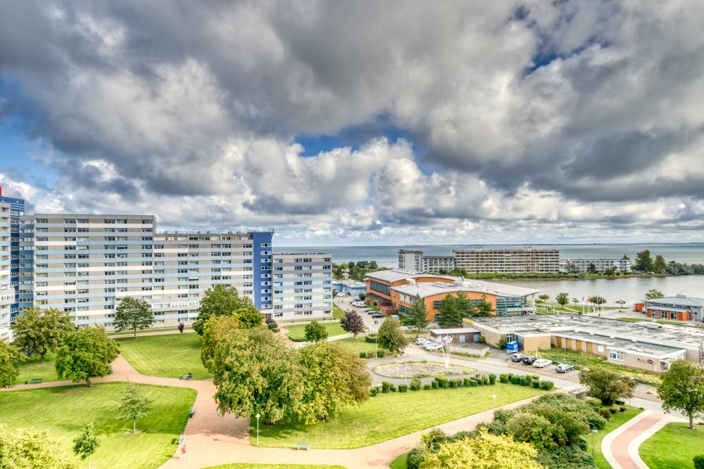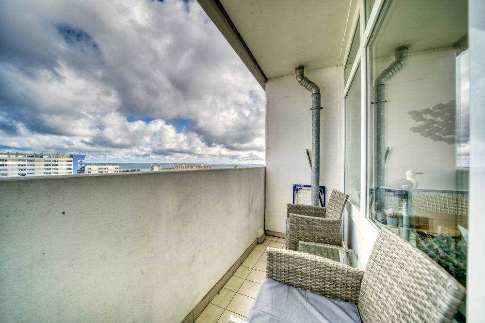 Genießen Sie Ihren Urlaub in dieser komfortablen 45?m² großen Ferienwohnung in der 9. Etage des Hauses N, ideal für bis zu 5 Personen. Der Balkon mit Blick über den Innenhof auf den Binnensee und die Ostsee lädt zu entspannten Stunden ein – ob beim Frühstück oder beim Ausklingen des Abends.