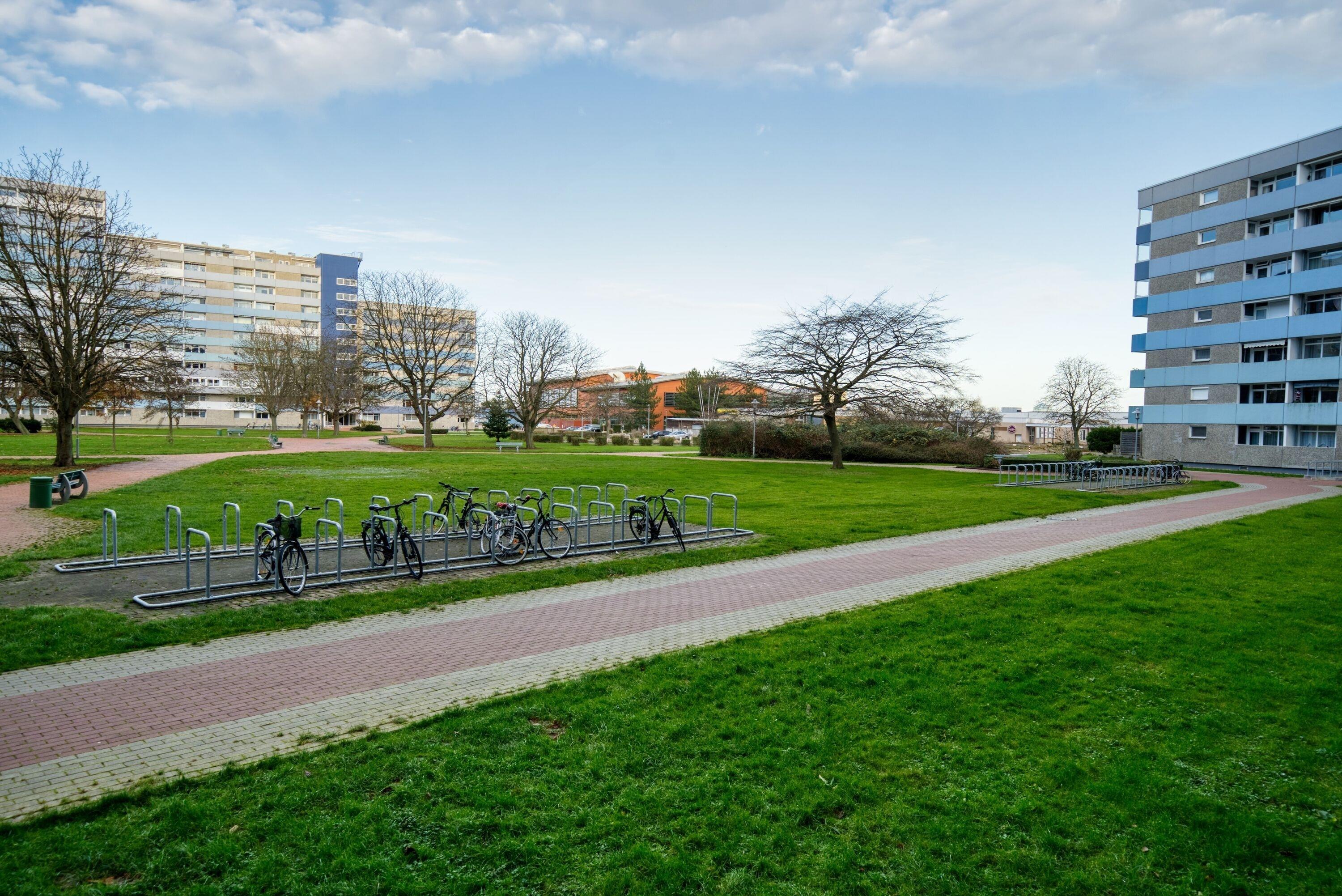 Balkon mit ruhigem Blick auf den begrünten Innenhof