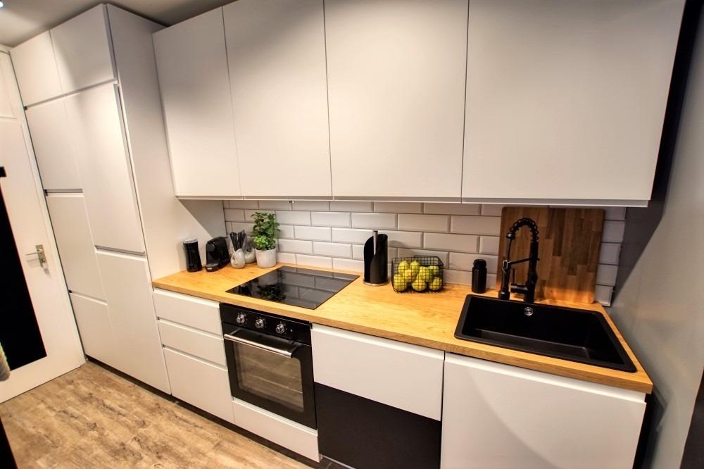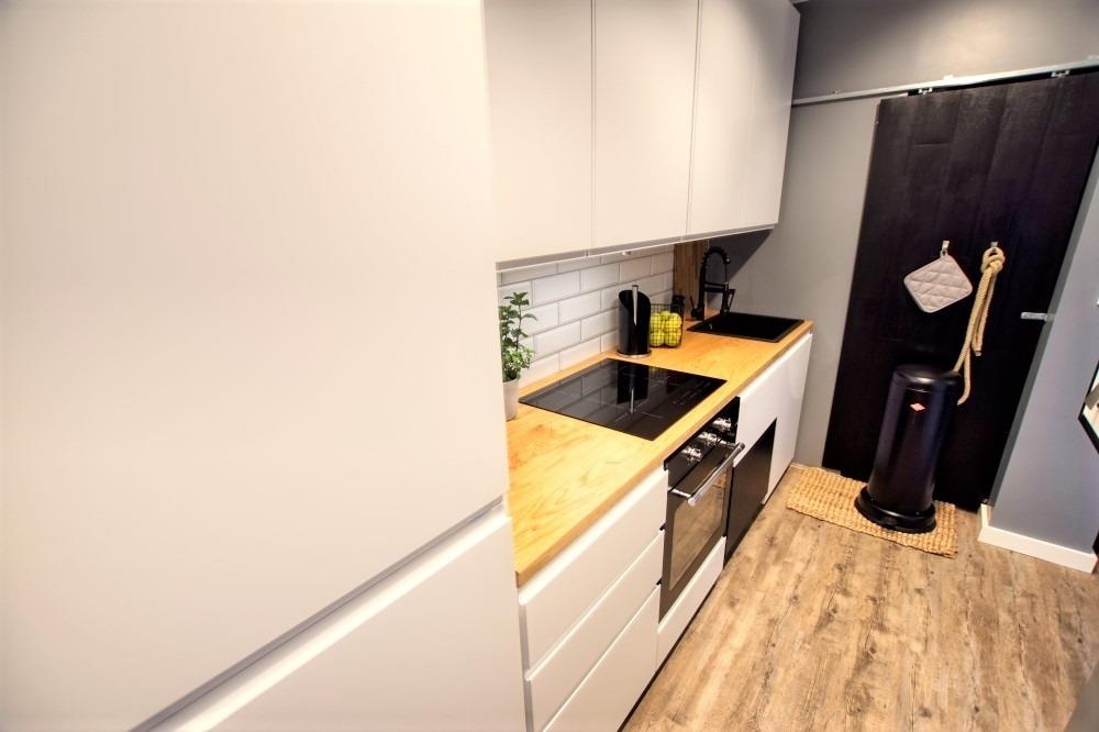 Küche mit Induktionsherd, Kühlschrank mit Gefrierfach, Geschirrspüler, Backofen, Mikrowelle, Kaffeemaschine, Wasserkocher und Toaster