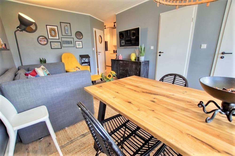 Wohnzimmer mit Schlafsofa (für 2 Personen), Smart-TV und Esstisch vor dem Balkon