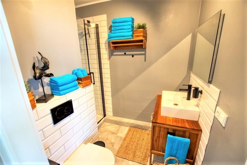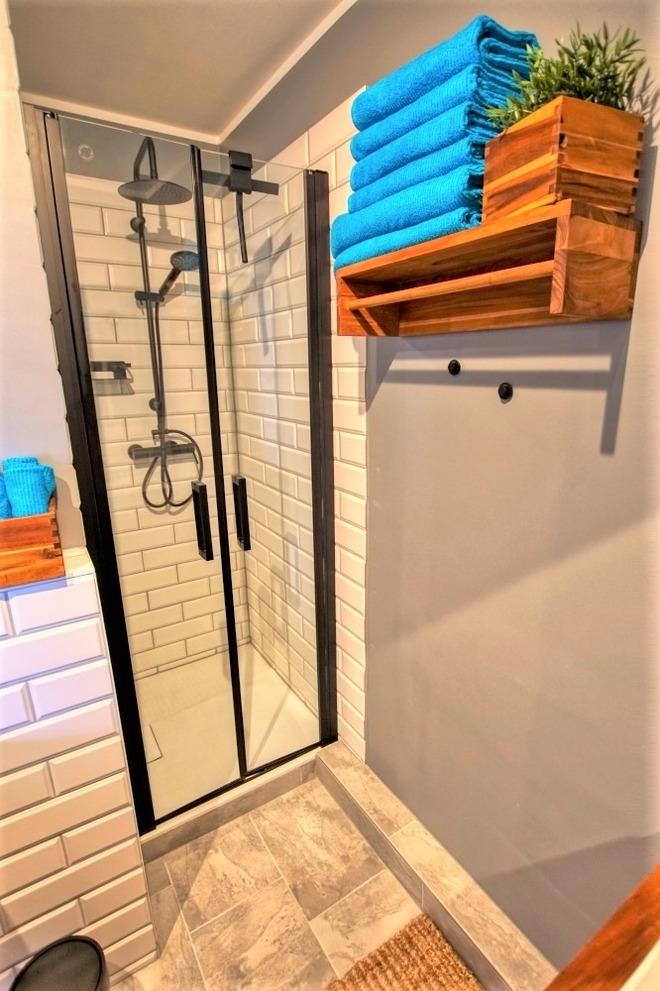 Badezimmer mit Duschkabine mit niedrigem Einstieg, Handtuchtrockner und WC