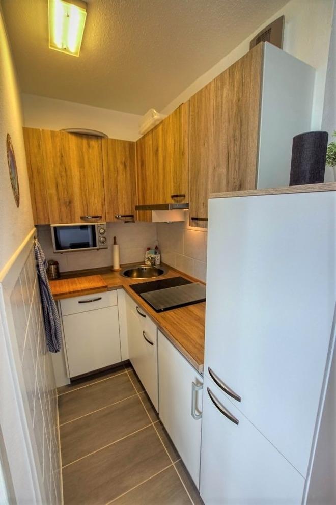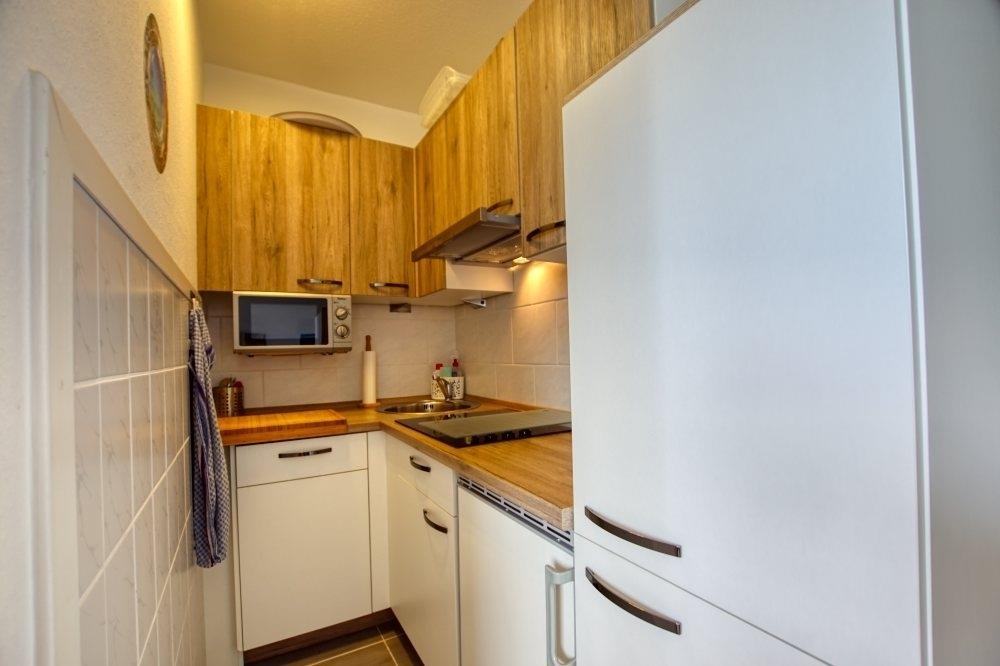 Küche mit Ceranherd, Kühlschrank mit Gefrierfach, Geschirrspüler, Mikrowelle, Toaster, Wasserkocher und Filterkaffeemaschine