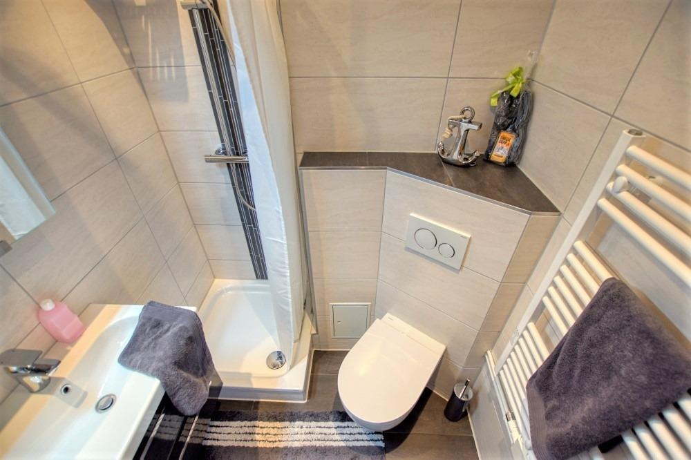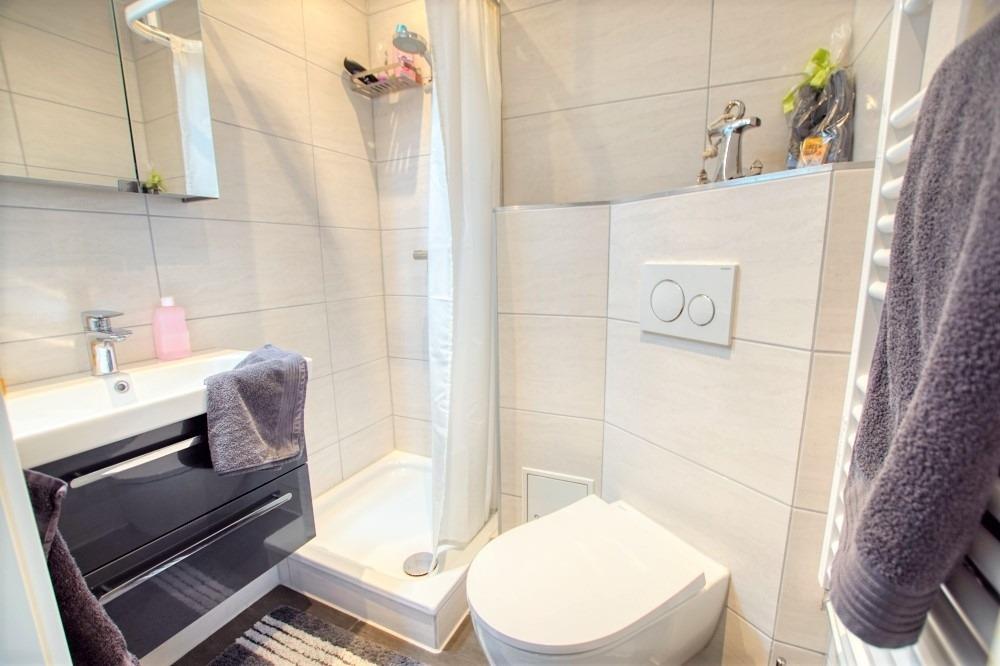 Badezimmer mit Dusche, WC und Handtuchtrockner