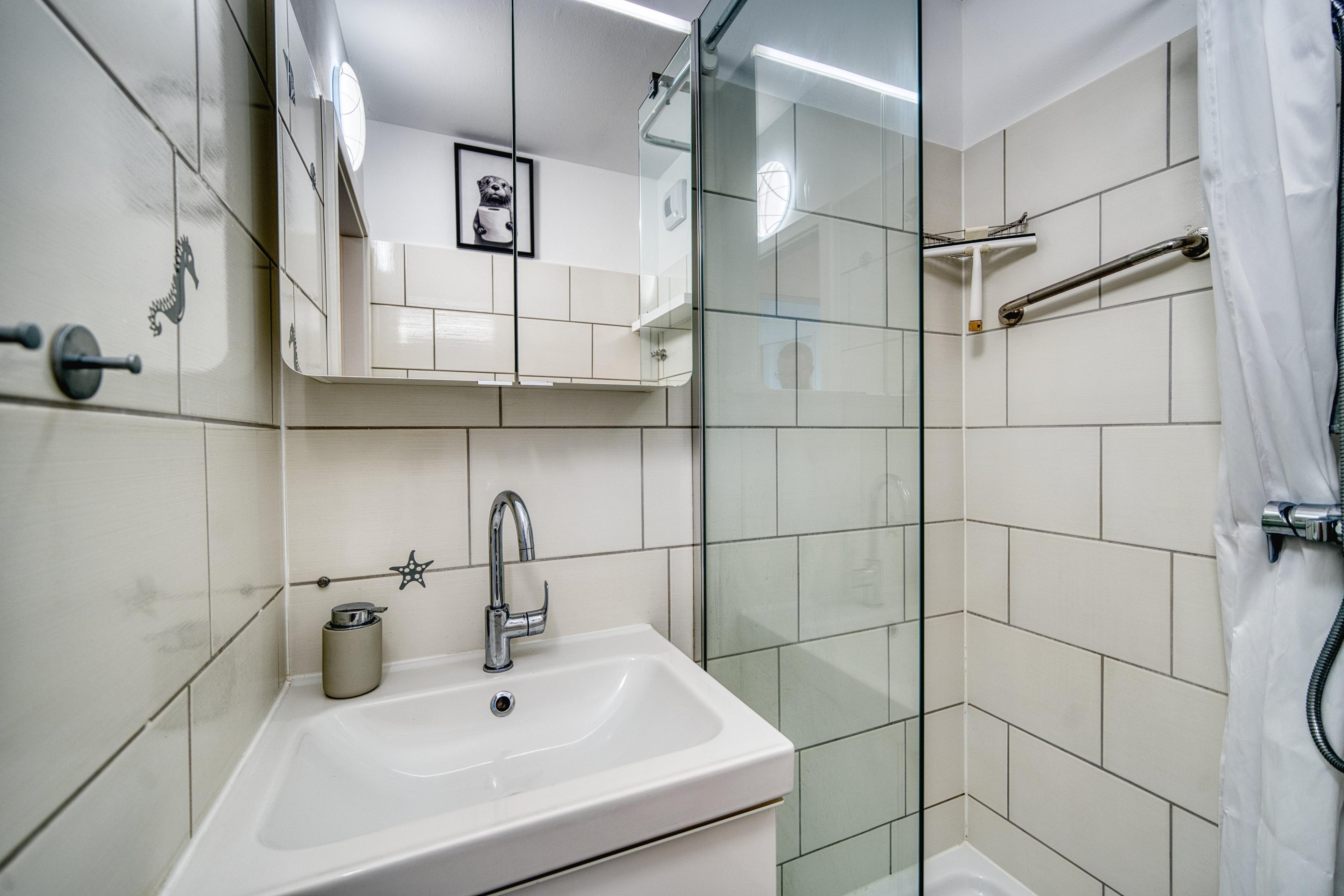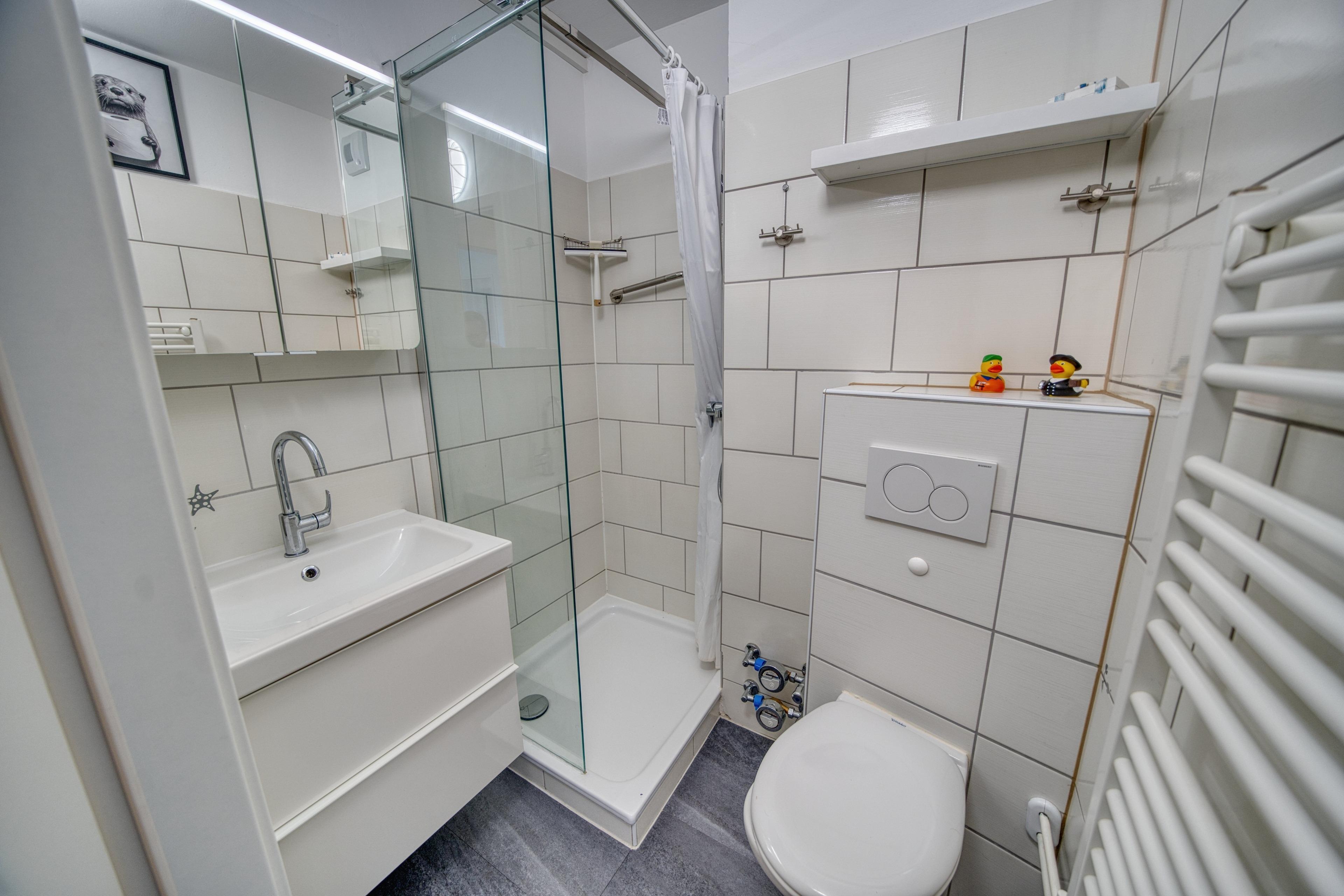 Neues Bad mit Dusche (Glasfront [&] Duschvorhang) und WC