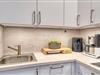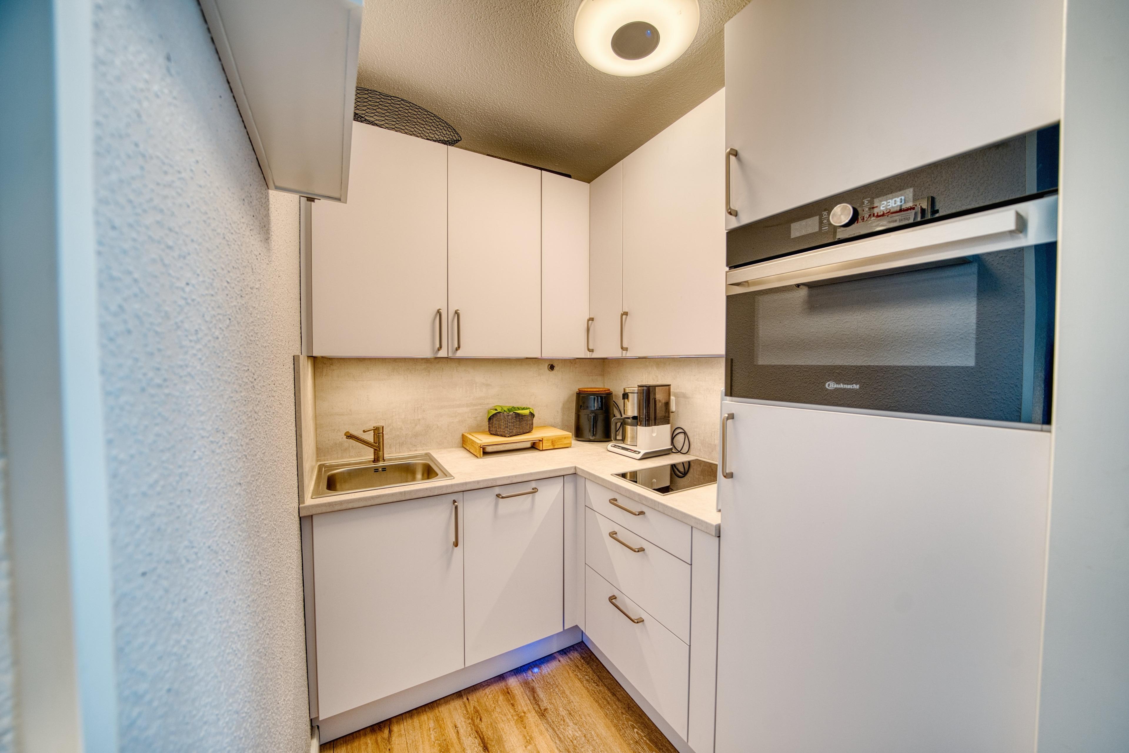 Moderne Küche mit kompletter Ausstattung: Kühlschrank, 2-Platten-Ceranfeld, Mikrowelle mit Grill-/Backfunktion, Heißluftfritteuse, Kaffeemaschine und Toaster