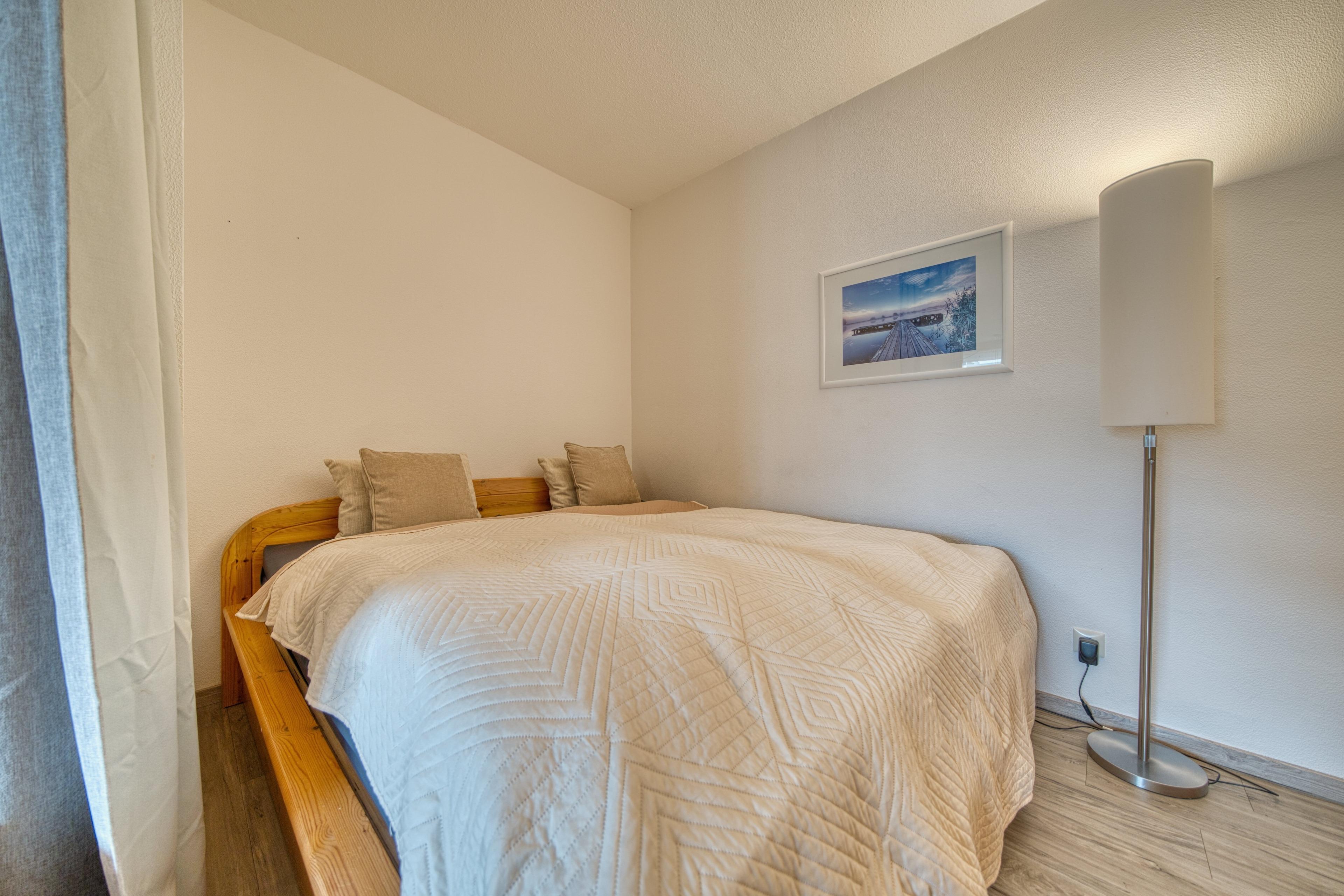 Wohn-/Schlafbereich mit Doppelbett, durch Vorhang optisch separiert