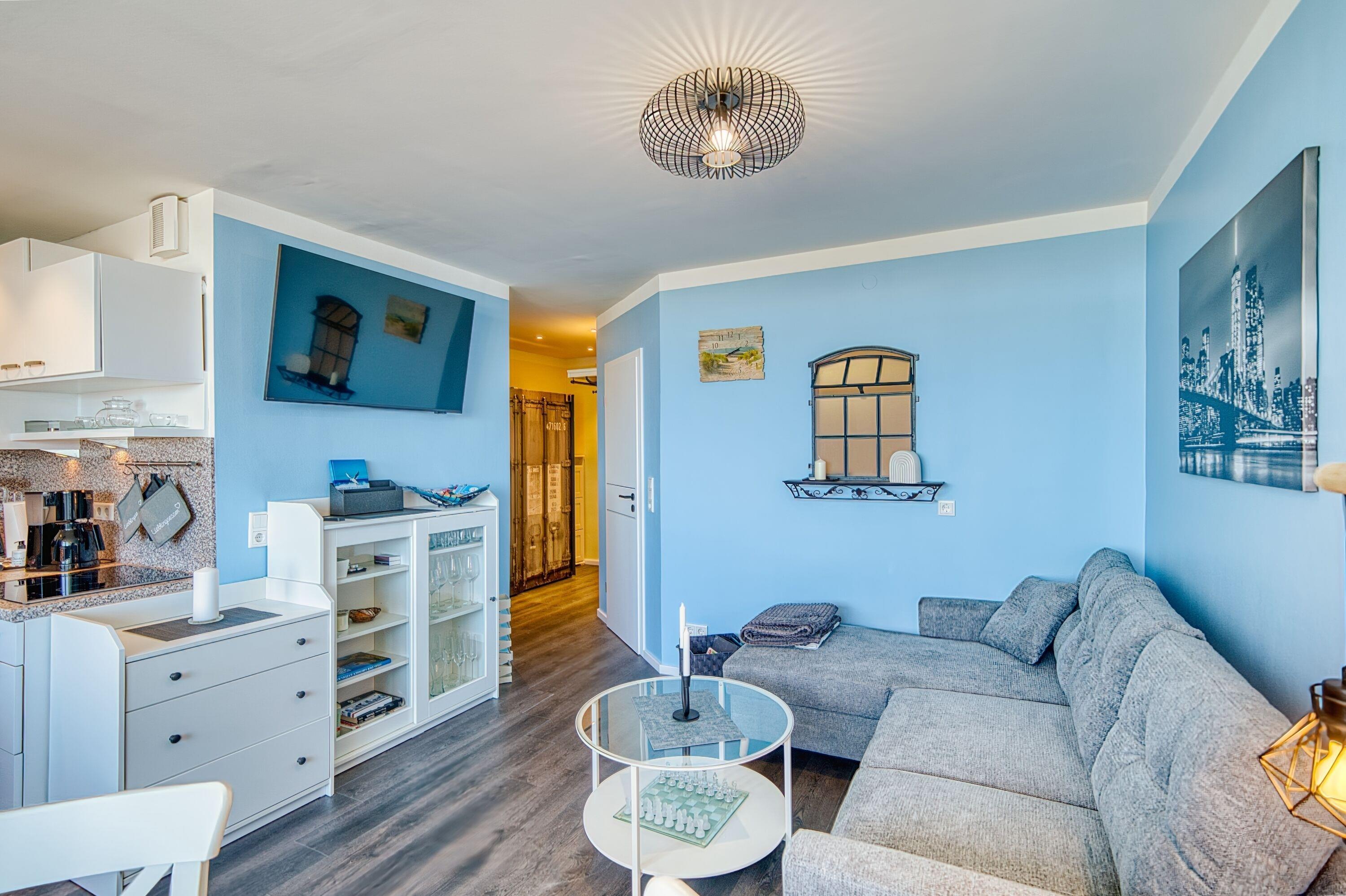 Heller Wohnbereich mit Sofa, großem Flachbild-TV und hochwertigem Vinylfußboden