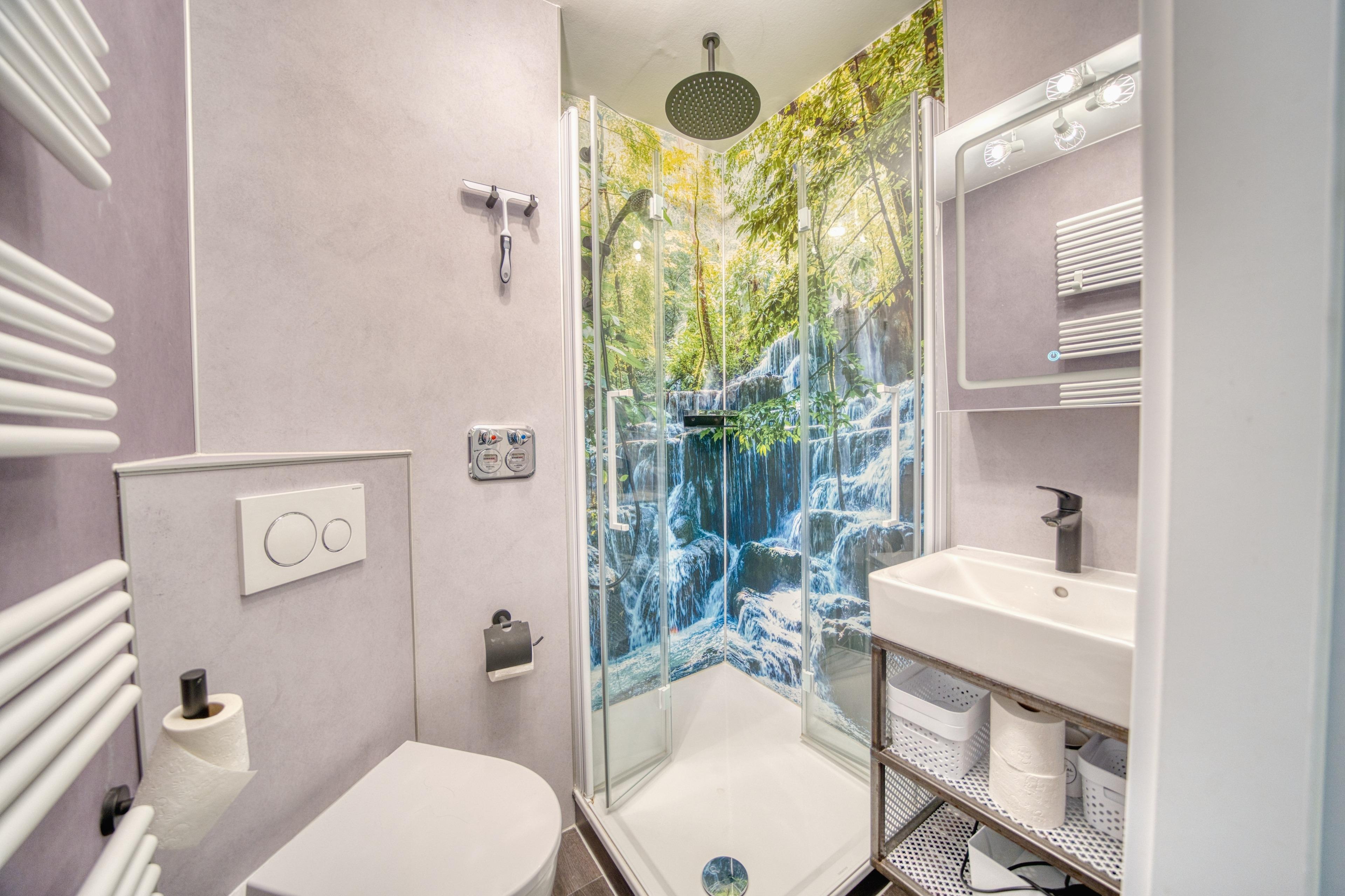 Badezimmer mit Duschkabine (niedriger Einstieg), Handtuchtrockner und modernem Design