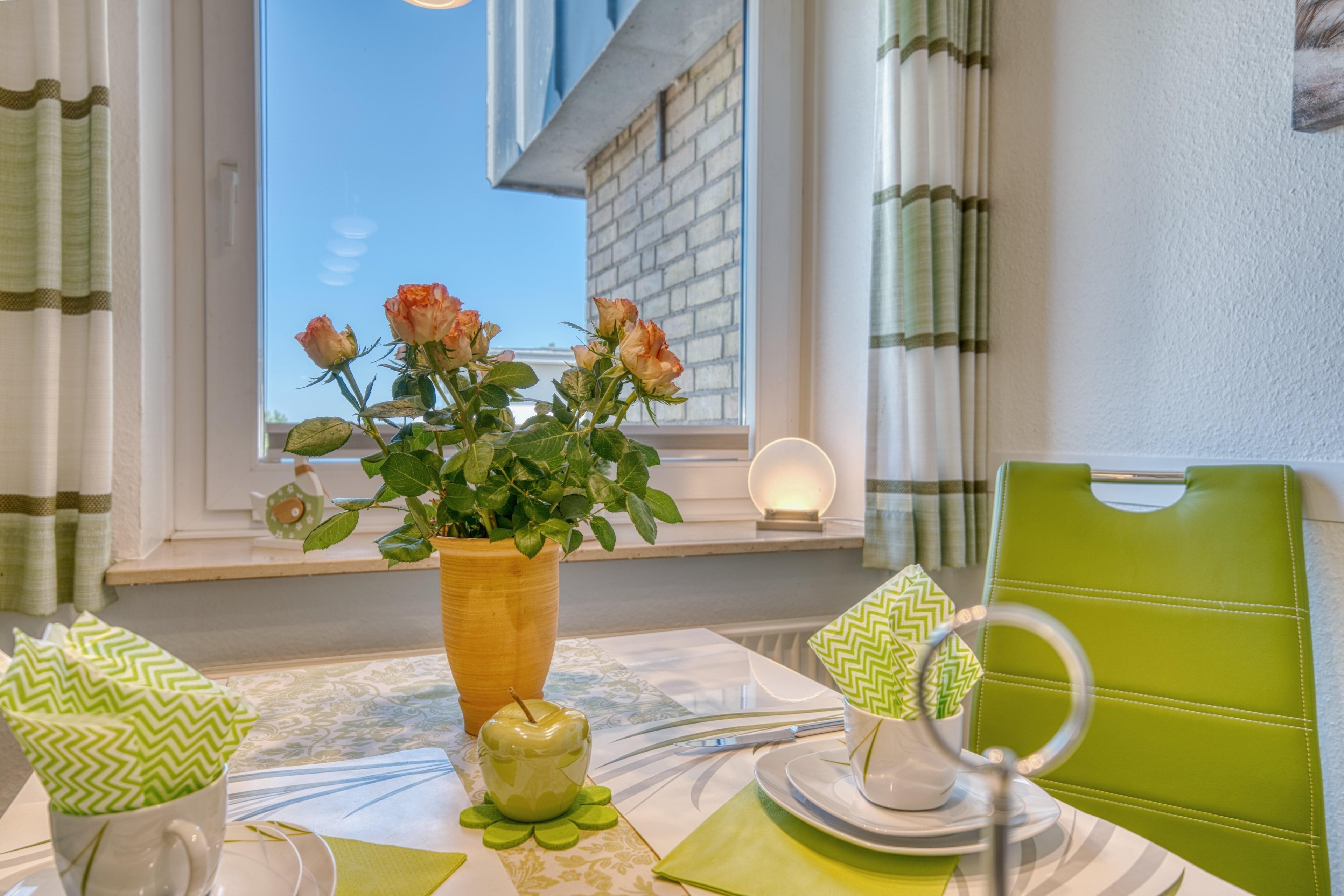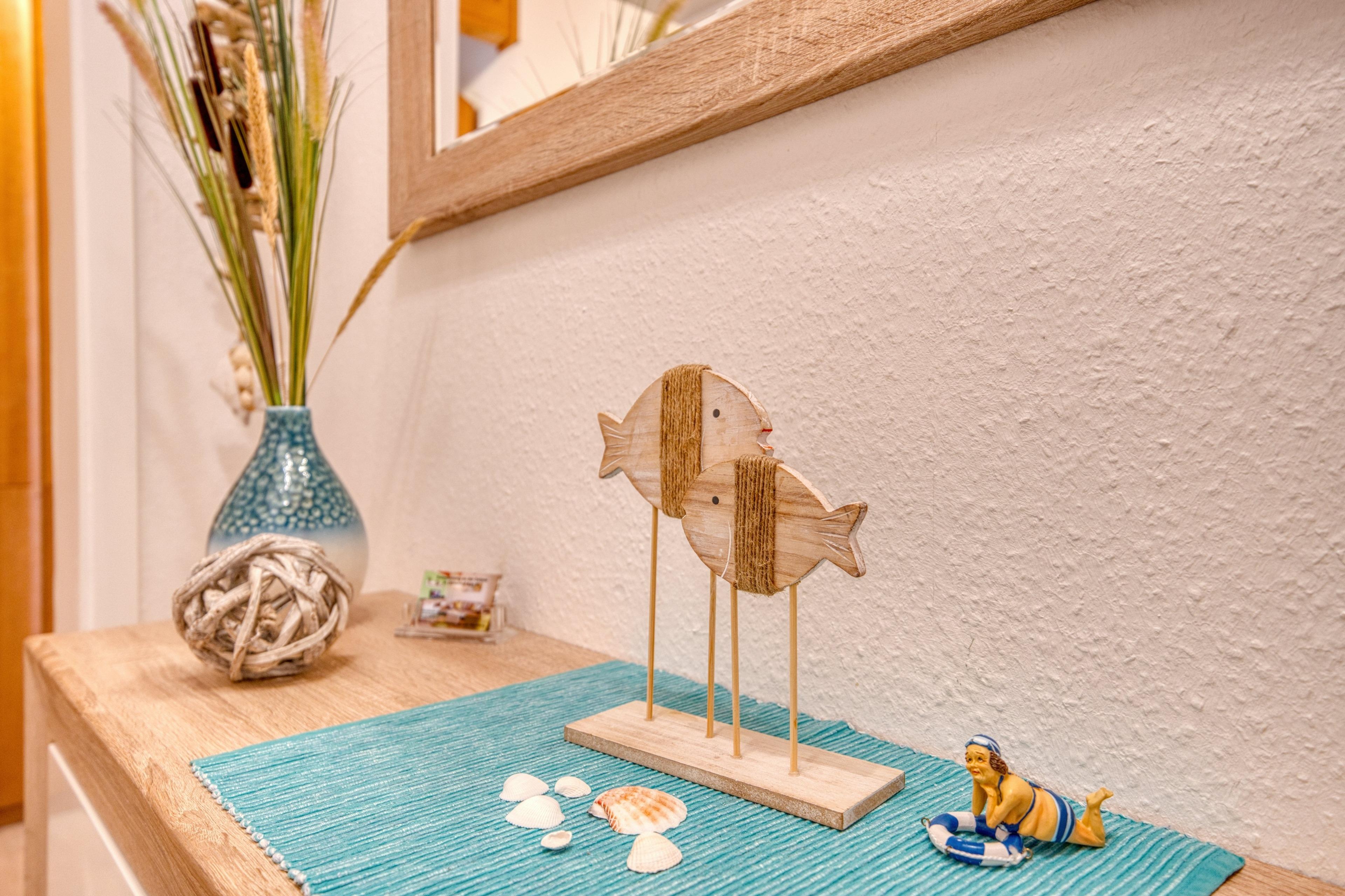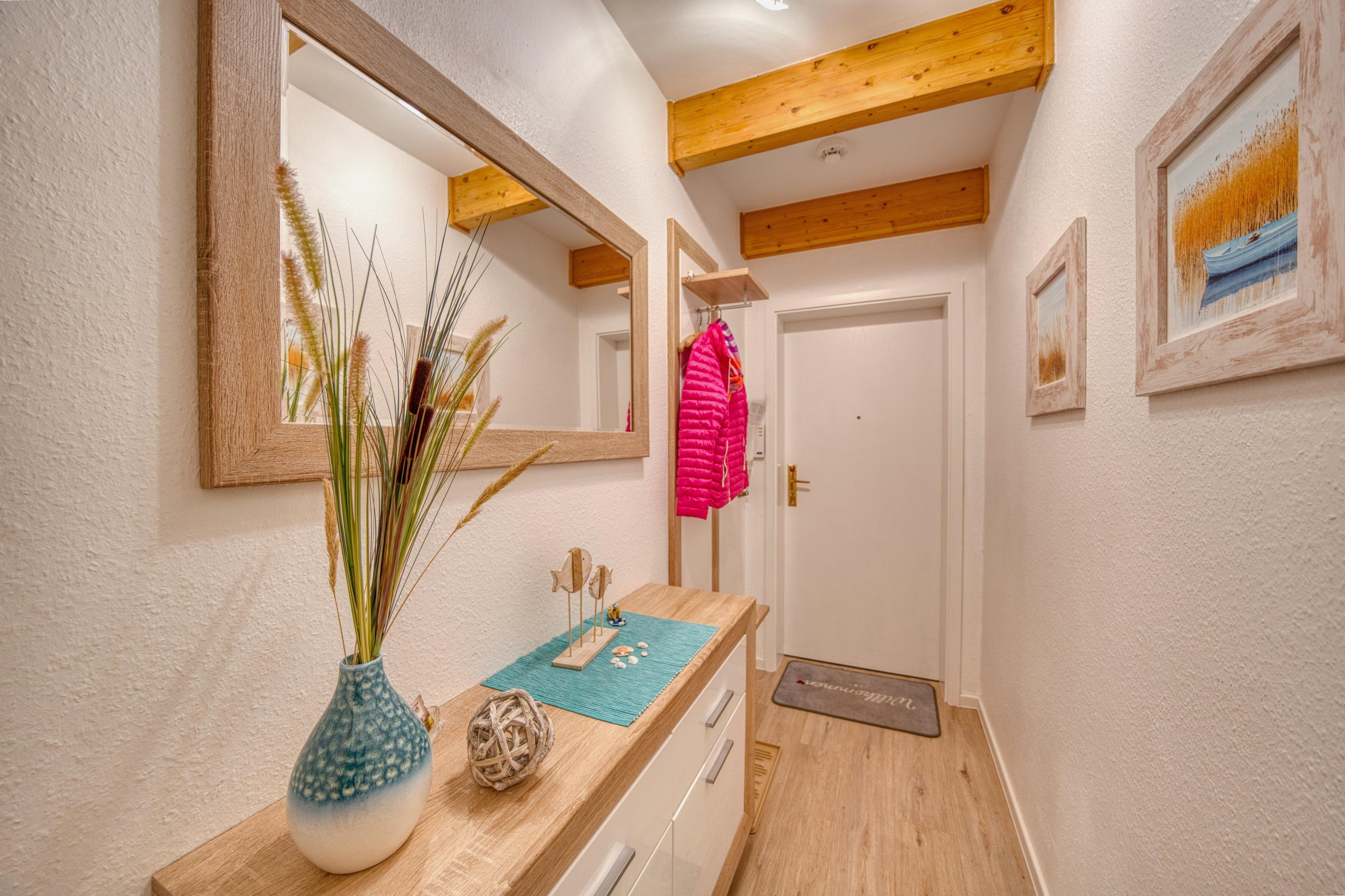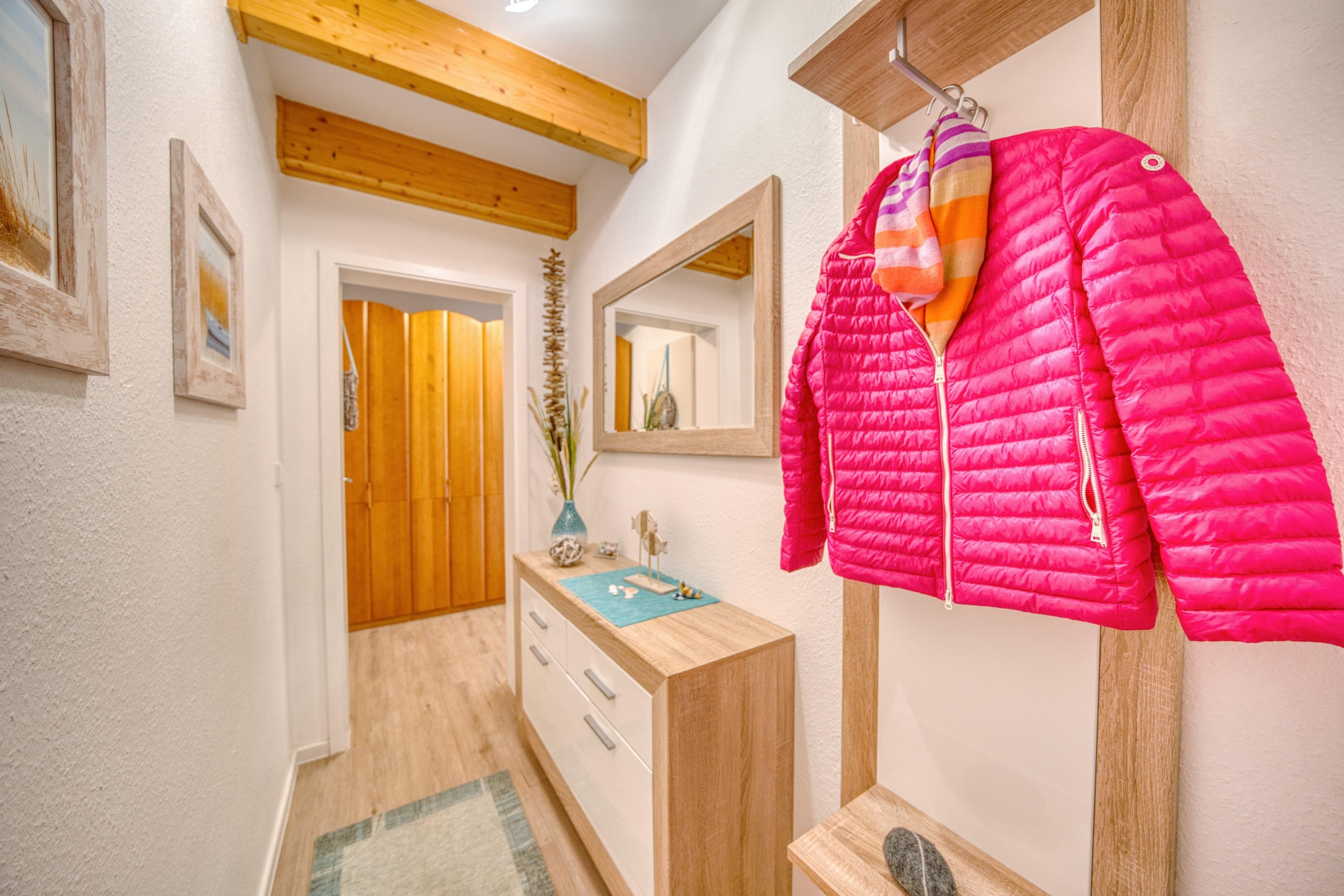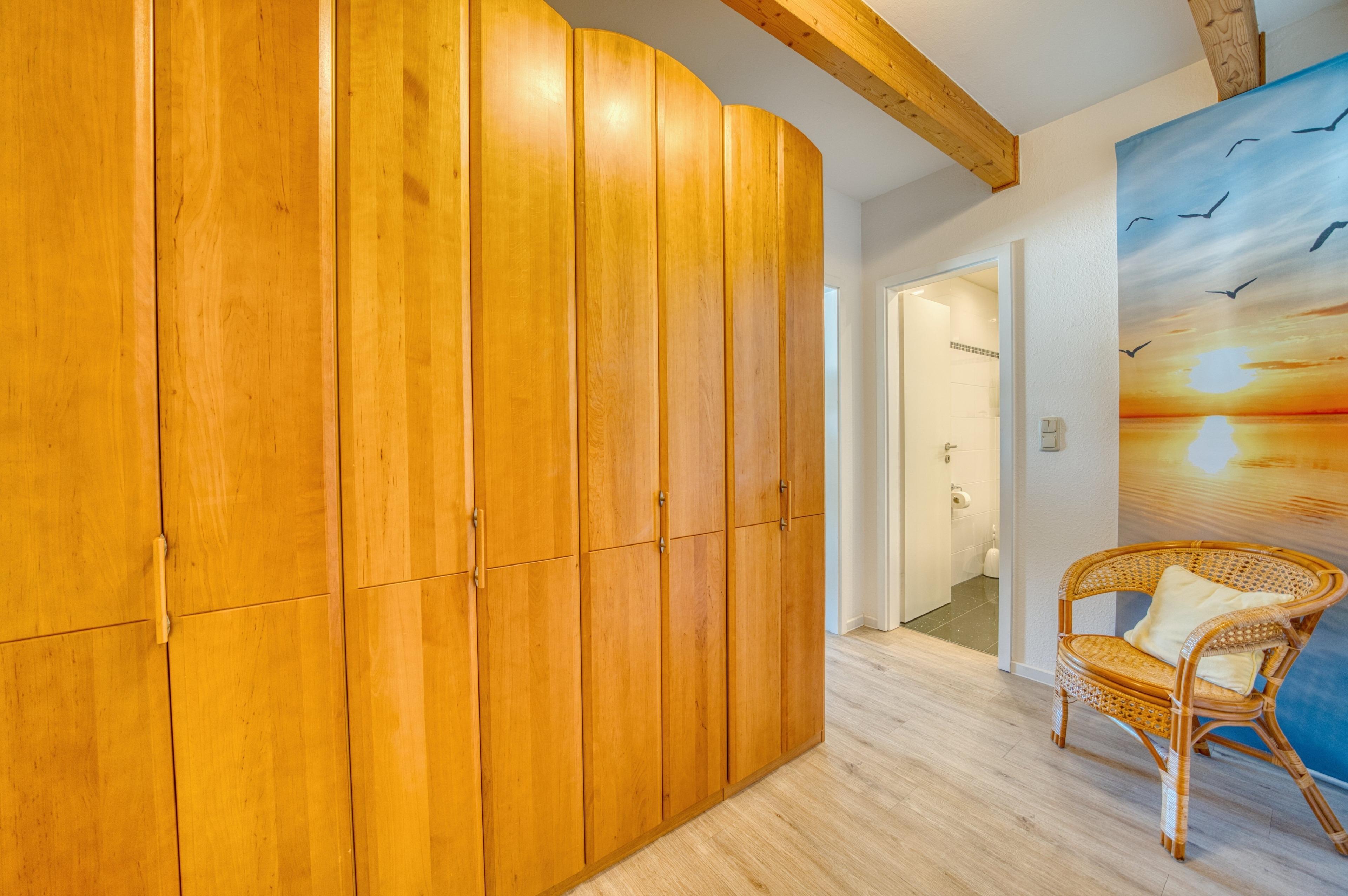 Im Flur steht Ihnen ein großer Kleiderschrank mit viel Stauraum zur Verfügung. Für zusätzlichen Komfort bietet die Ferienanlage einen gemeinschaftlichen Waschraum mit Waschmaschine und Trockner (Nutzung mit 1-€-Münzen).