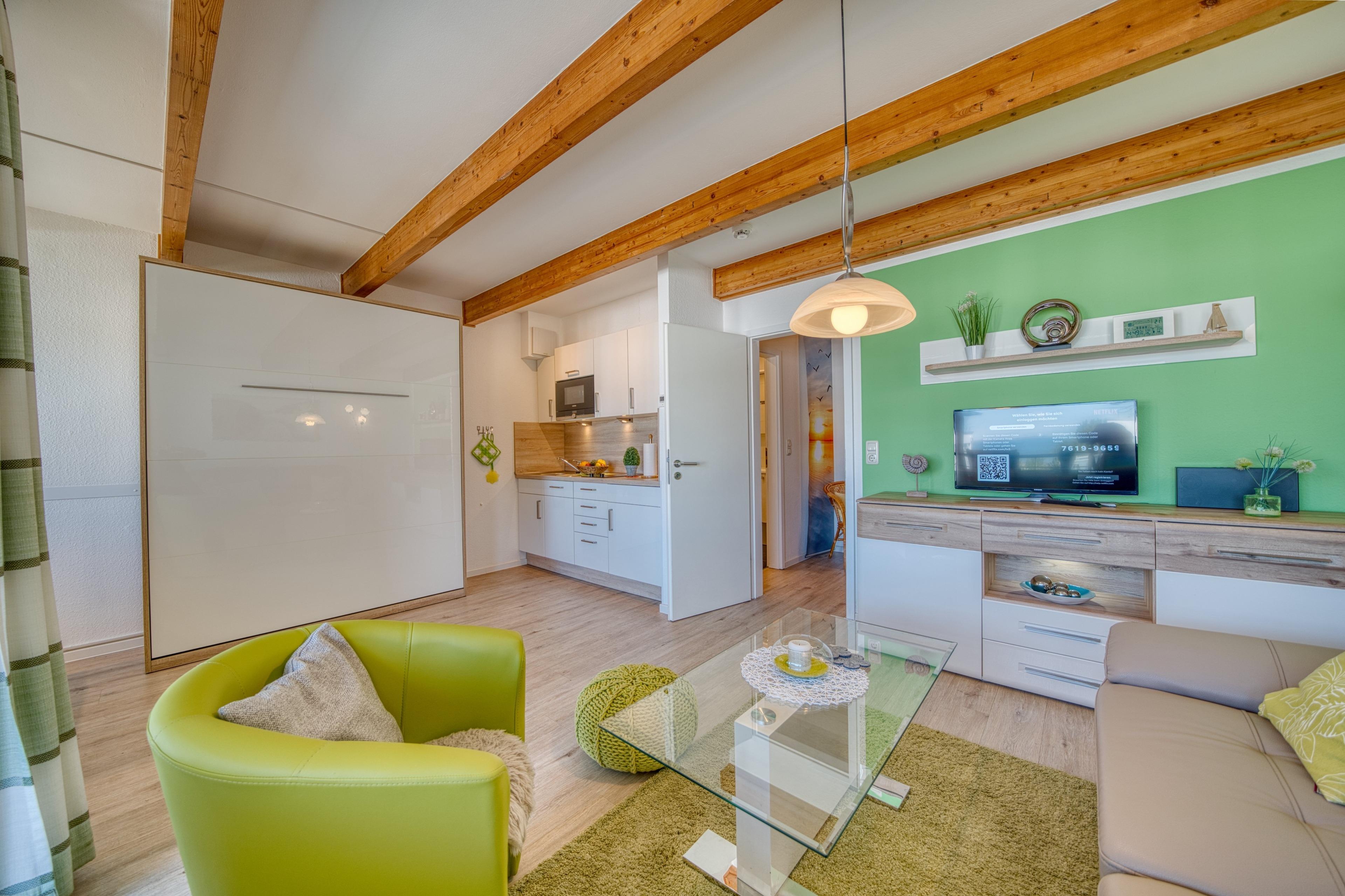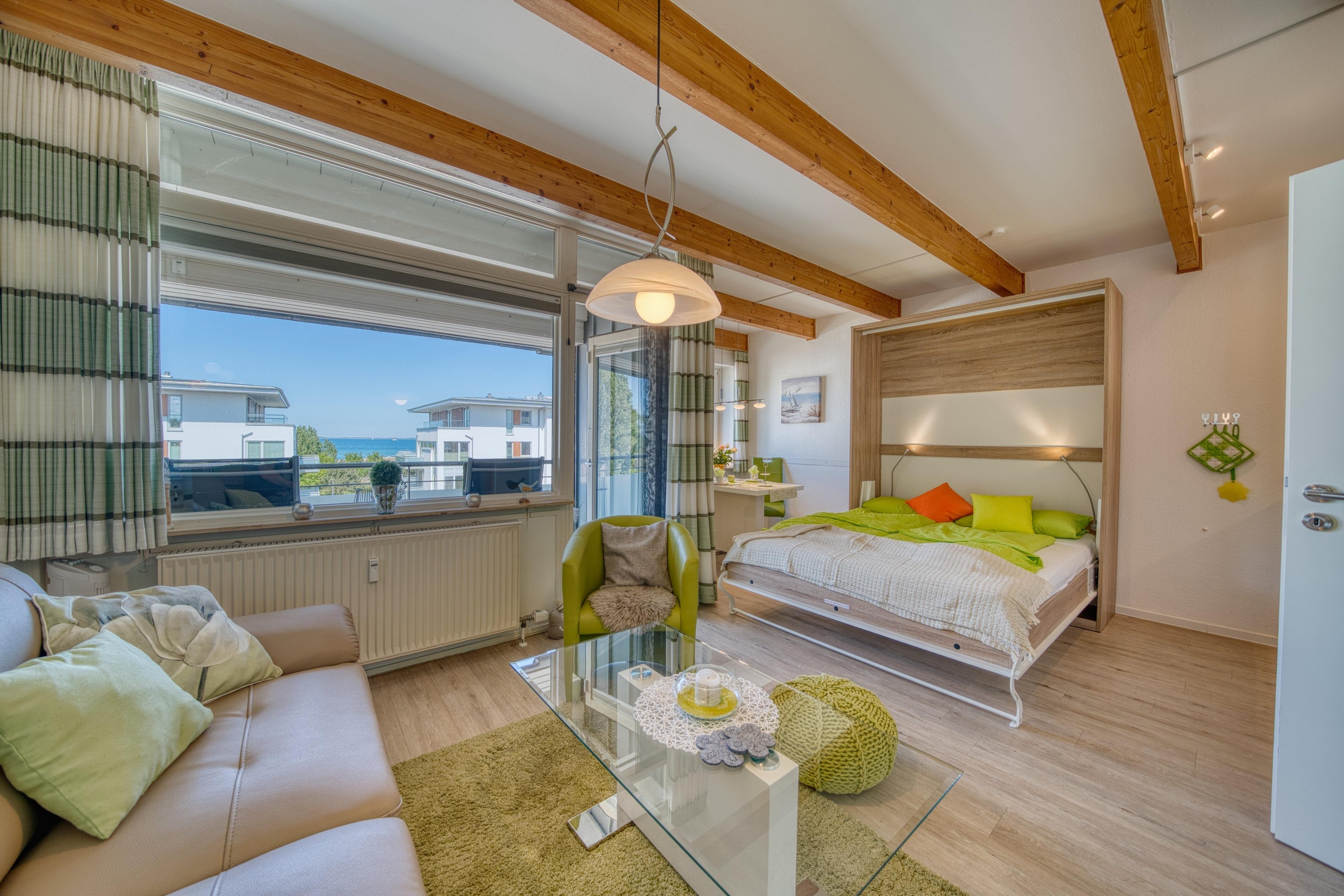 Die gemütliche Wohn-Schlafraum-Kombination mit Zugang zum Balkon mit Meerblick lädt zum Entspannen ein. Im modernen Badezimmer mit Duschkabine, WC und Waschbecken starten Sie erfrischt in den Tag. Die voll ausgestattete Küche verfügt über einen Geschirrspüler, einen Herd und eine Mikrowelle – perfekt für die Selbstverpflegung.