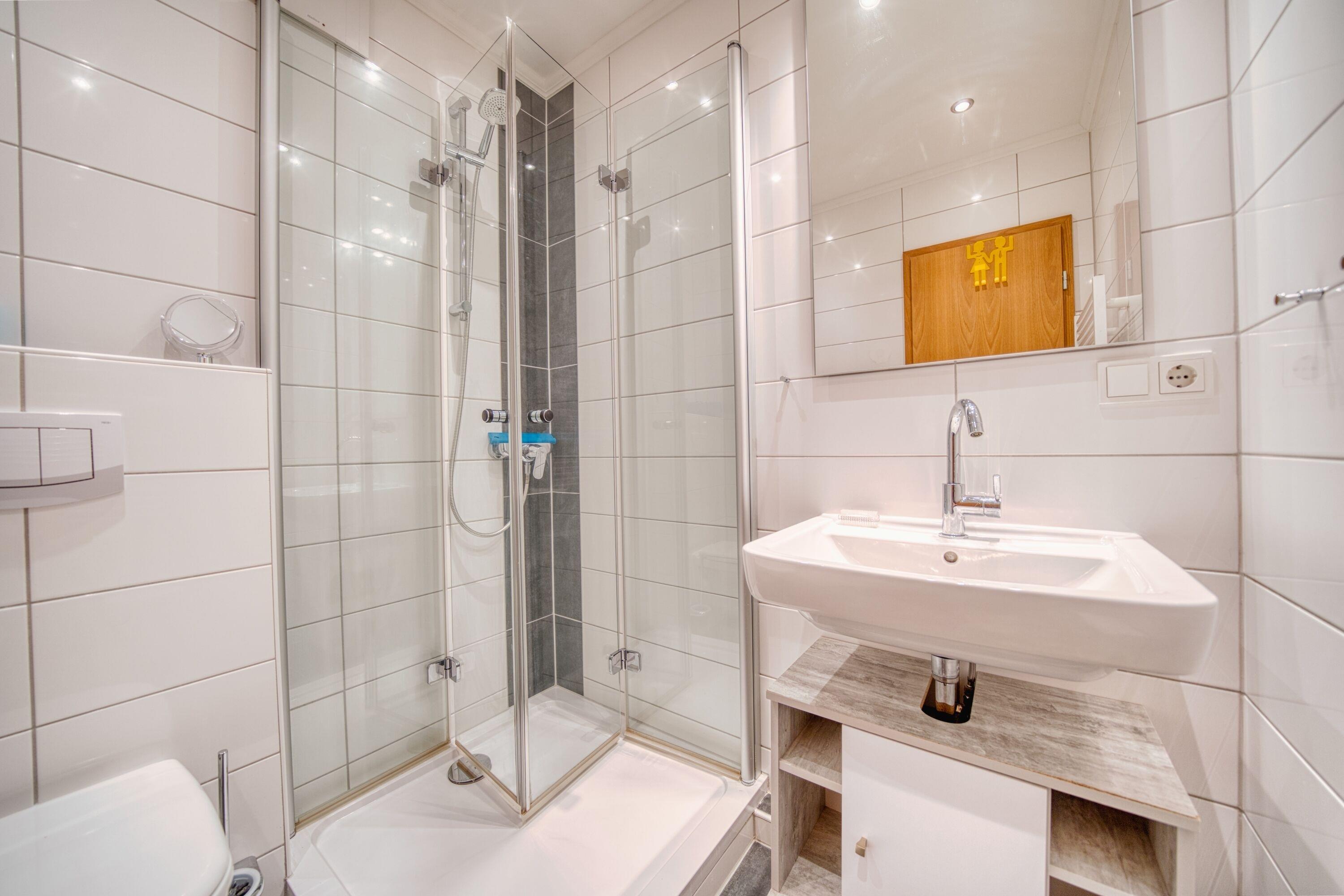 Ein gepflegtes und modernes Badezimmer mit Dusche, WC und Waschbecken