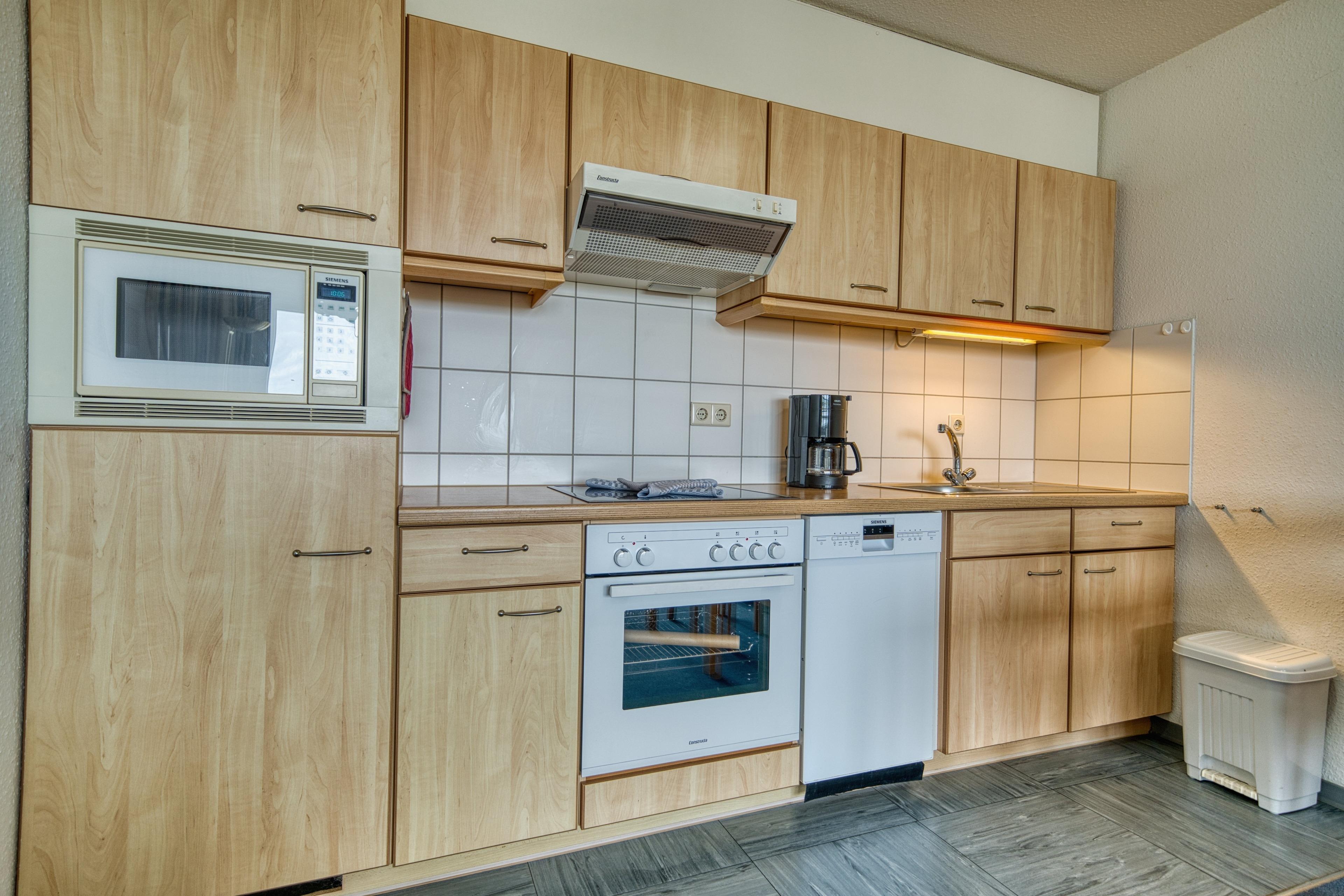 Küche mit Backofen, Kühlschrank mit Gefrierfach, Filterkaffeemaschine, Mikrowelle, Geschirrspüler und Ceranherd – alles, was Sie für Ihre Mahlzeiten benötigen