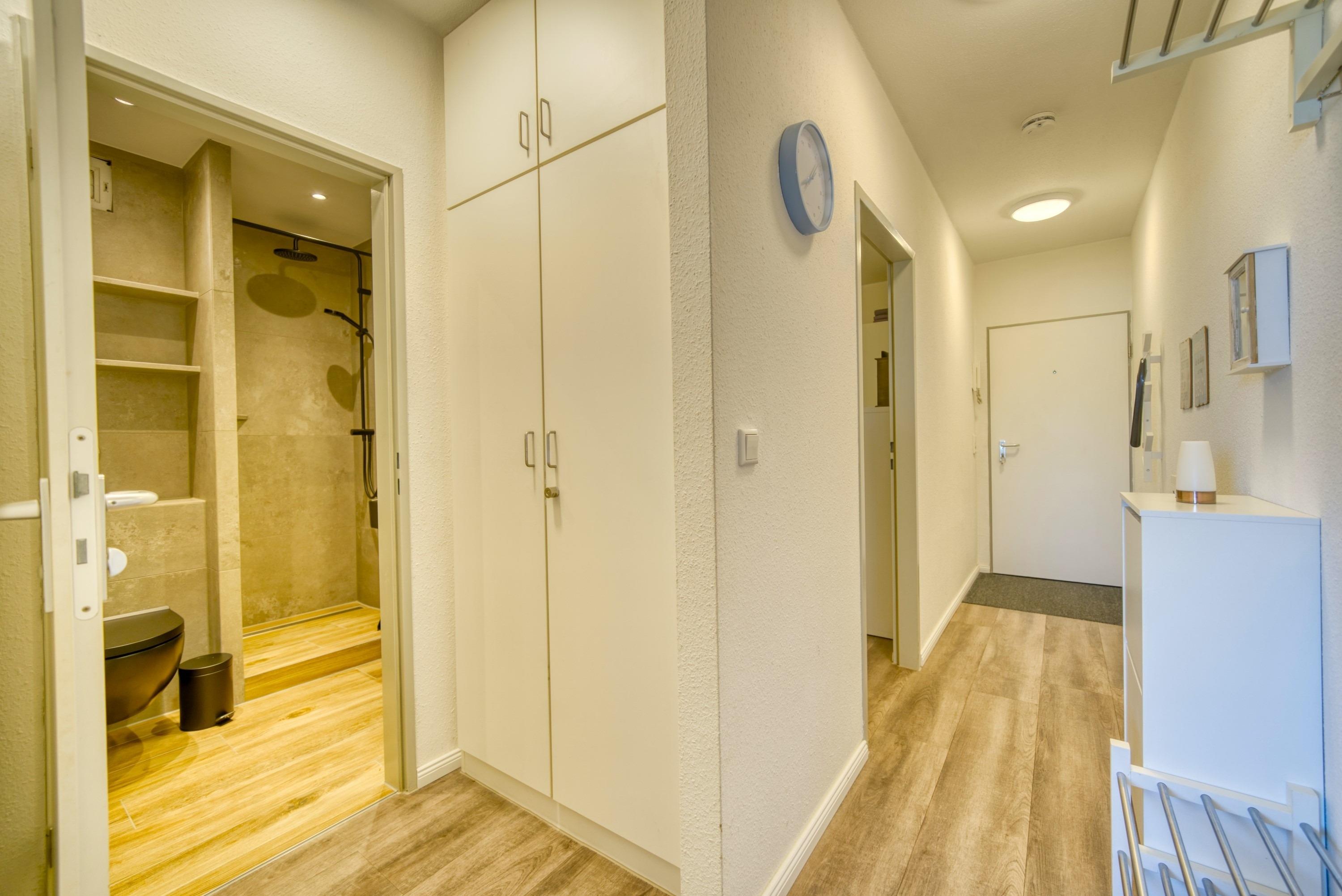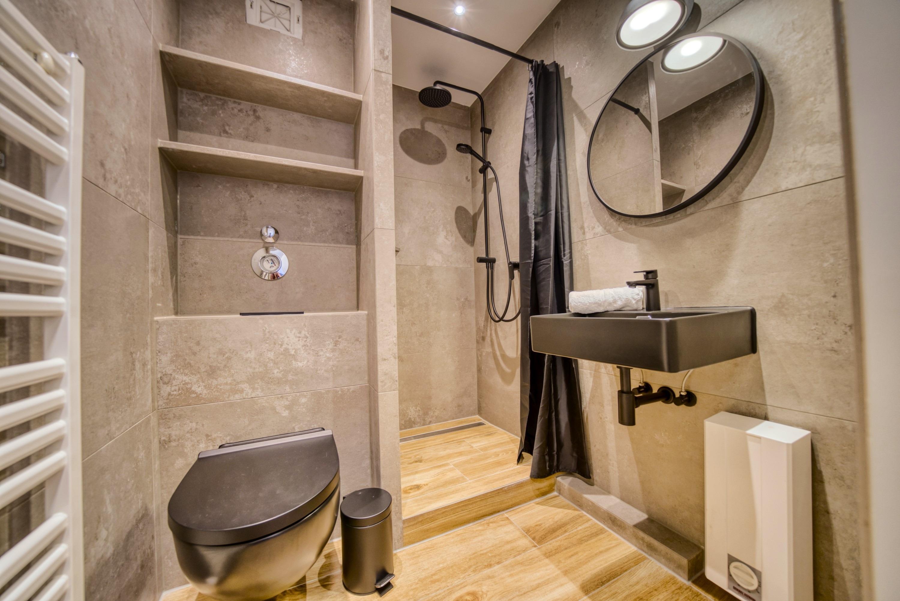 Badezimmer: Dusche (Kabine), WC, Handtuchhalter, Handtuchheizkörper, Fön
