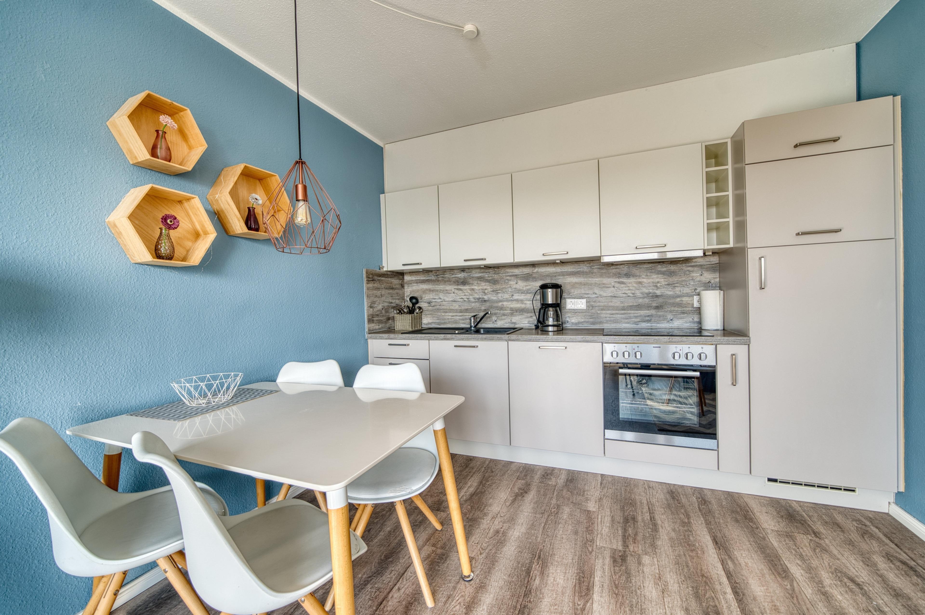 Küche: Geschirrspüler, Ceranfeld, Backofen, Mikrowelle, Filterkaffeemaschine, Wasserkocher