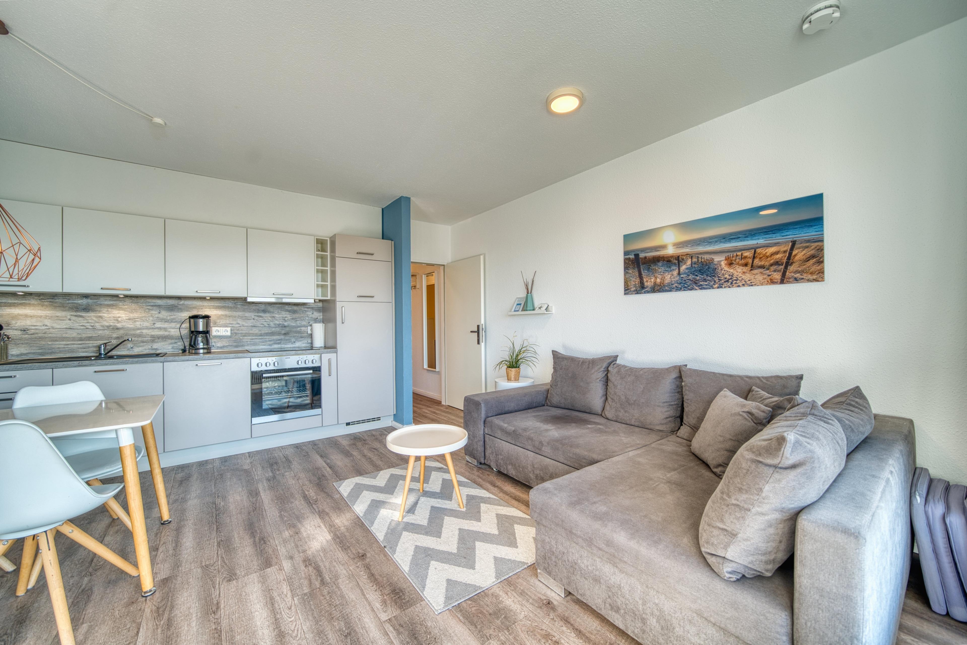 Wohnbereich: Helles Ecksofa, Flatscreen-TV, Radio mit Bluetooth-Funktion, Essbereich an der Küche