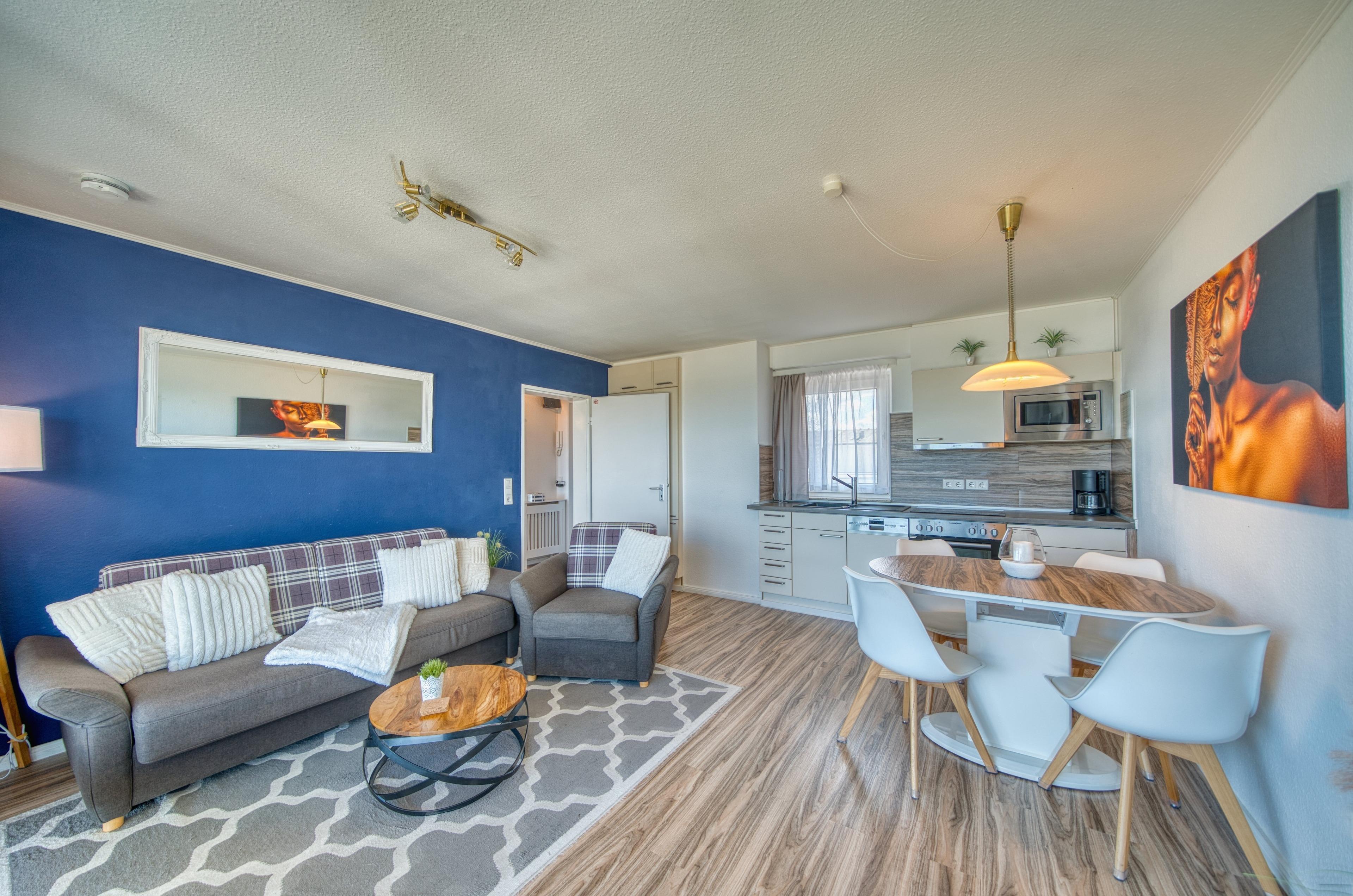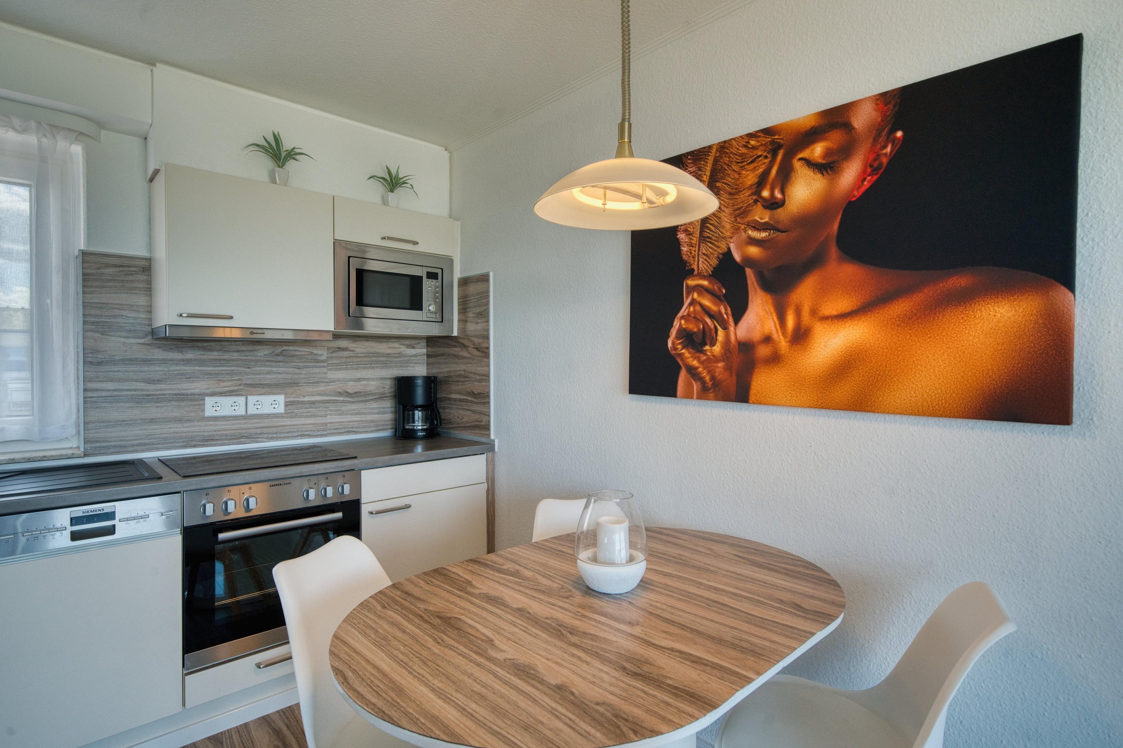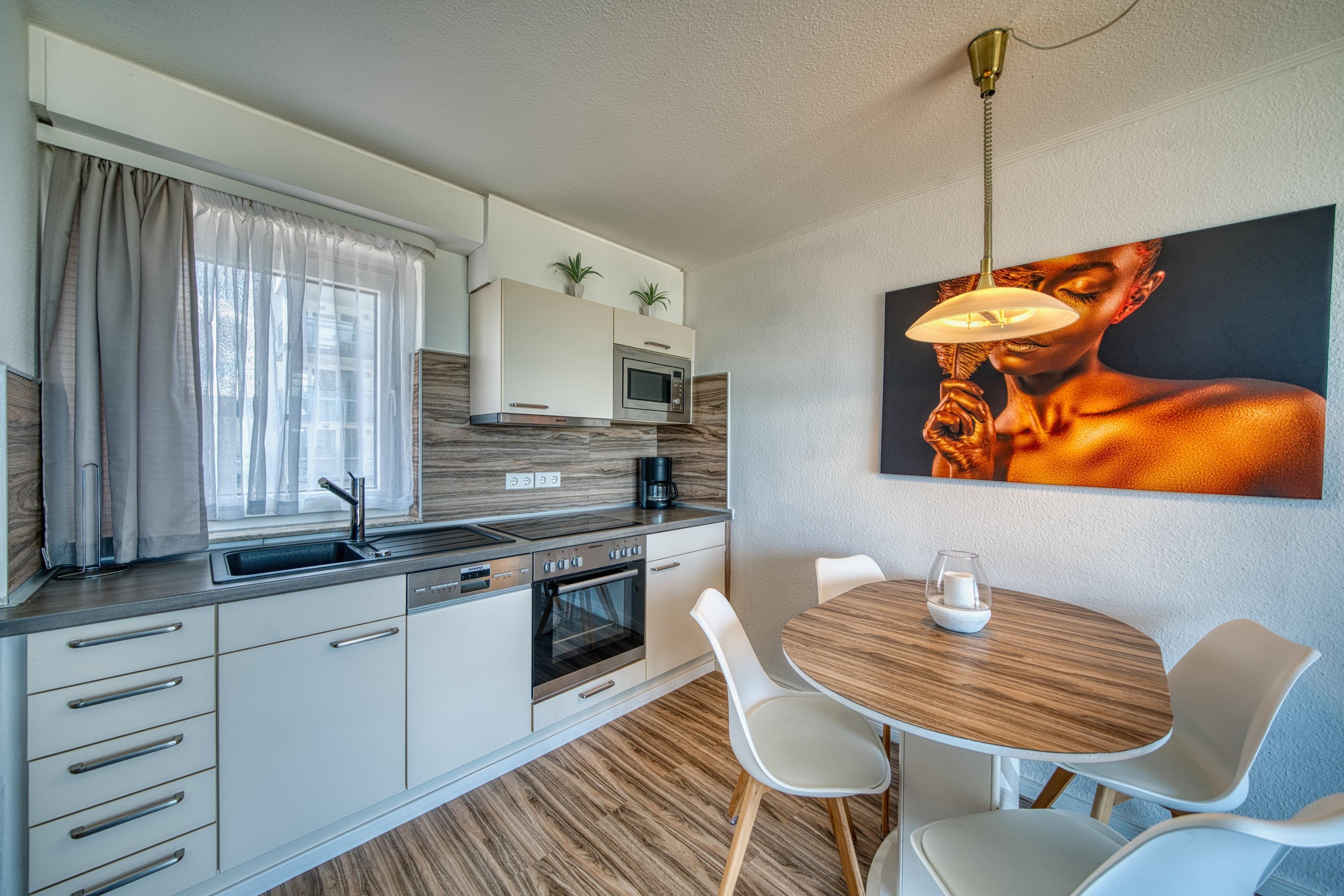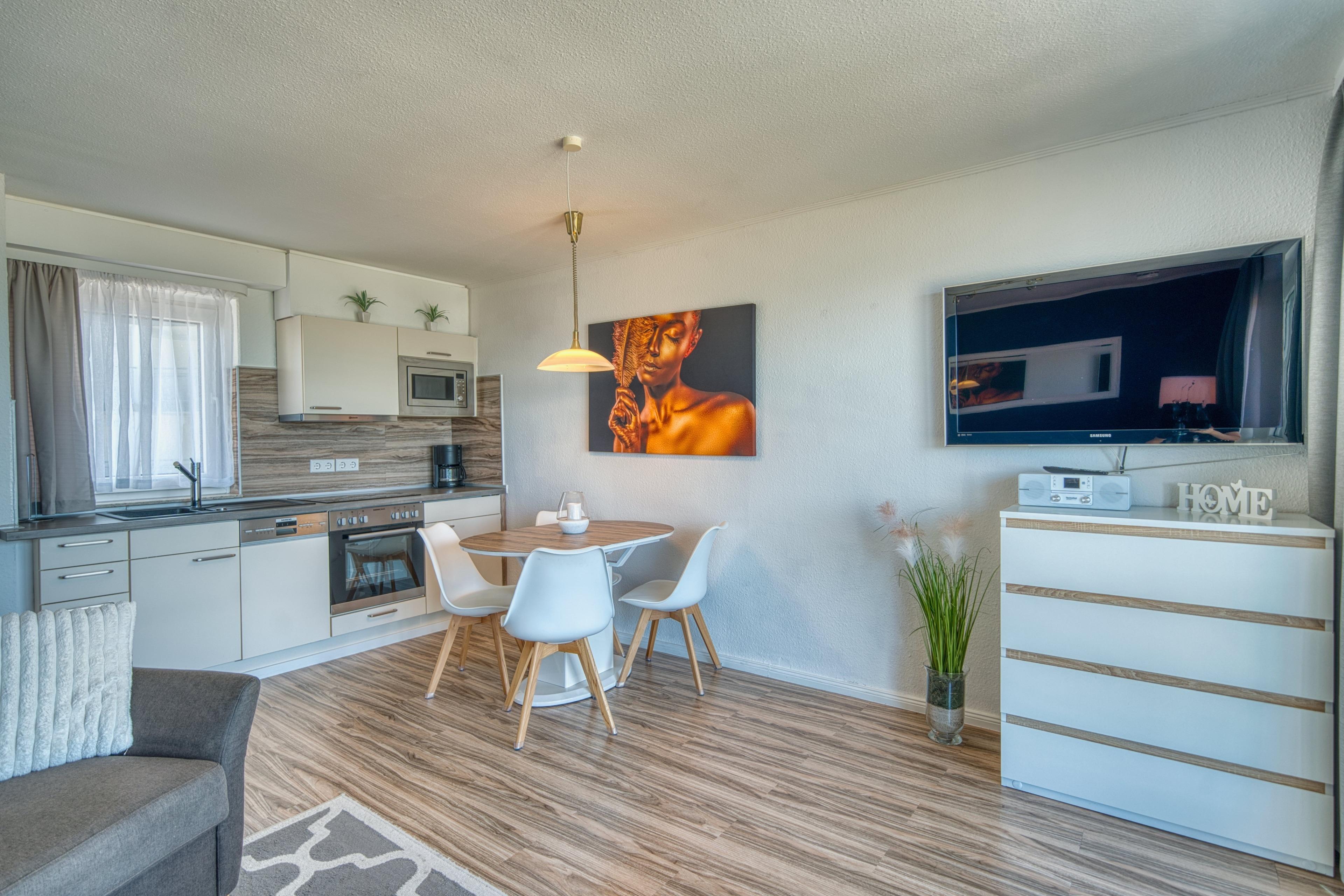 Die offene Küchenzeile ist vollständig ausgestattet mit Geschirrspüler, Cerankochfeld, Backofen und Mikrowelle – perfekt für Selbstversorger. Der angrenzende Essbereich wird schnell zum Mittelpunkt für gemeinsame Mahlzeiten und Urlaubsplanung.