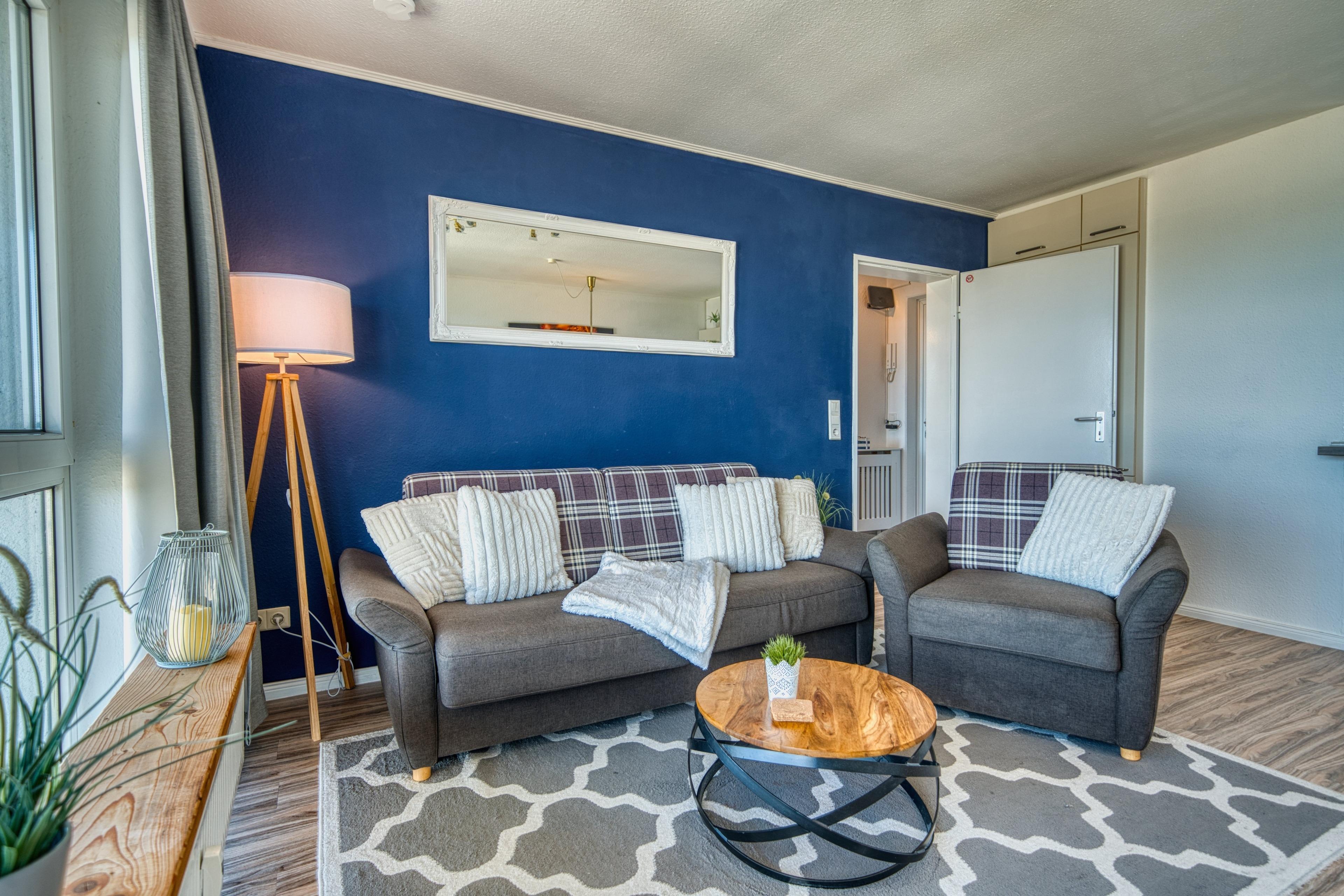 Der freundliche Wohnbereich mit großer Couch, WLAN, TV und Radio lädt zum Entspannen ein. Hochwertiger, pflegeleichter Bodenbelag sorgt dabei für ein angenehmes Wohngefühl.