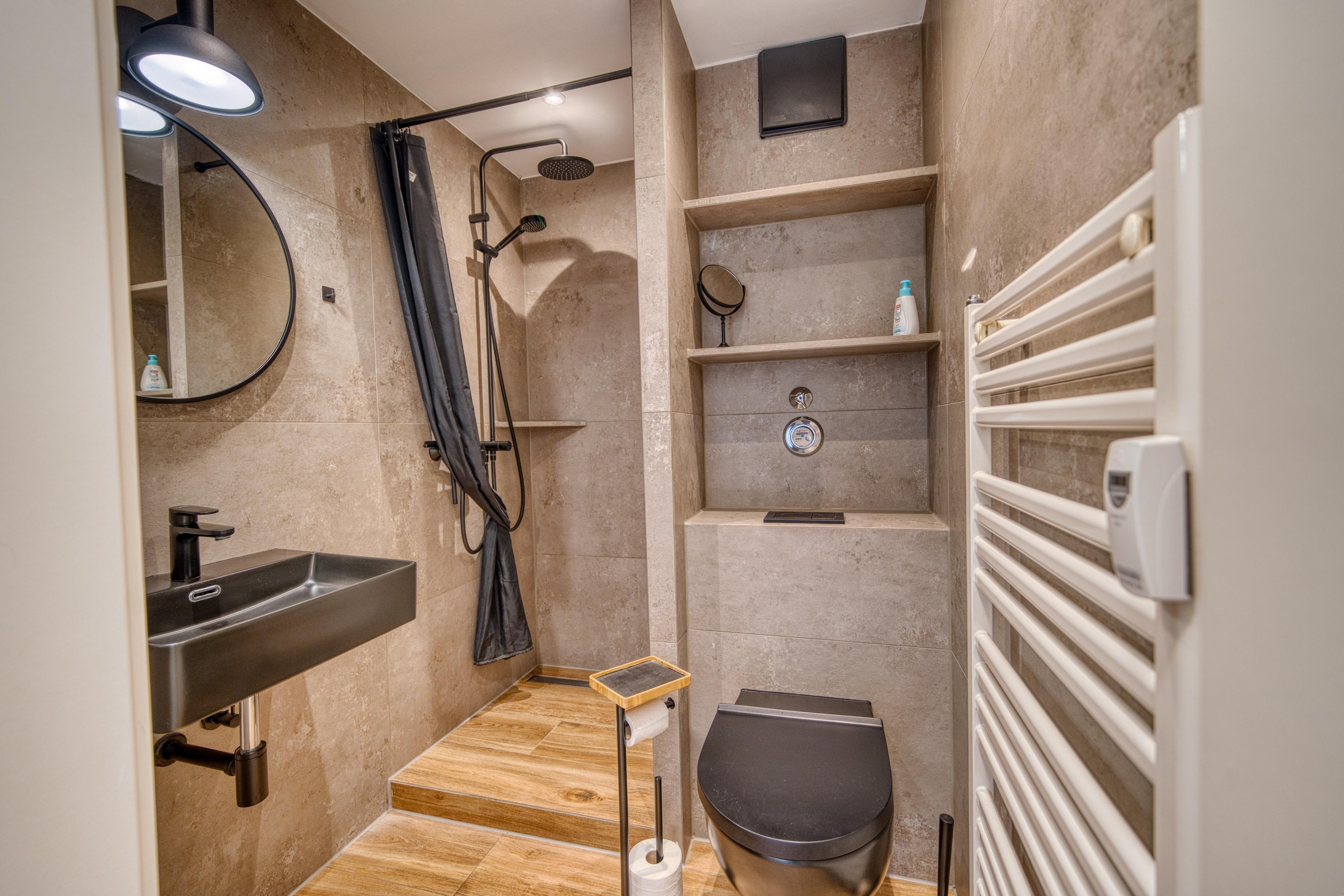 Badezimmer: Dusche (Kabine), WC, Handtuchhalter, Handtuchheizkörper und Fön
