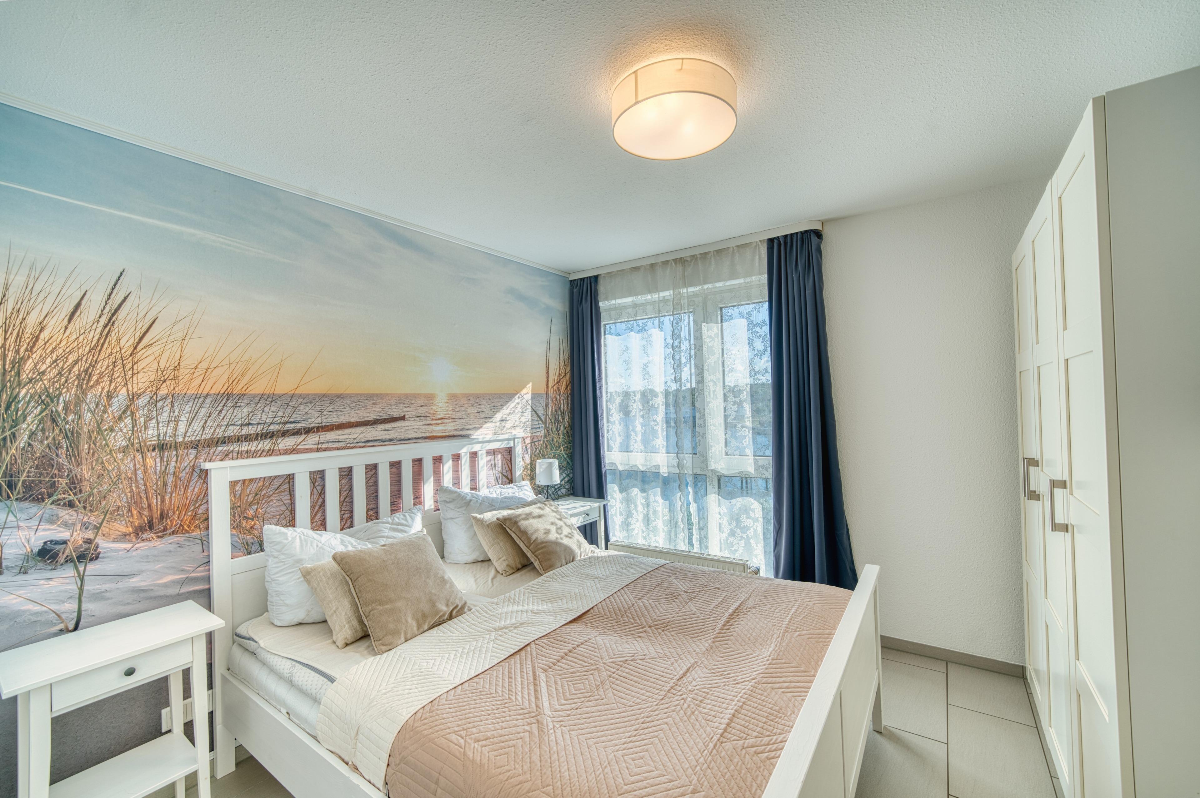 Schlafzimmer: Doppelbett (160x200 cm), zusätzlicher TV, Schrank [&] Kommode, Blick auf den Binnensee