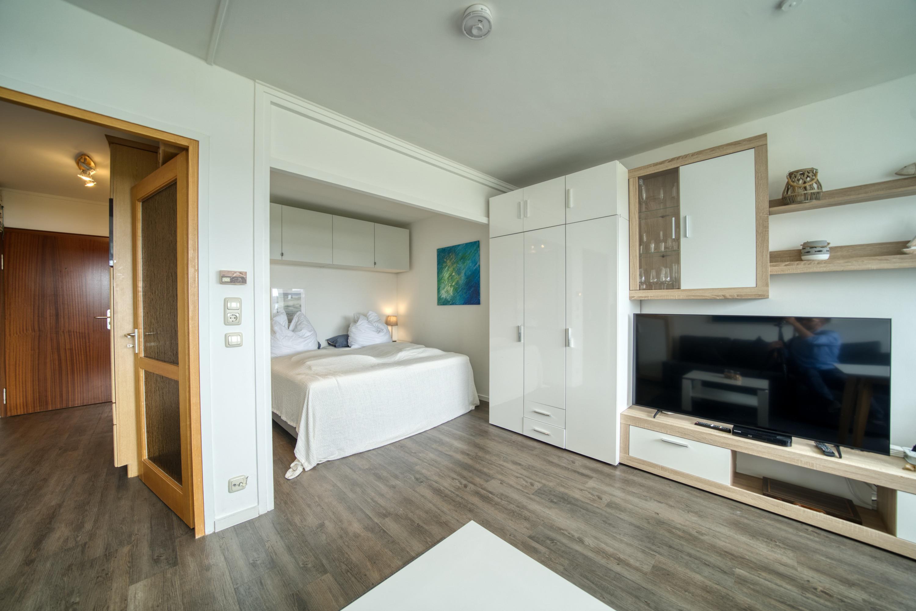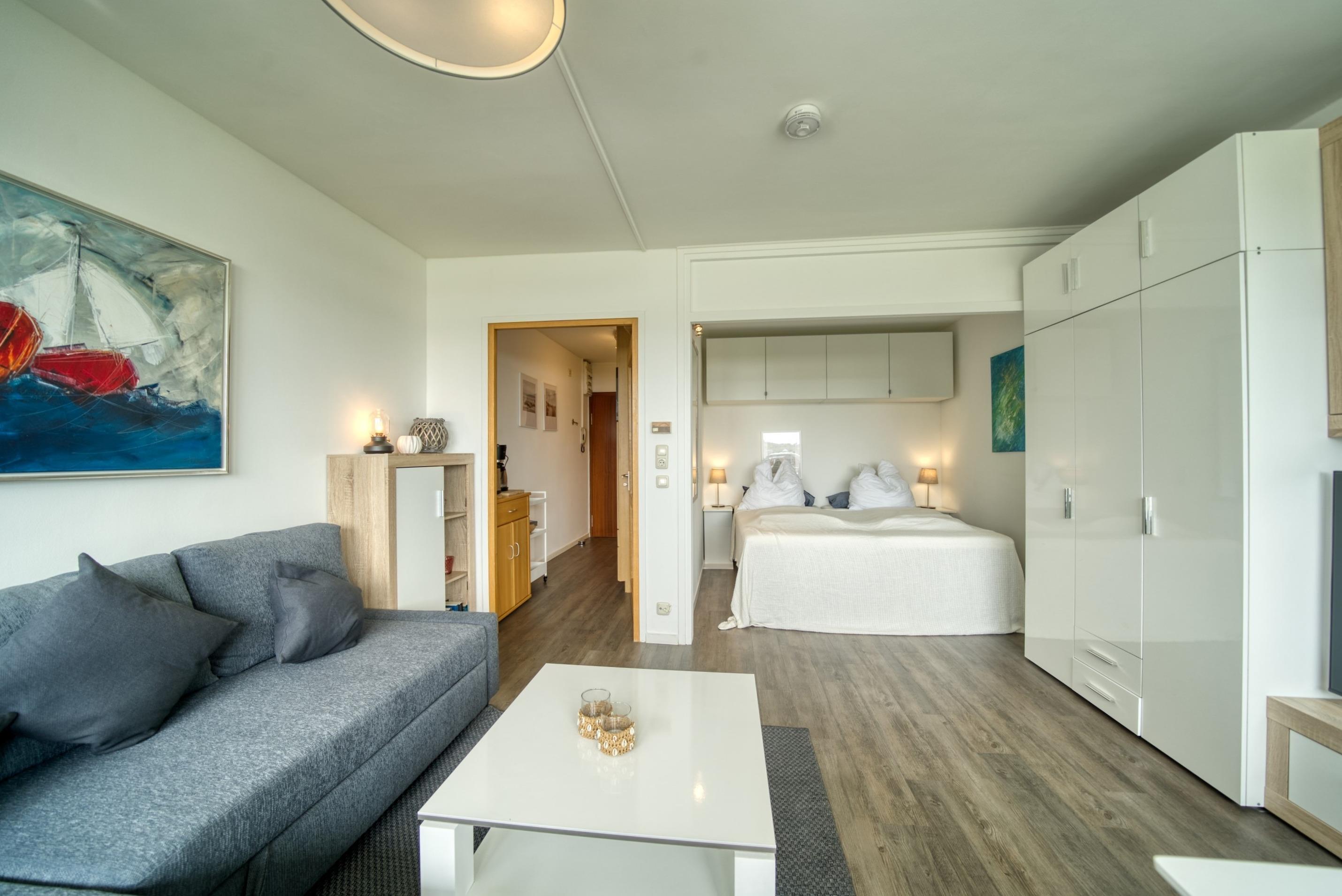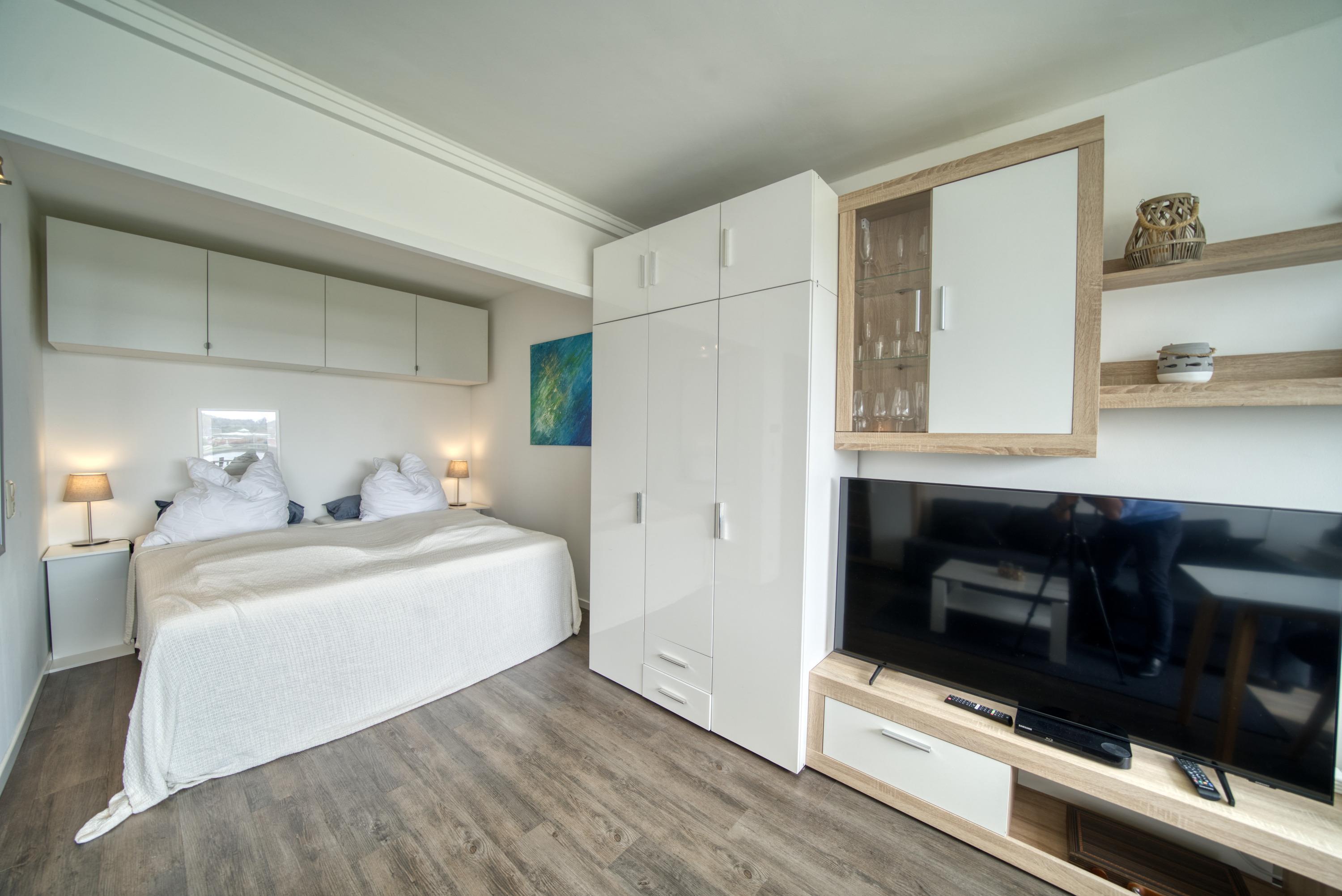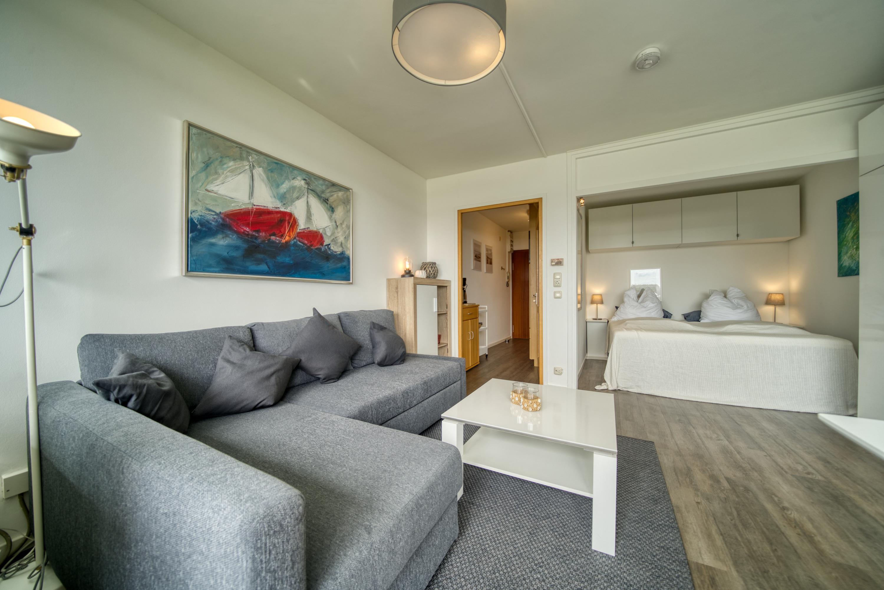 Wohn-/Schlafbereich: Couch, Doppelbett, Kabel-Flat-TV