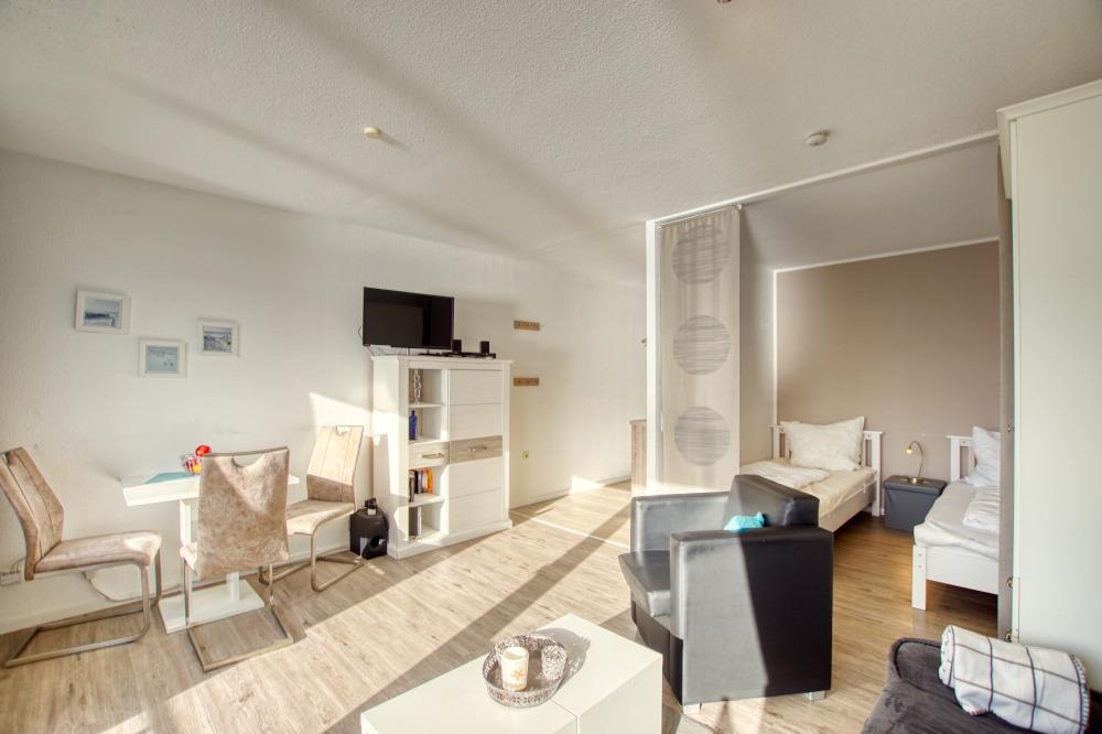 Wohn-Schlafzimmer mit zwei Einzelbetten, Sofa und Flachbild-TV