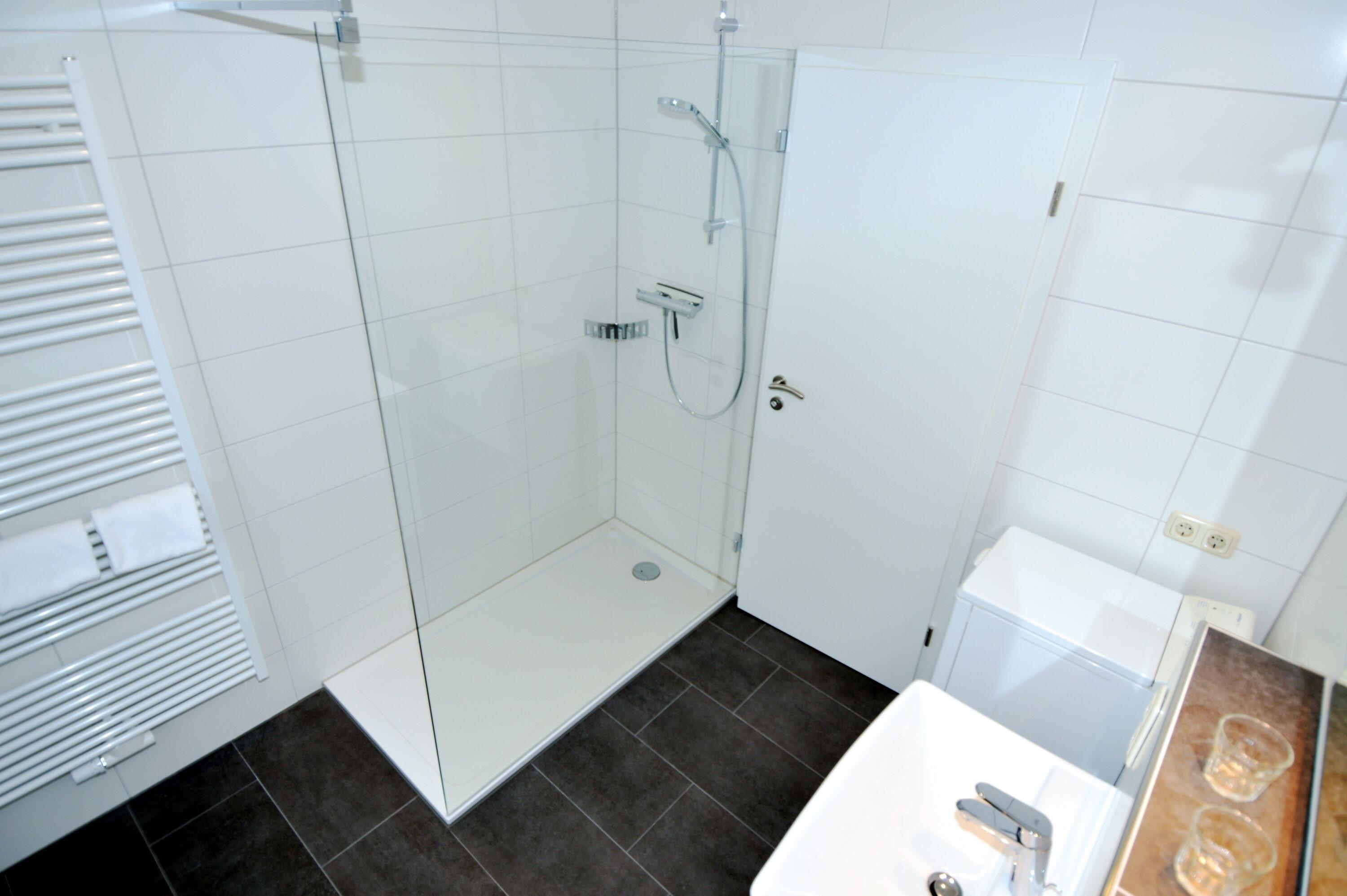 Das separate Schlafzimmer ist mit einem komfortablen Doppelbett, einem Kleiderschrank und einem TV ausgestattet. Das große Tageslicht-Bad verfügt über eine Waschmaschine, ein WC und eine ebenerdige Dusche.