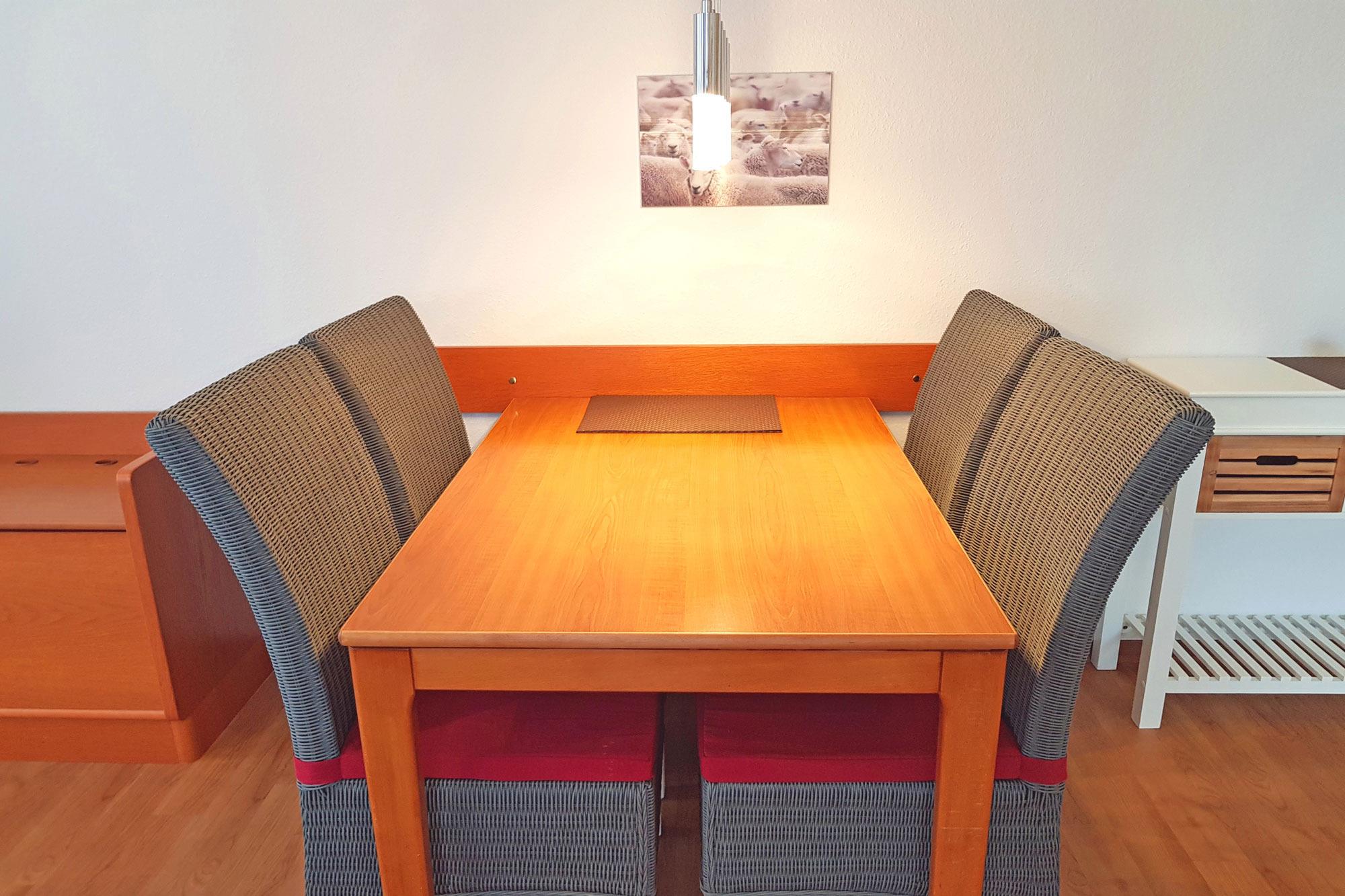 Das Apartment 1 im Erdgeschoss bietet auf etwa 45 Quadratmetern genügend Platz für bis zu vier Personen. Das gemütliche Schlafzimmer mit Doppelbett und großem Kleiderschrank sorgt für erholsamen Schlaf, während die großzügige Schlafcouch im Wohnbereich zwei weitere Schlafmöglichkeiten bietet.
