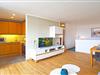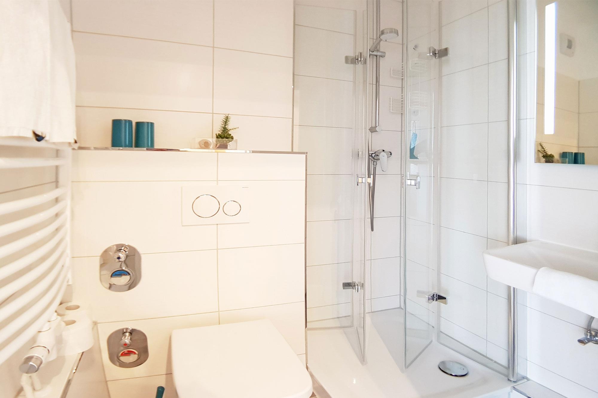 Nah am Wohnbereich ist die kleine, aber gut ausgestattete Küche (mit Backofen und Mikrowelle), mit allem Notwendigen versehen. Damit steht dem kulinarischen Genuss während Ihres Aufenthaltes nichts im Wege. Der Essbereich ist nur wenige Schritte entfernt und zentraler Treffpunkt für die Urlaubsplanung. Das Badezimmer bietet mit ebenerdiger Dusche, Handtuchwärmer, WC und Fön die Räumlichkeit um sich nach einem ereignisreichen Tag aufzufrischen.