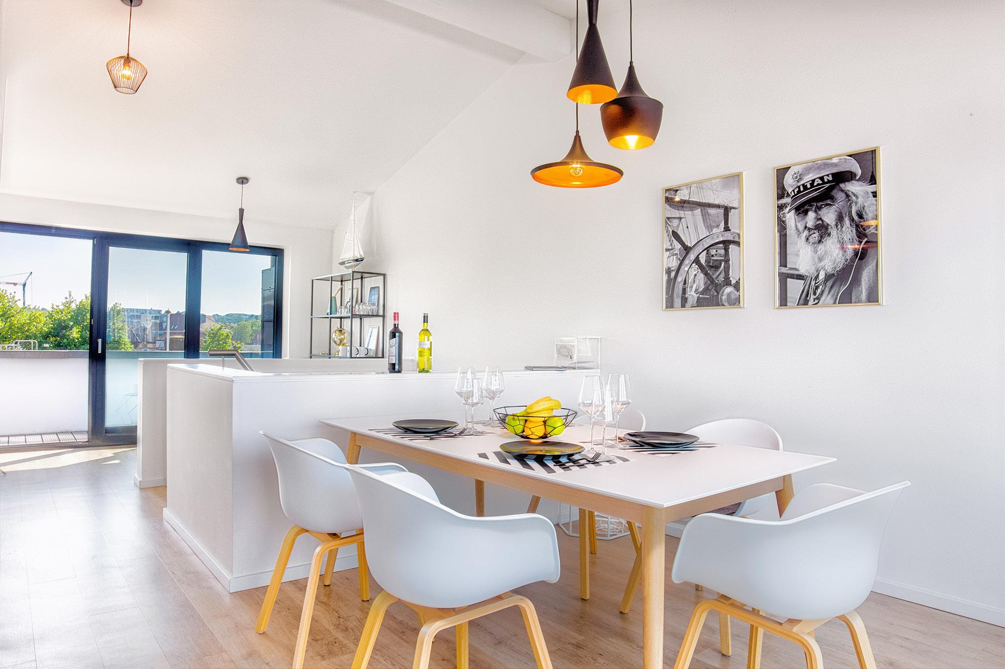 Der offene Wohn- und Essbereich schafft mit großen Fensterfronten eine einzigartige Atmosphäre und bietet Ihnen nicht nur viel Platz zum Verweilen, sondern auch eine erstklassige Aussicht auf den Hafen. Direkt angrenzend befindet sich die voll ausgestattete Küche mit modernen Geräten, in der Sie kulinarische Köstlichkeiten zaubern können. Genießen Sie Ihre Mahlzeiten am stilvollen Esstisch oder lassen Sie sich auf einer der beiden möblierten Dachterrassen nieder. Während die Südterrasse tagsüber sonnige Stunden verspricht, lädt die Nordterrasse am Abend zu einem Glas Wein bei traumhaftem Sonnenuntergang ein. Ein Elektro-Grill steht Ihnen für gesellige Barbecue-Abende zur Verfügung.