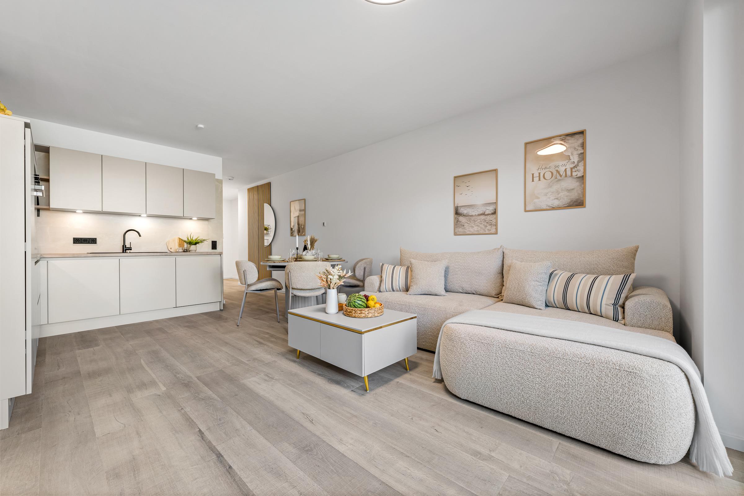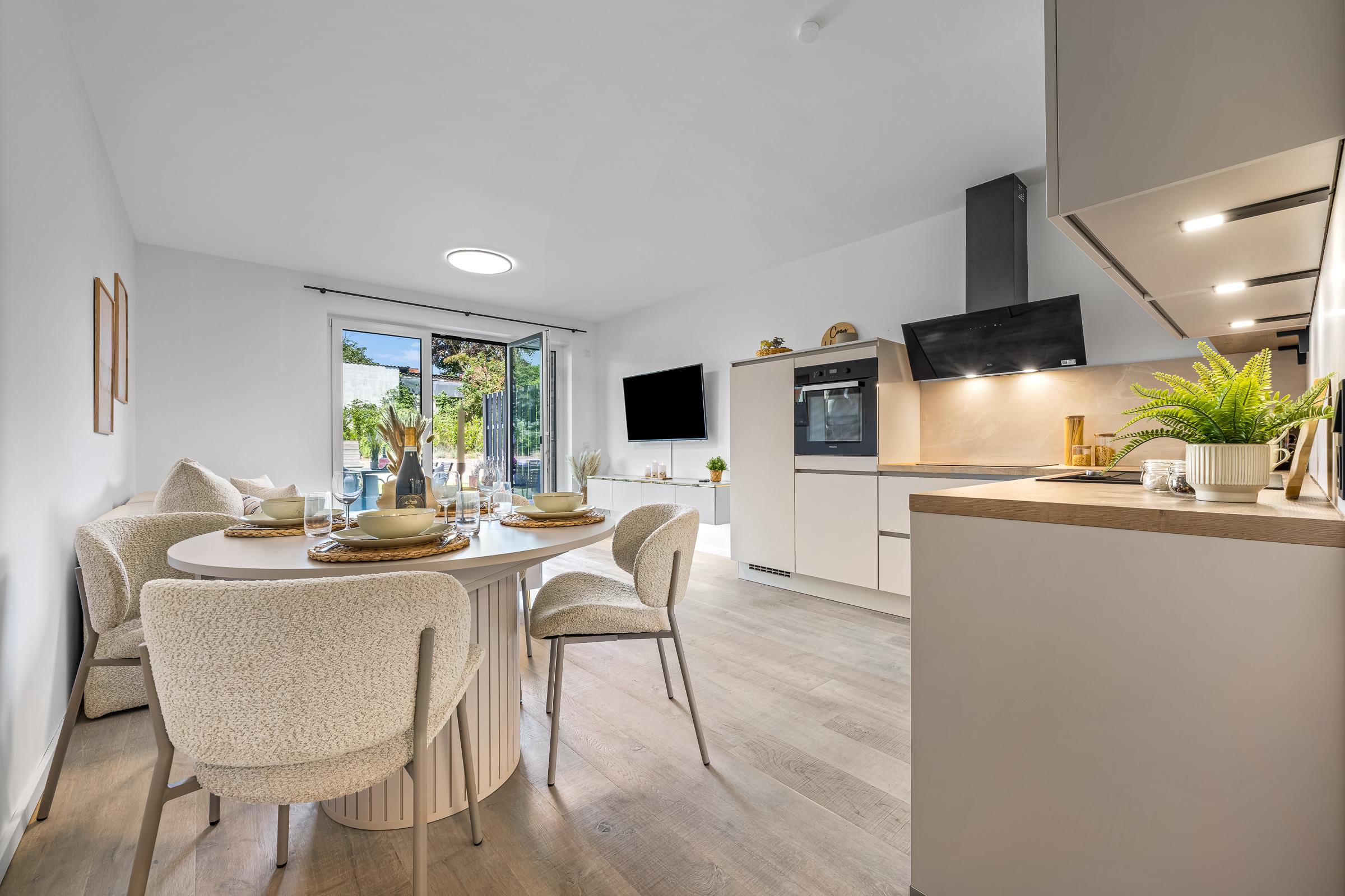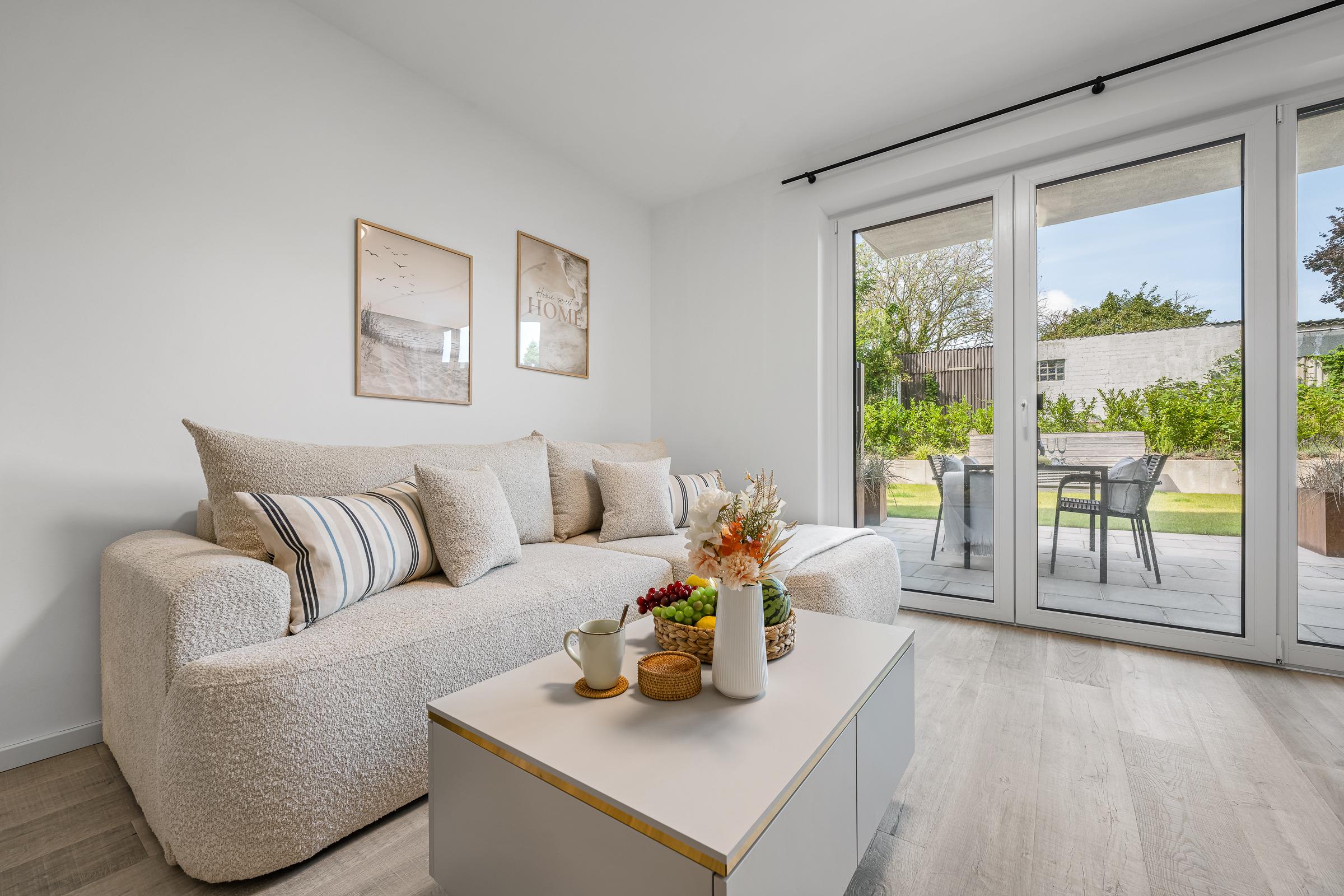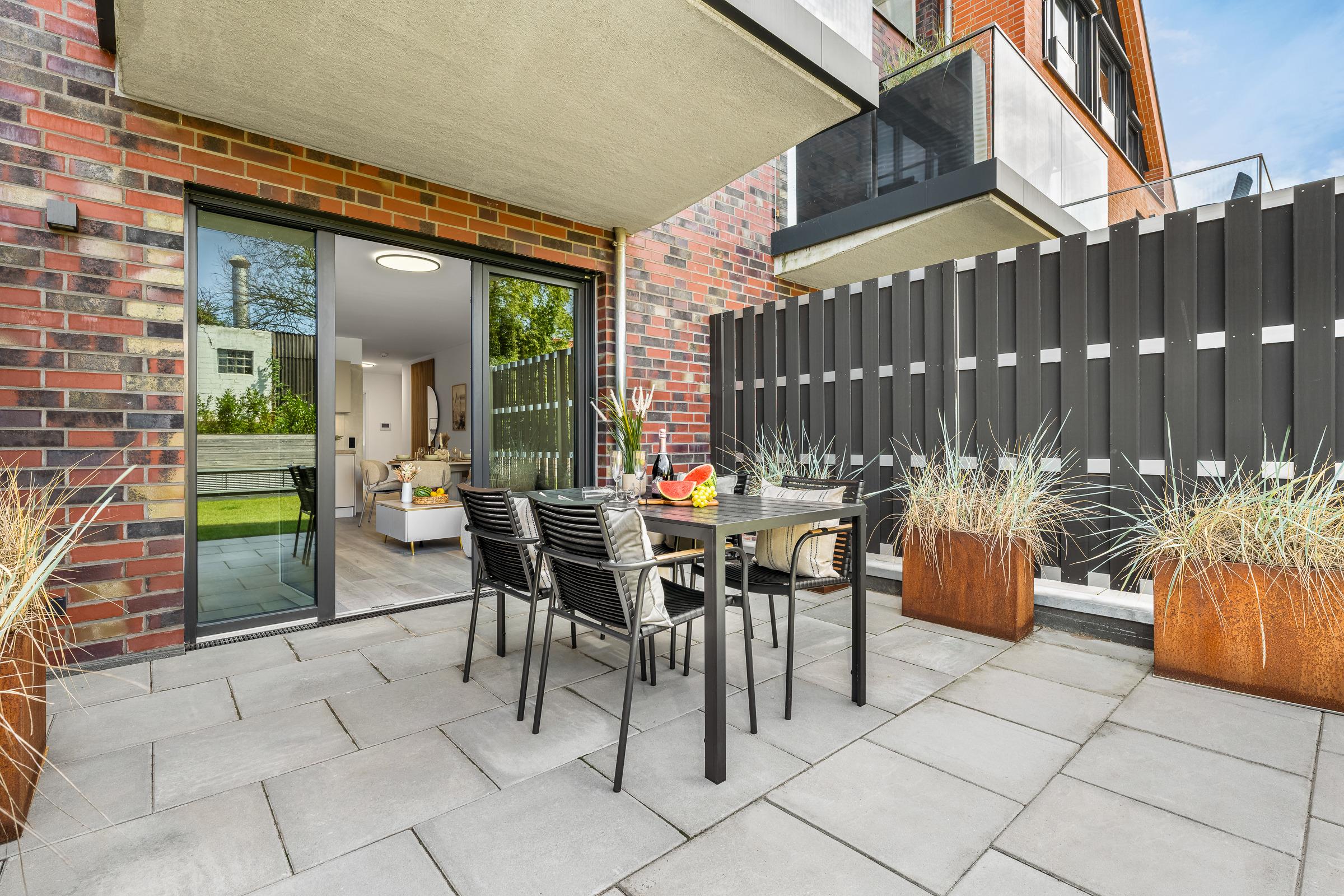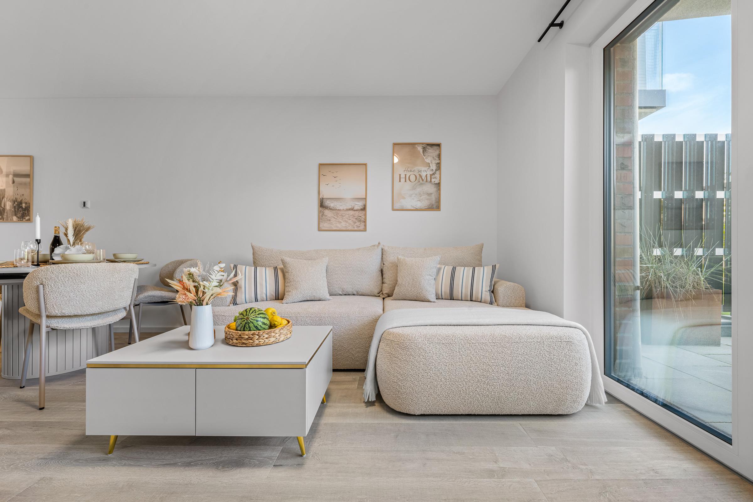 Zu den weiteren Ausstattungsmerkmalen gehören eine möblierte Terrasse und ein gemeinschaftlich nutzbarer, offener Gartenbereich. Die Terrasse der Wohnung schließt direkt an den Wohnbereich an. Diese lädt dazu ein, den Tag mit einer Tasse Kaffee an der frischen Seeluft zu beginnen oder laue Sommerabende entspannt ausklingen zu lassen.