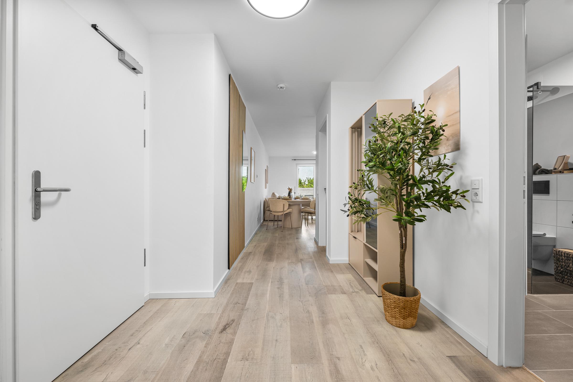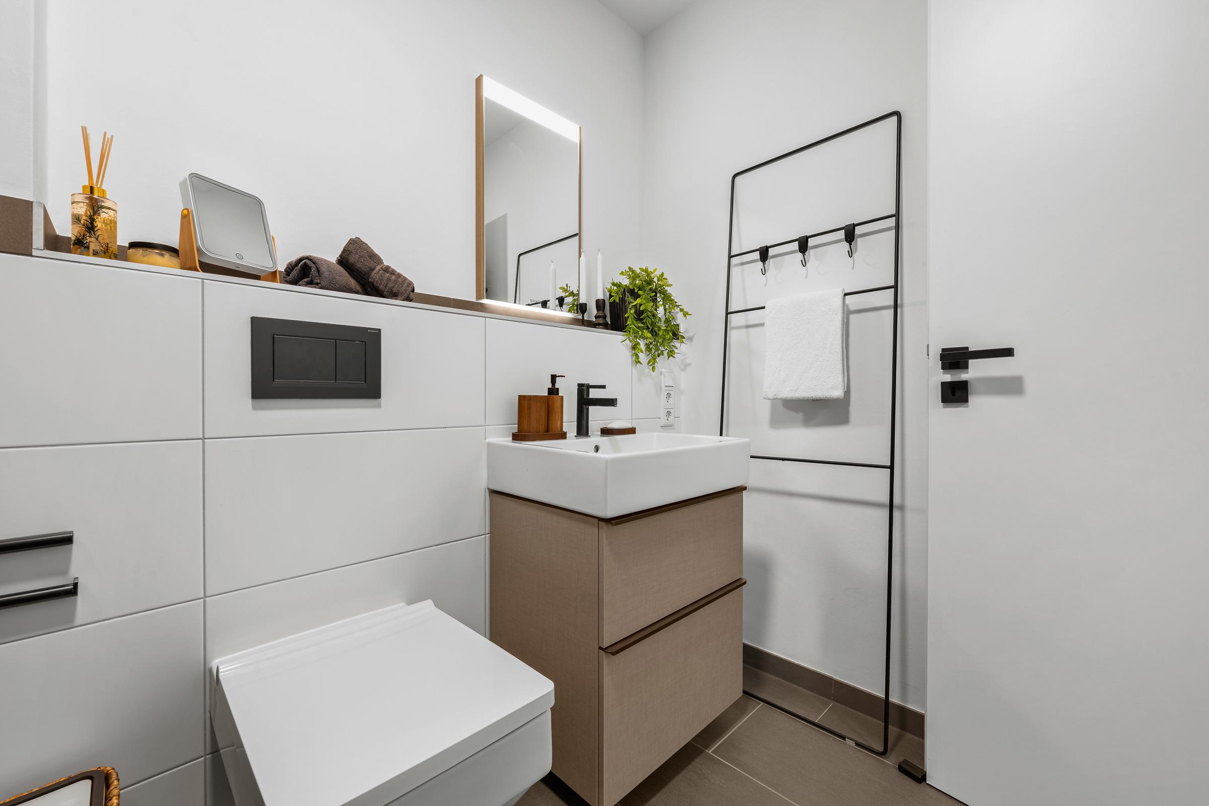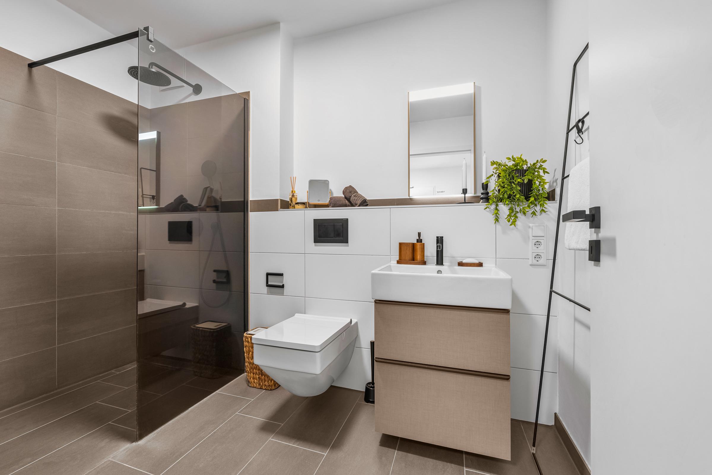 Das gut geschnittene, moderne Duschbad direkt neben dem Schlafzimmer sorgt für weitere Bequemlichkeit. Die ebenerdige Dusche, WC, Waschbecken, Spiegel und ein Handtuchwärmer runden den Raum ab.