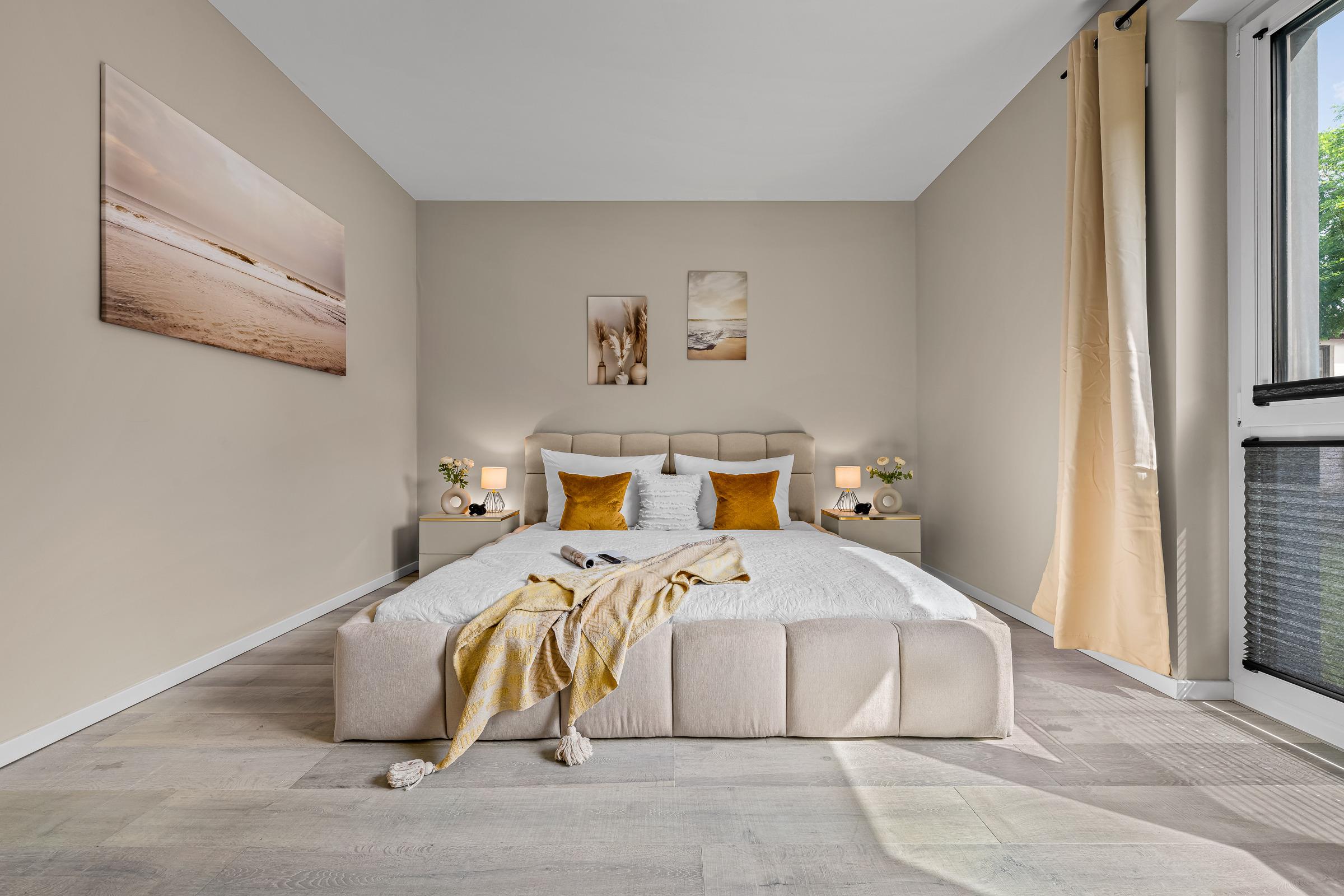 Ebenso komfortabel geht es im Schlafzimmer der Wohnung weiter. Hier erwartet Sie ein einladendes Doppelbett (180x200) und ein großer Kleiderschrank. Für Verdunklung sorgen Plissees und Vorhänge. Ein Insektengitter schützt Sie hier vor nächtlichen Plagegeistern.
