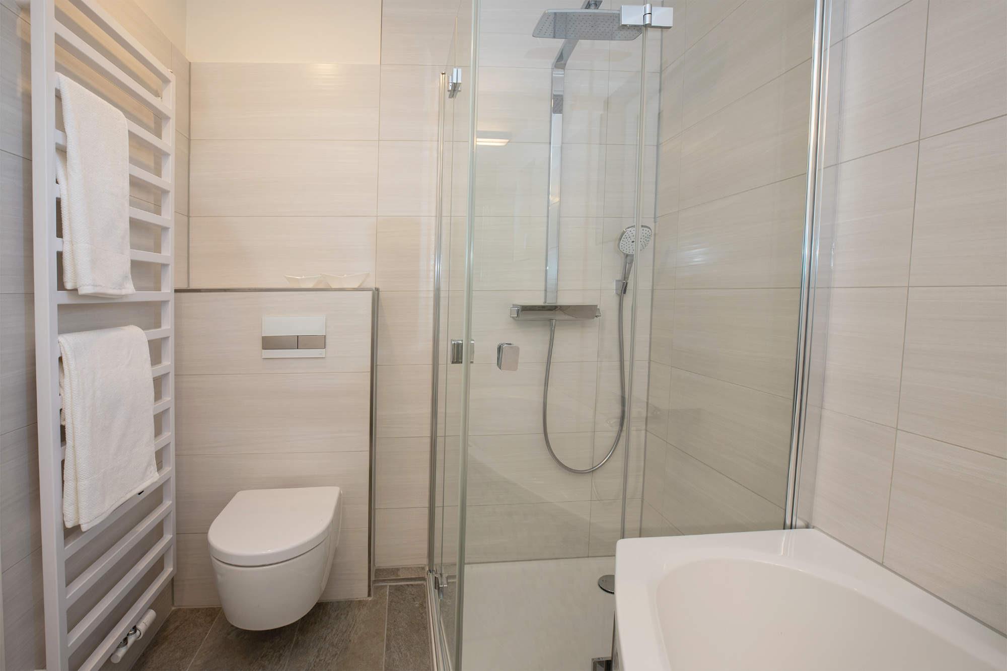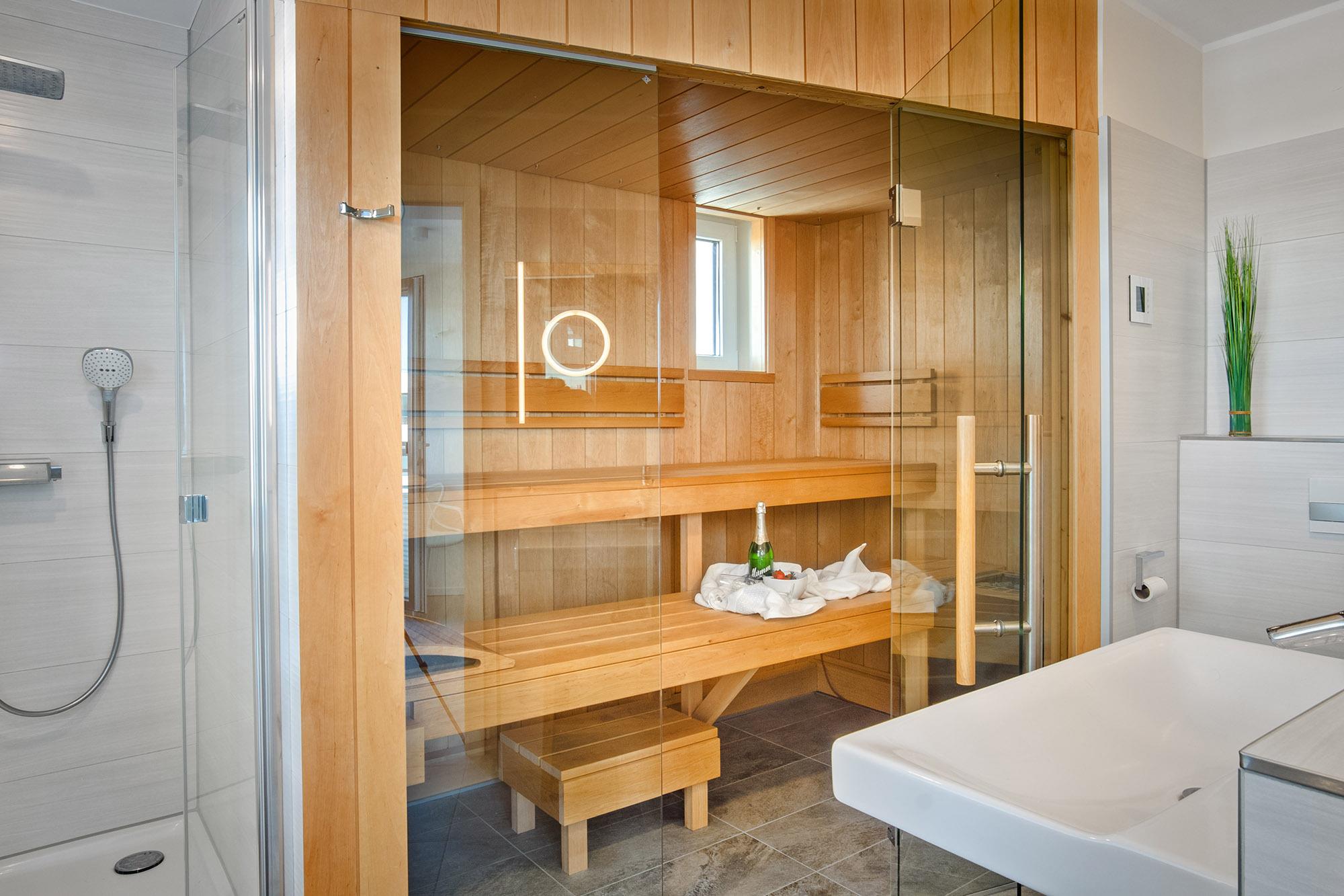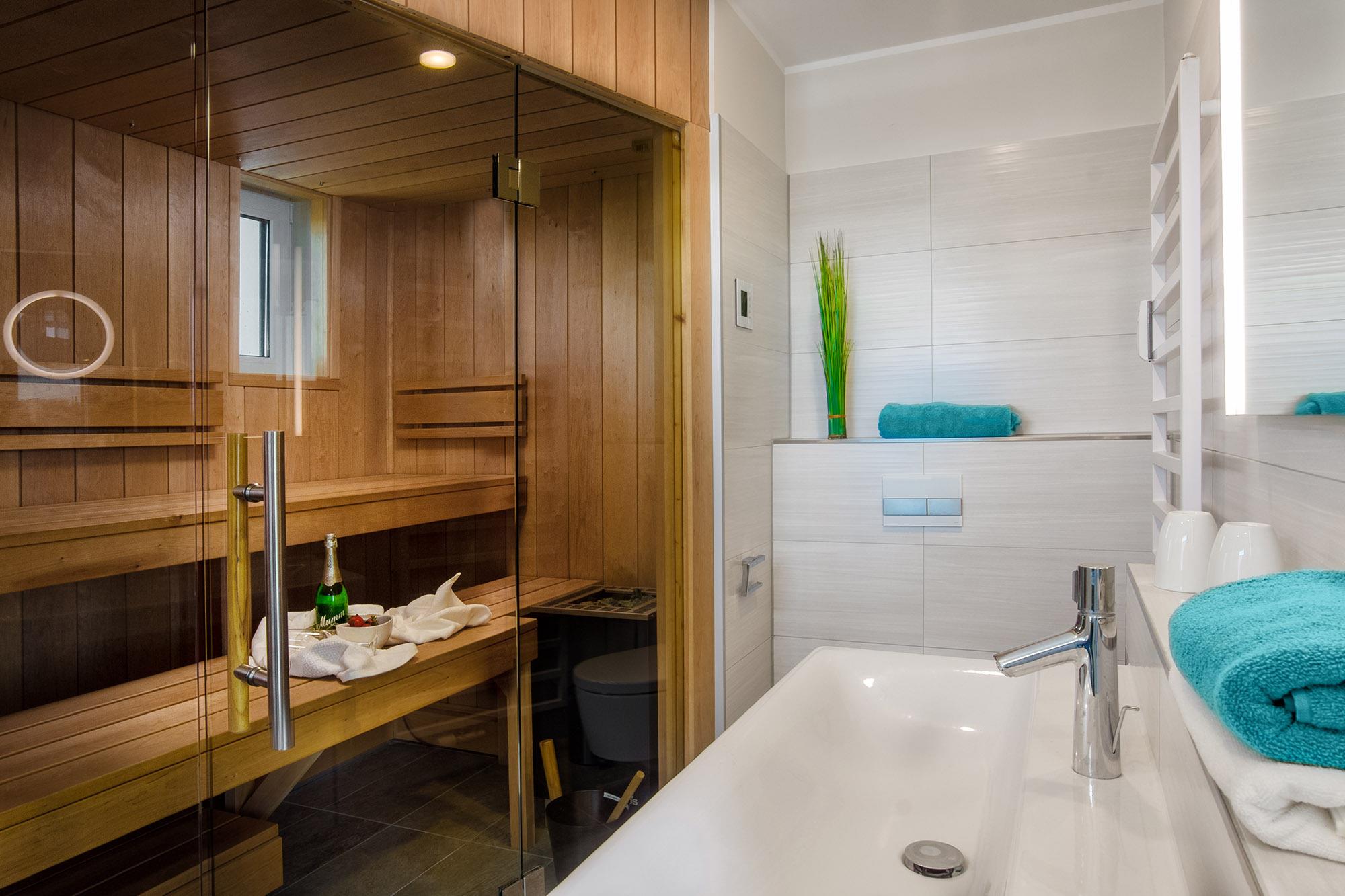 Die Wellness-Bäder, eines mit eigener Sauna und von einem Schlafzimmer direkt erreichbar, laden auch an grauen und kalten Tagen zur Entspannung ein. Handtuchwärmer, große Dusche oder Wanne sorgen für extra Annehmlichkeit. Eine Waschmaschine + Trockner (Münznutzung) stehen zudem im Erdgeschoss des Hauses zur Nutzung bereit. Als Besonderheit hierbei sei das kleine Fenster der Sauna, mit direktem Blick auf die Ostsee, genannt.