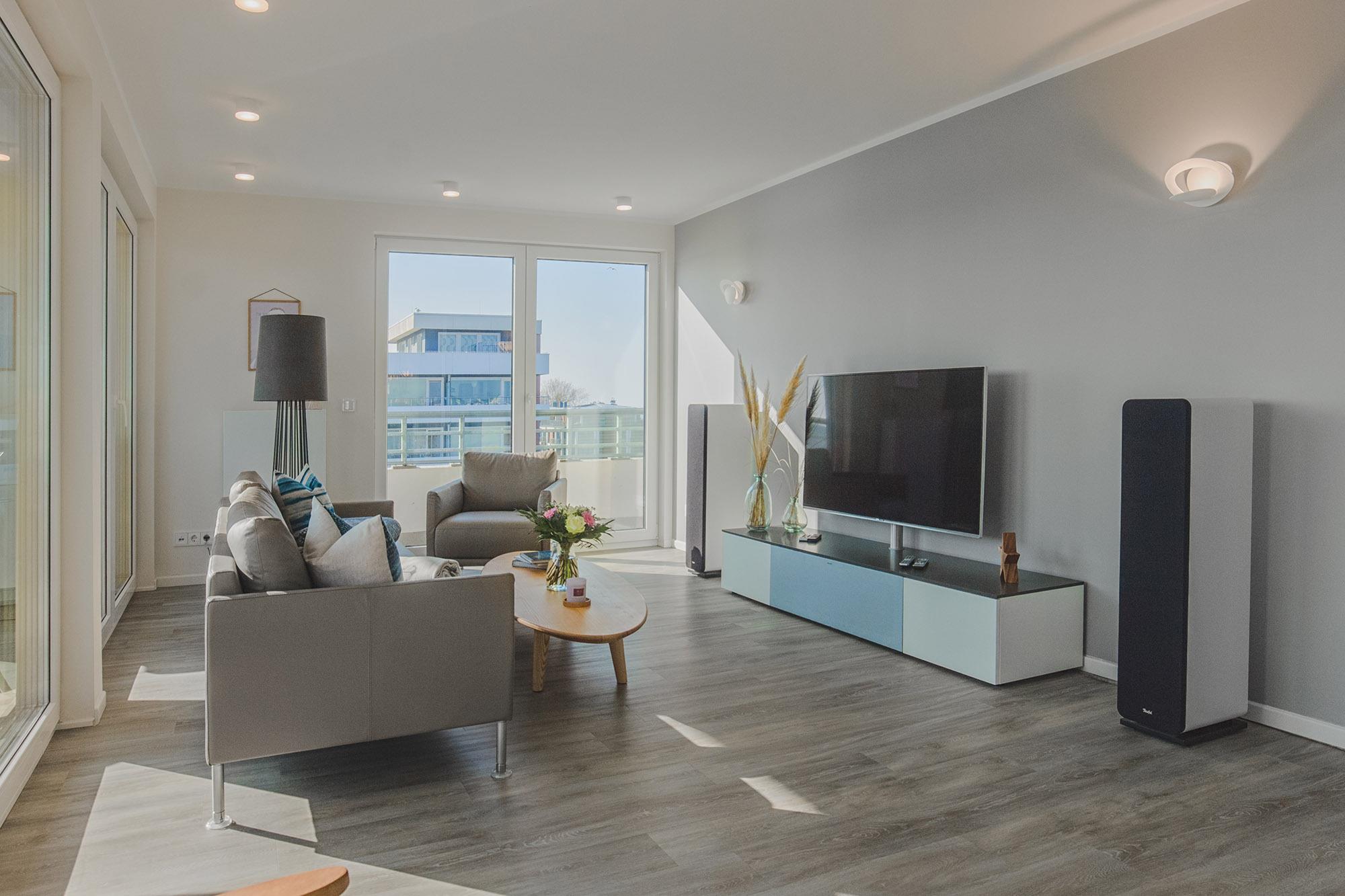 Die Küche ist das Zentrum des platzfreundlichen Wohn- und Essbereiches. Diese ist zudem mit einer freistehenden Kücheninsel und Tresen sehr komfortabel und bietet während des Kochens ein traumhaftes Binnenseepanorama. Es ist alles an Geräten und Utensilien vorhanden, was Sie für Ihren hochwertigen Urlaub erwarten. Der Kulinarik steht nichts im Wege.
