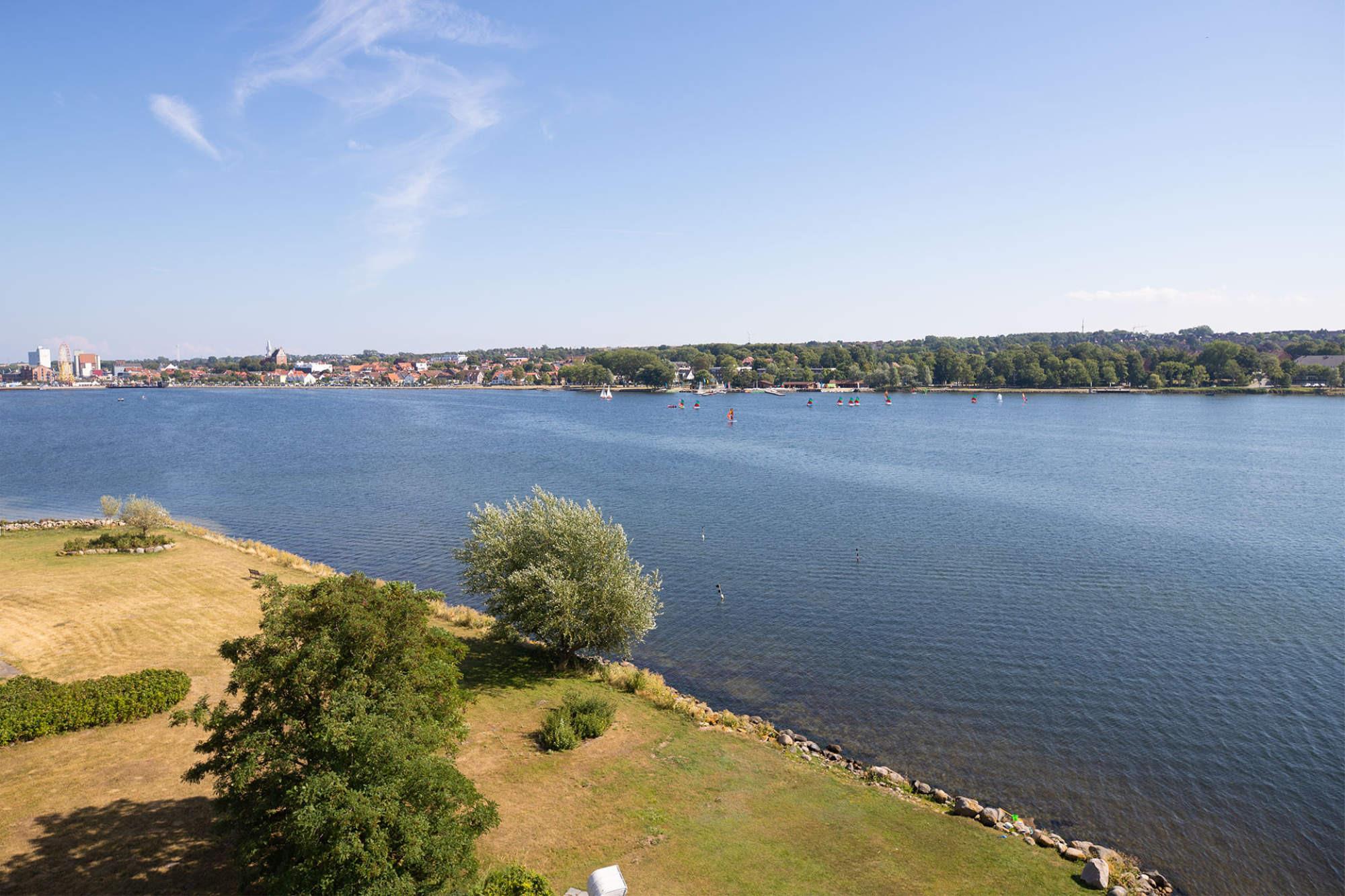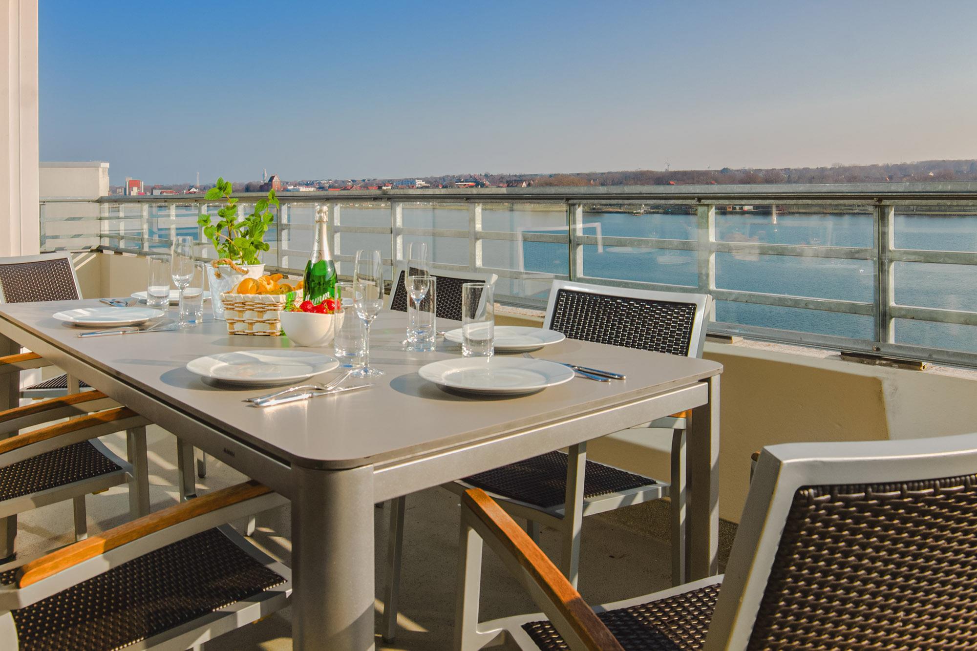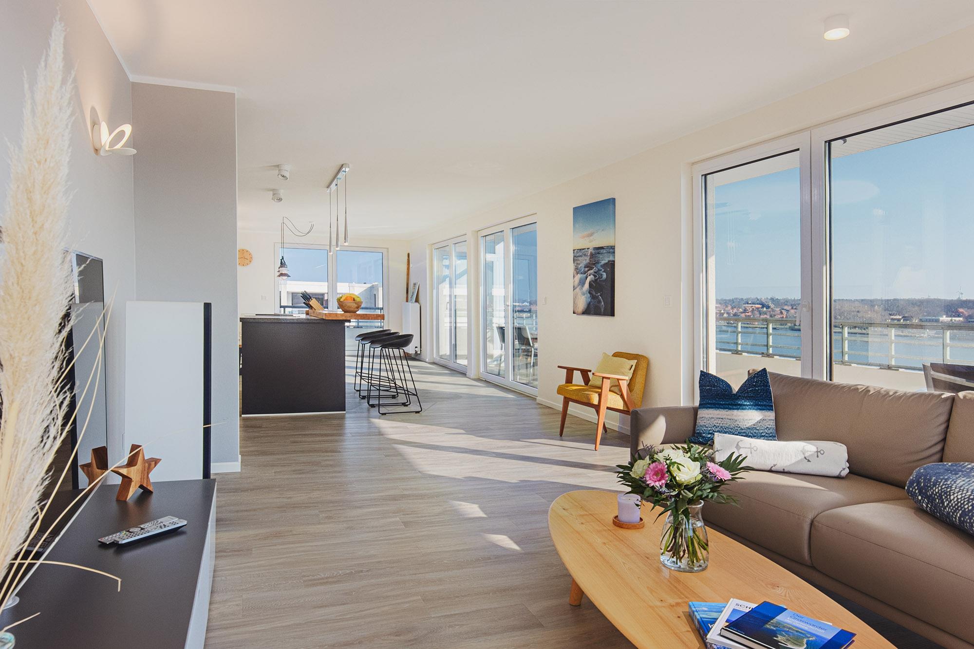 In bester Lage auf dem Steinwarder und mit Blick über die Dächer von Heiligenhafen liegt diese exklusive Ferienwohnung Dat Penthus. Mit eigenem Zugang zum Binnensee und nur wenige Meter von der Ostsee und dem Strand entfernt, hat man aus jedem Fenster einen fantastischen Blick auf das Wasser. Die eigene umlaufende und möblierte Dachterrasse, sowie die bodentiefen Fenster erlauben eine unvergessliche 360° Rundumsicht auf Ostsee, zur Fehmarnsundbrücke, dem Binnensee und der Stadt Heiligenhafen.