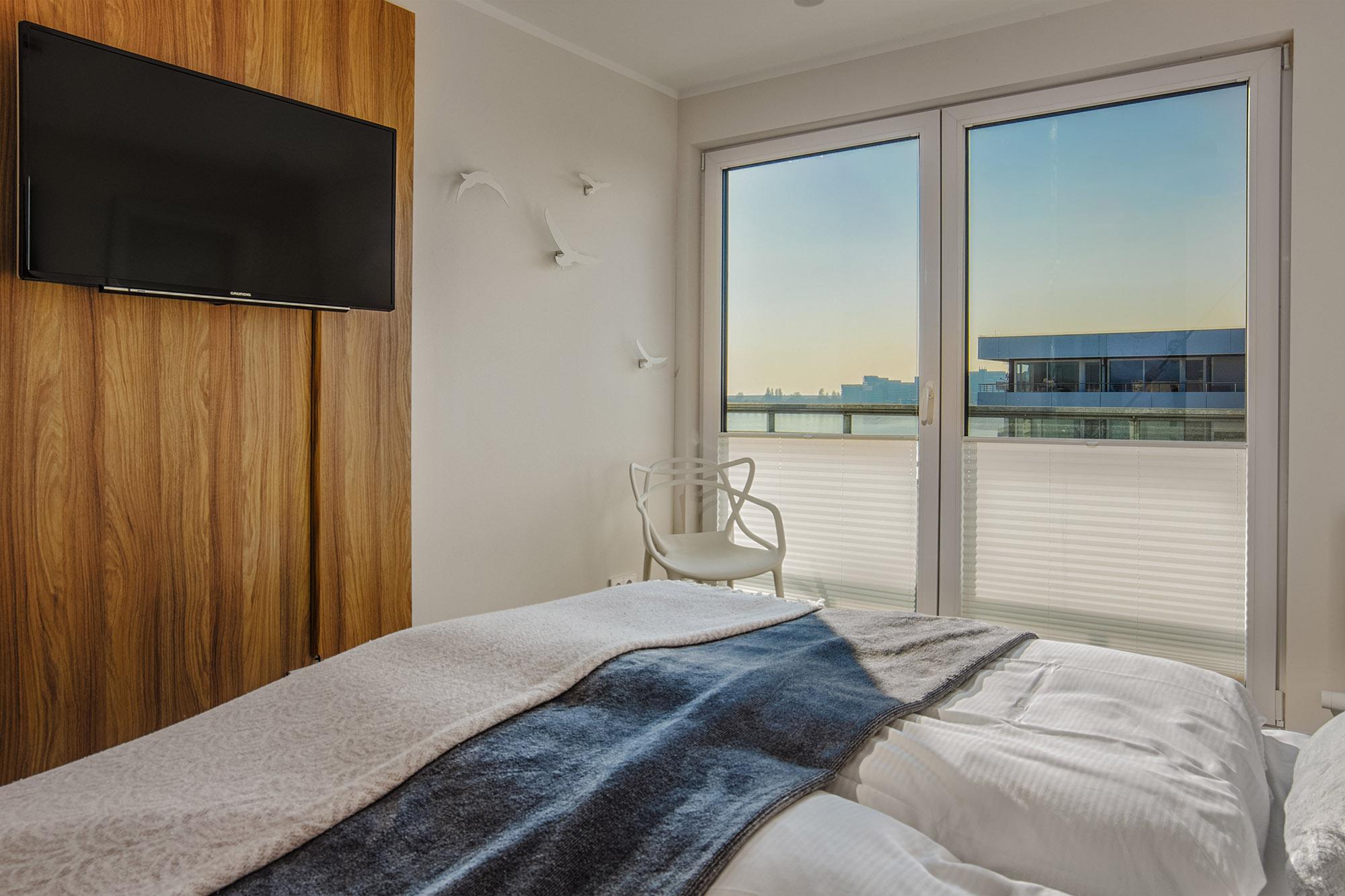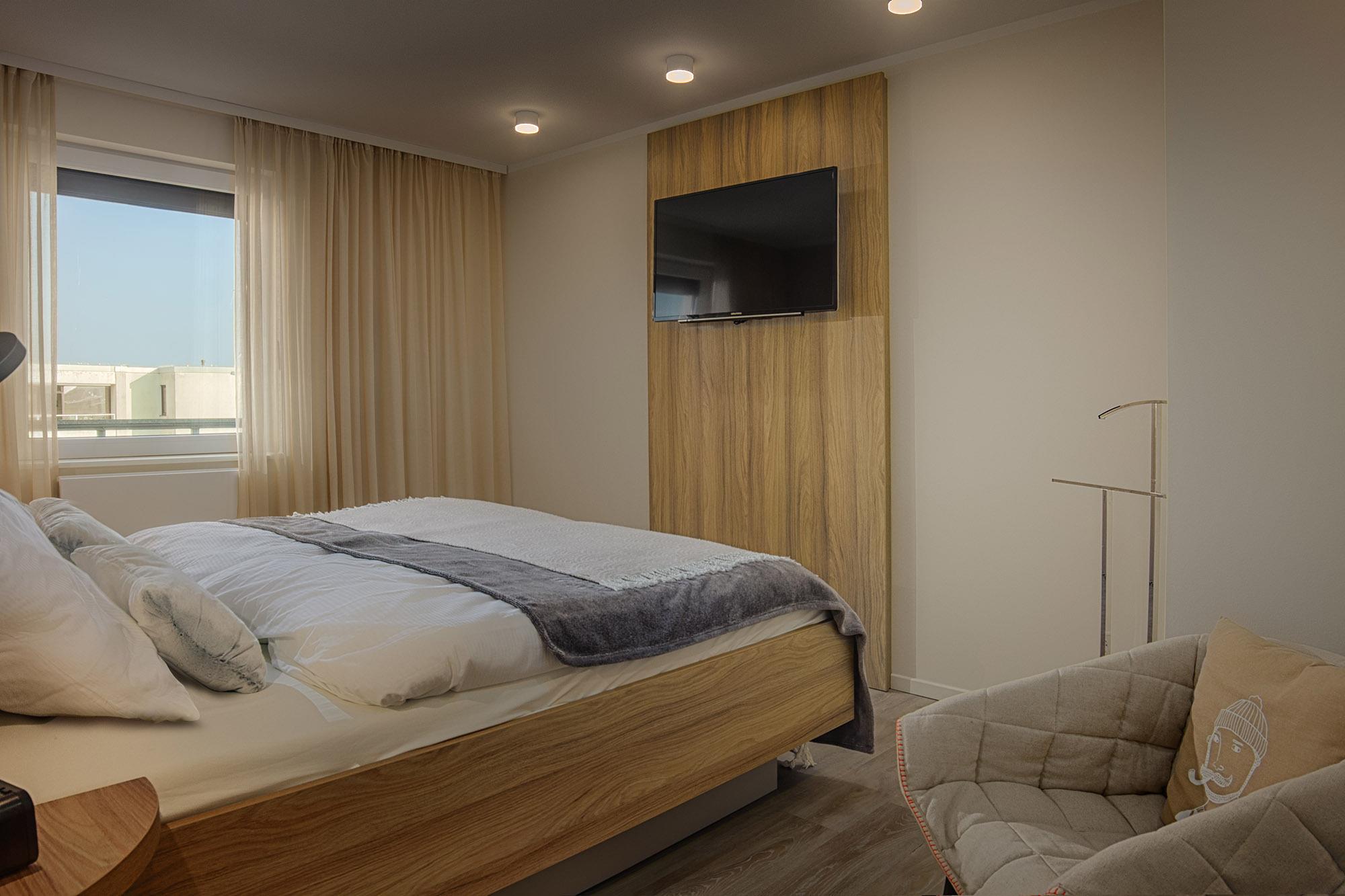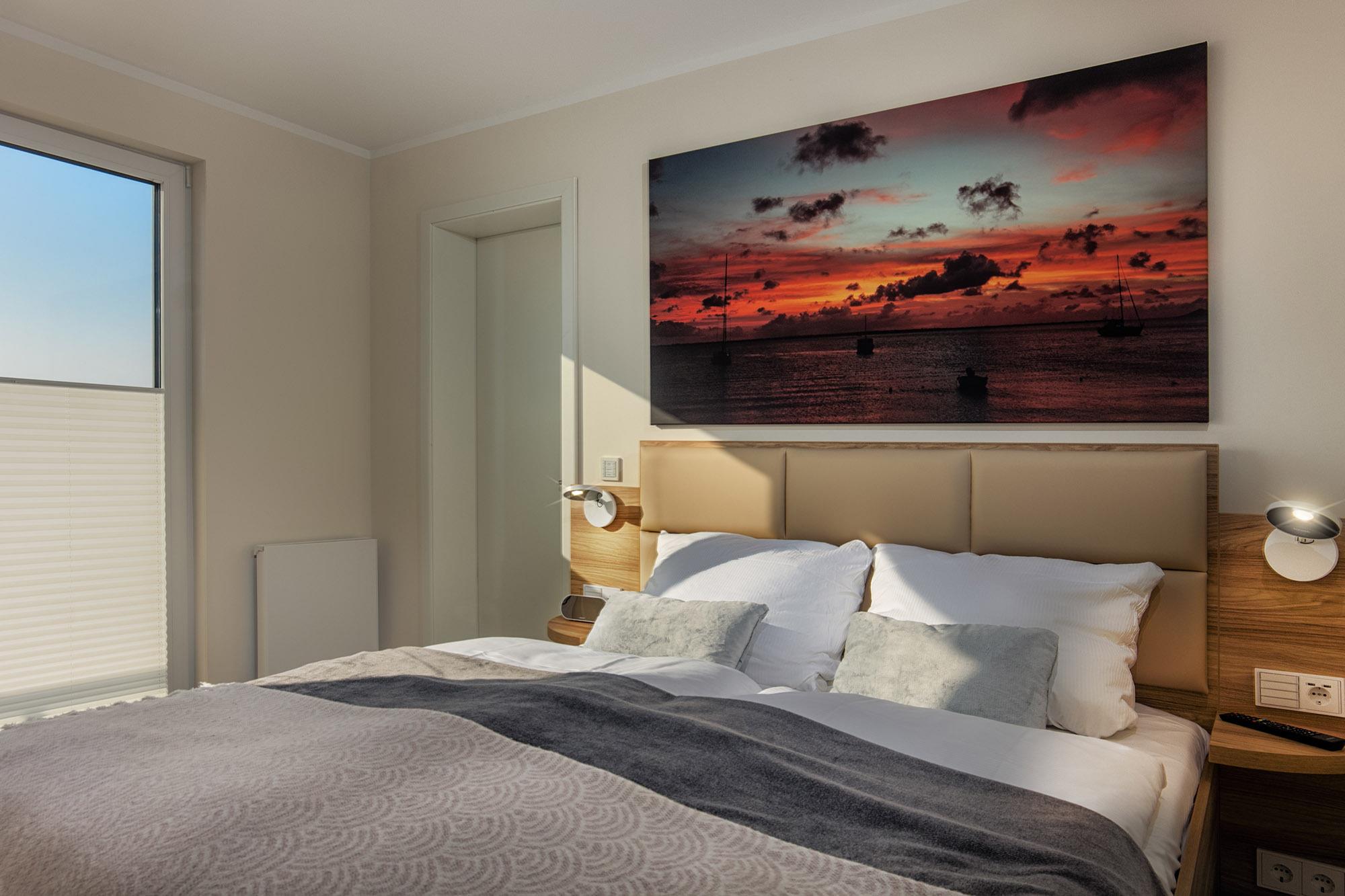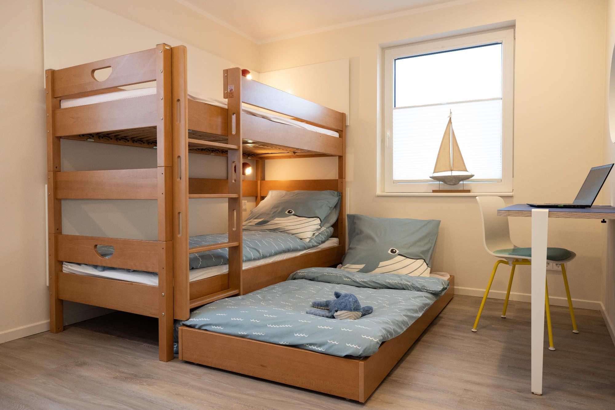 Dat Penthus verfügt über maximal 7 Schlafmöglichkeiten durch zwei separate Schlafzimmer mit Doppelbetten (160x200 und 180x200) und einem Schlafzimmer als Kinderzimmer konzipiert mit Etagenbett (90x200) und Ausziehelement für ein drittes Kind. Alle Räume haben Rollläden bzw. zusätzlich Plissees und Vorhänge zum Sichtschutz und zur Verdunklung. Komfortables Licht und Steuerelemente gehören hier einfach dazu.