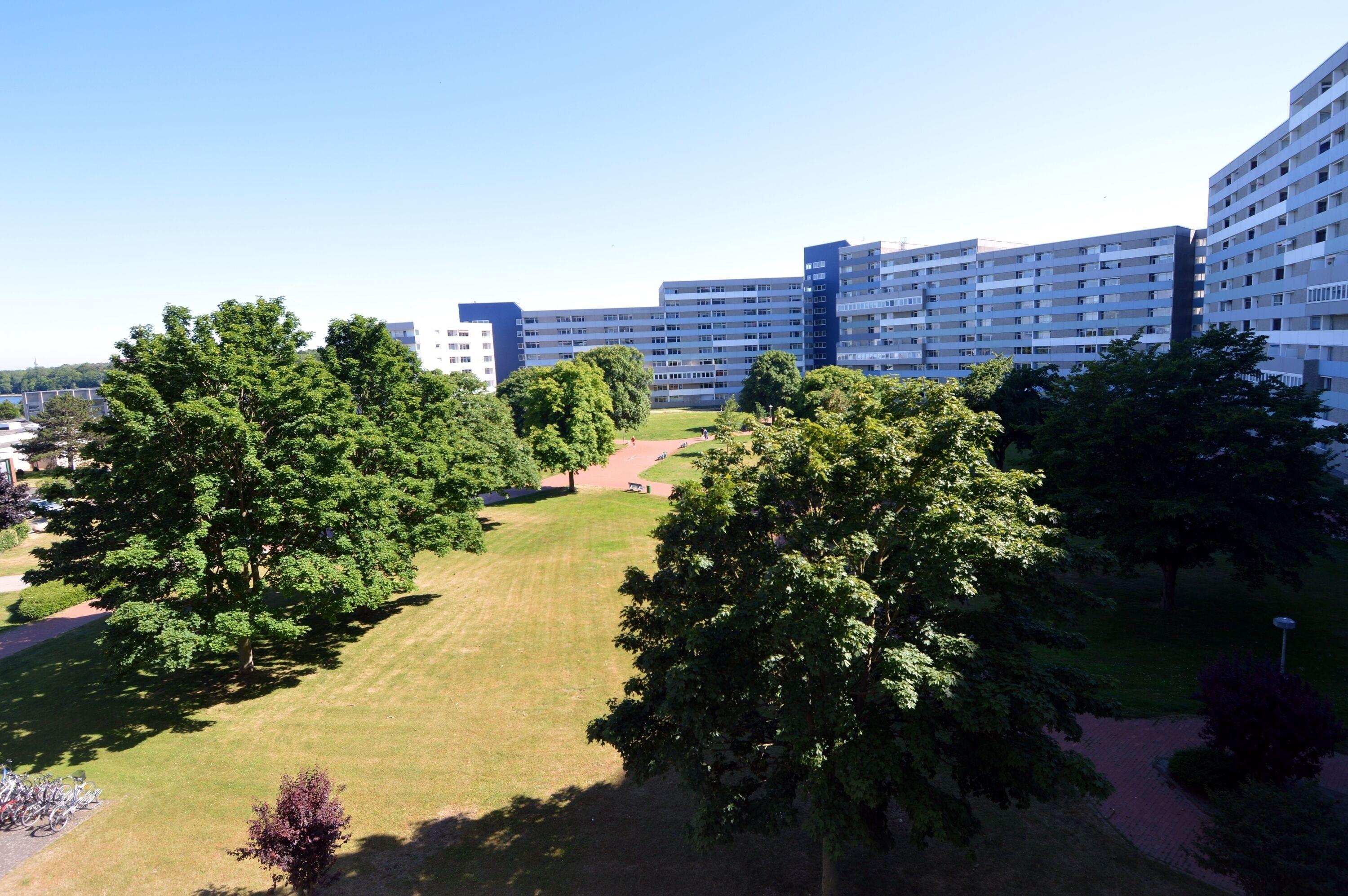 Auf dem Balkon mit Balkonmöbeln erwartet Sie der Blick in den begrünten Innenhof, der nach Süden ausgerichtet ist. Hier können Sie die Sonne genießen, ein gutes Buch lesen oder einfach nur die Seele baumeln lassen. Bei Bedarf sorgt eine Senkrechtmarkise für schattige Plätzchen.