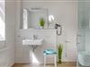 Das moderne Badezimmer ist mit einer ebenerdigen Dusche, Handtuchwärmer, Waschbecken und WC ausgestattet. Ein separater Waschraum mit Waschmaschine, Bügeleisen und Bügelbrett steht Gästen des Gutshauses im Erdgeschoss zur Verfügung.