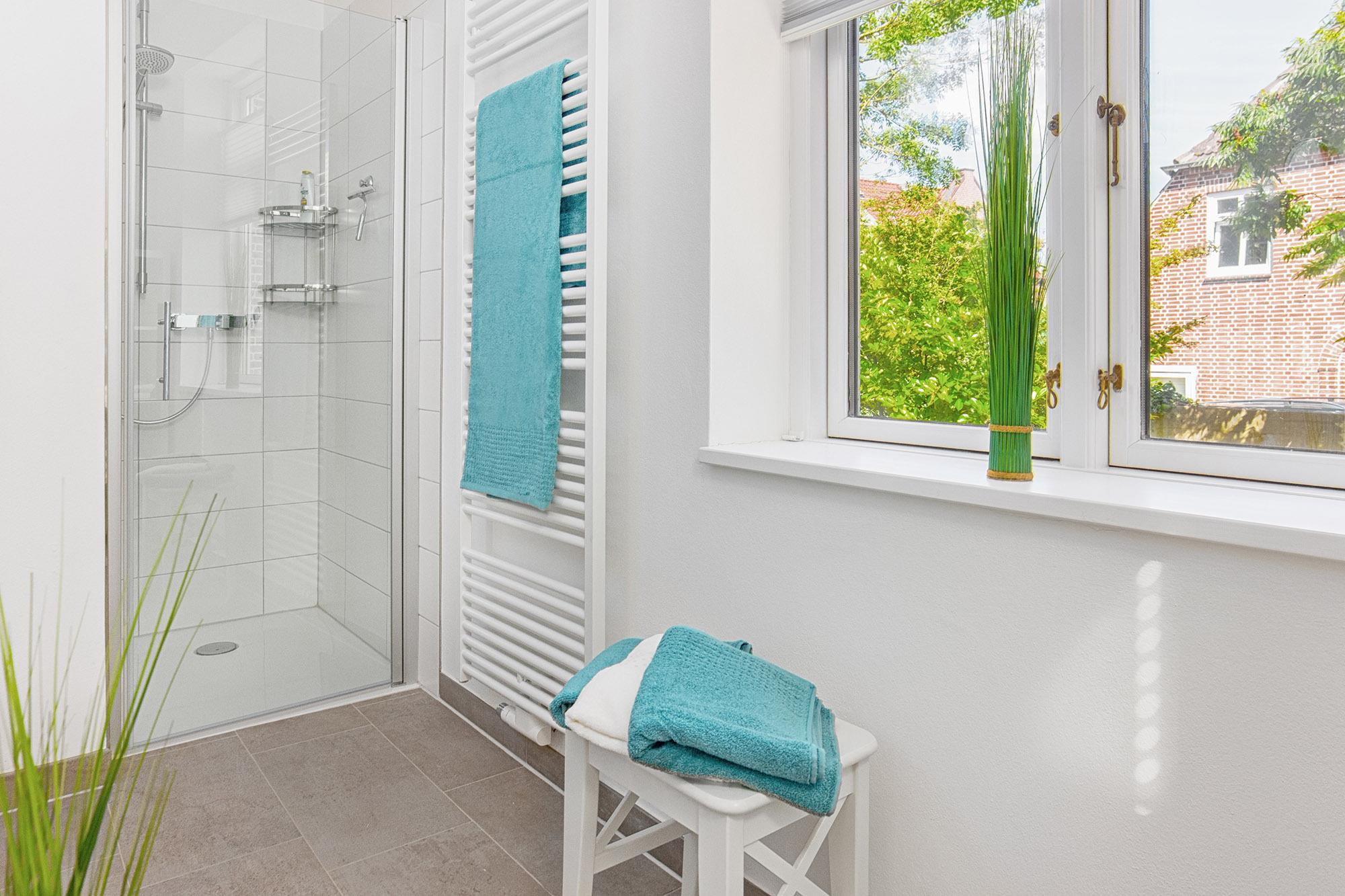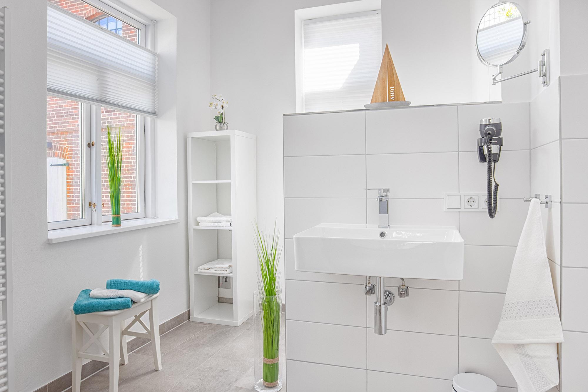 Das moderne Badezimmer ist mit einer ebenerdigen Dusche, einem Handtuchwärmer, Waschbecken und WC ausgestattet und bietet höchsten Komfort für eine erfrischende Auszeit. Zusätzlich gibt es im Erdgeschoss einen separaten Raum, der den Gästen des Gutshauses zur Verfügung steht. Hier befinden sich eine Waschmaschine, ein Bügeleisen und ein Bügelbrett für zusätzlichen Komfort während Ihres Aufenthalts.