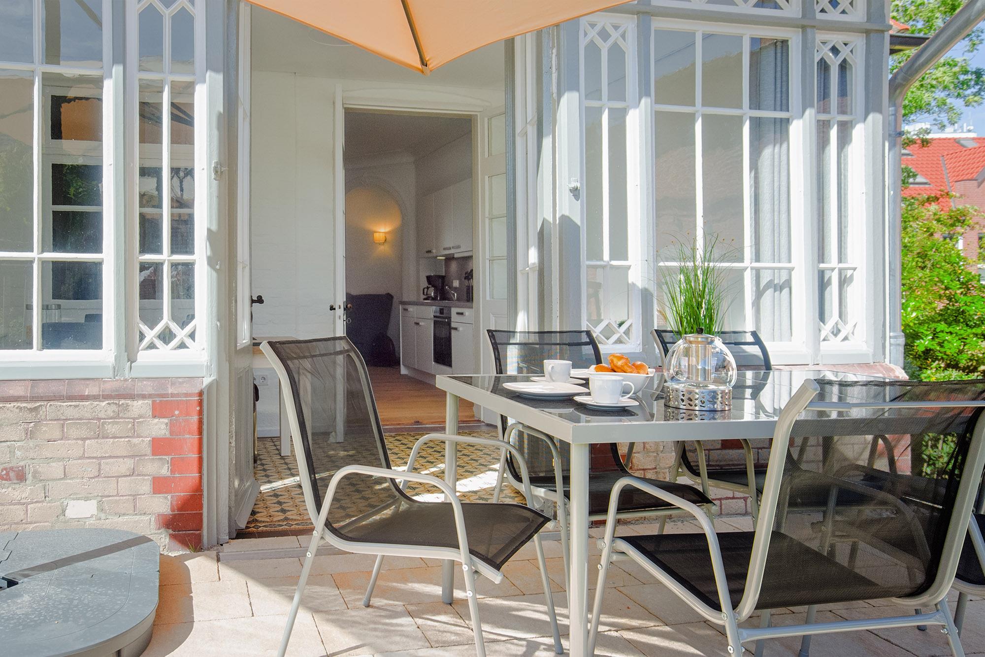 Die voll ausgestattete Küche ist in den Wohnbereich integriert und bietet alle Annehmlichkeiten für Ihre kulinarischen Bedürfnisse. Der angrenzende, großzügige Essbereich im Wintergarten verleiht Ihren Mahlzeiten mit seinen historischen Elementen eine besondere Atmosphäre. Eine möblierte Terrasse mit Sonnenschirm lädt zum Verweilen im Freien ein und ermöglicht Ihnen entspannte Grillabende unter freiem Himmel.