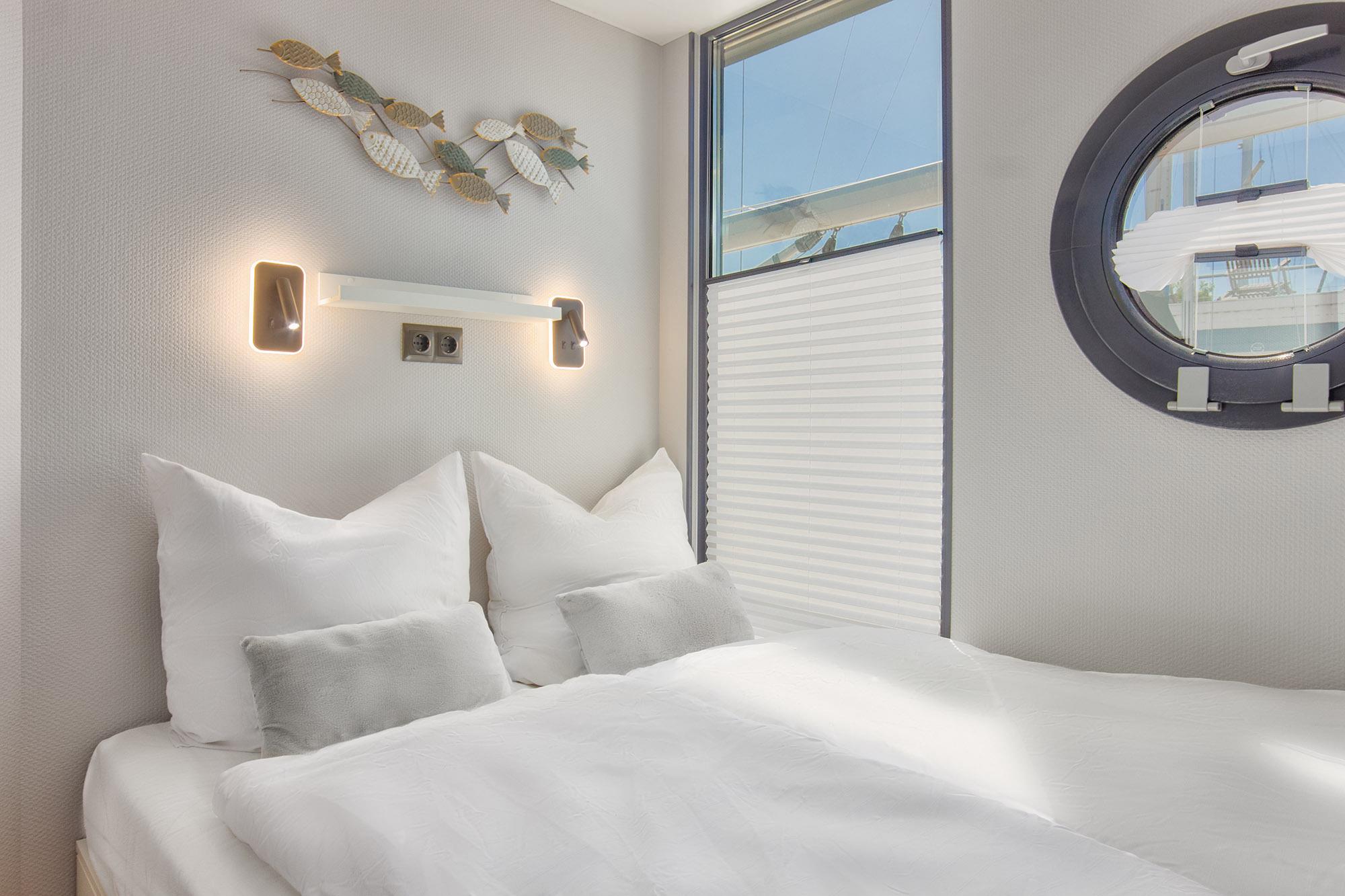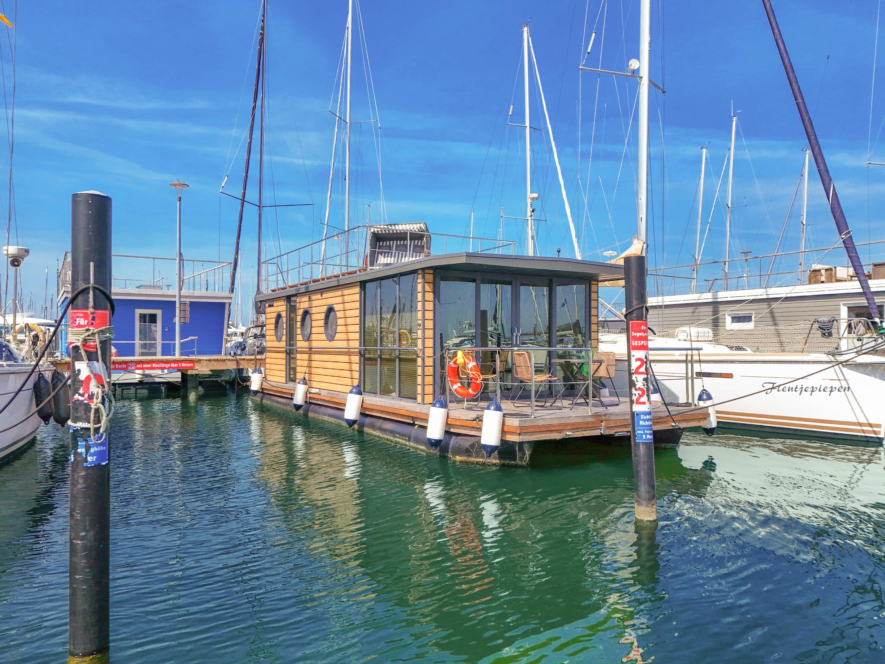 Das exklusive Hausboot Kleine Auszeit mit ca. 32 m² Wohnfläche, separater Bio-Sauna (bis 70°C) und zusätzlich eine möblierte Dachterrasse mit Strandkorb als Sonnendeck, verbunden über eine außenliegende Treppe. Der moderne und konzipierte Wohnbereich bietet Ihnen einen fantastischen Panoramablick über den Jachthafen und vom Sonnendeck über die Ostsee. Näher am Wasser kann man nicht Urlaub machen!