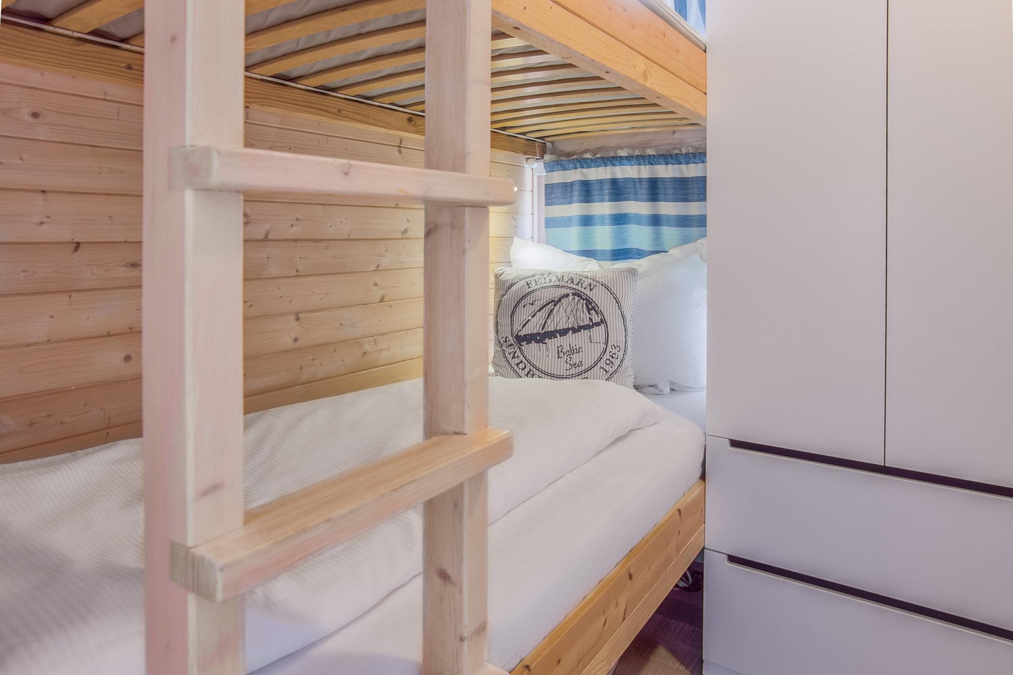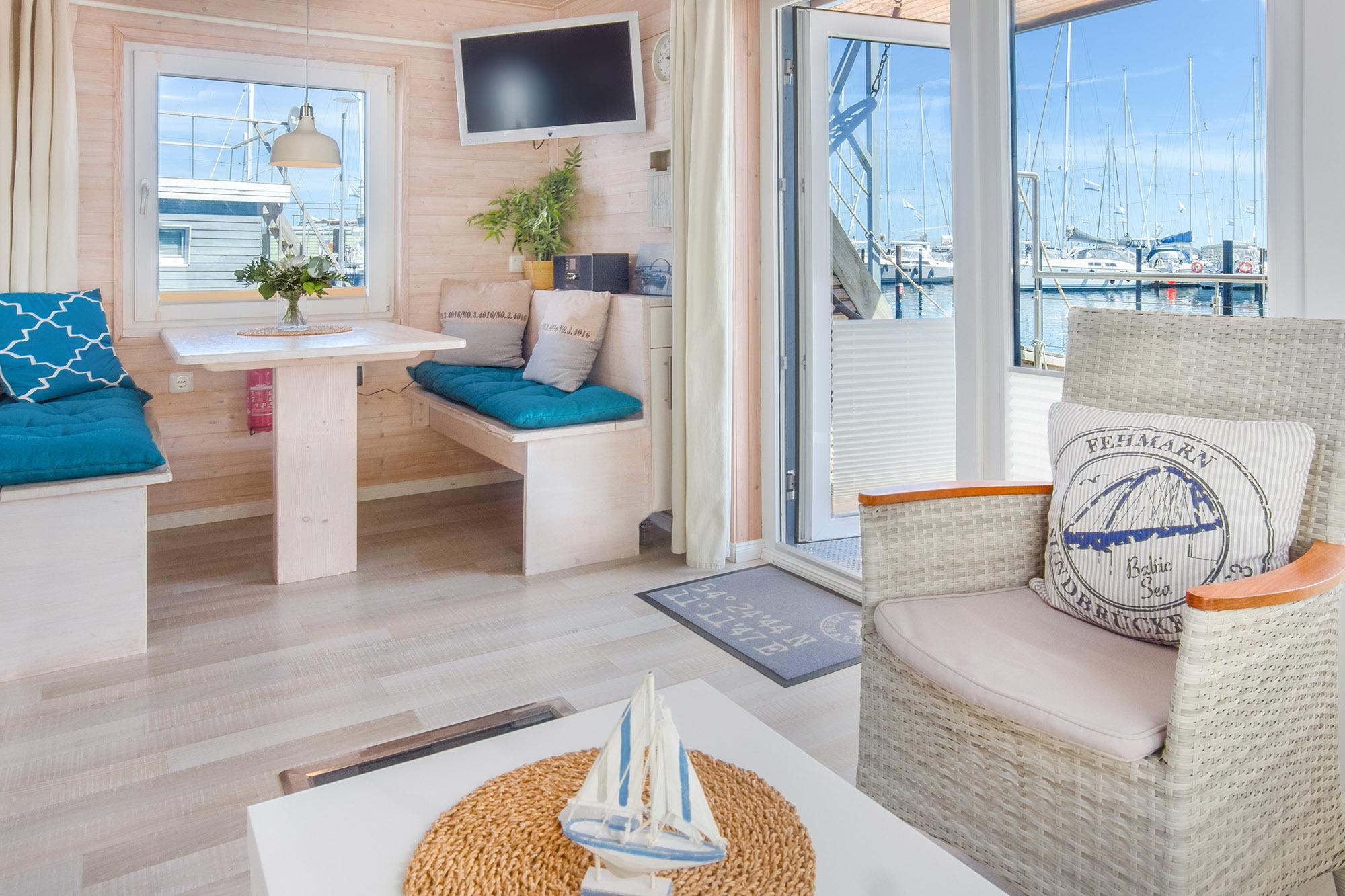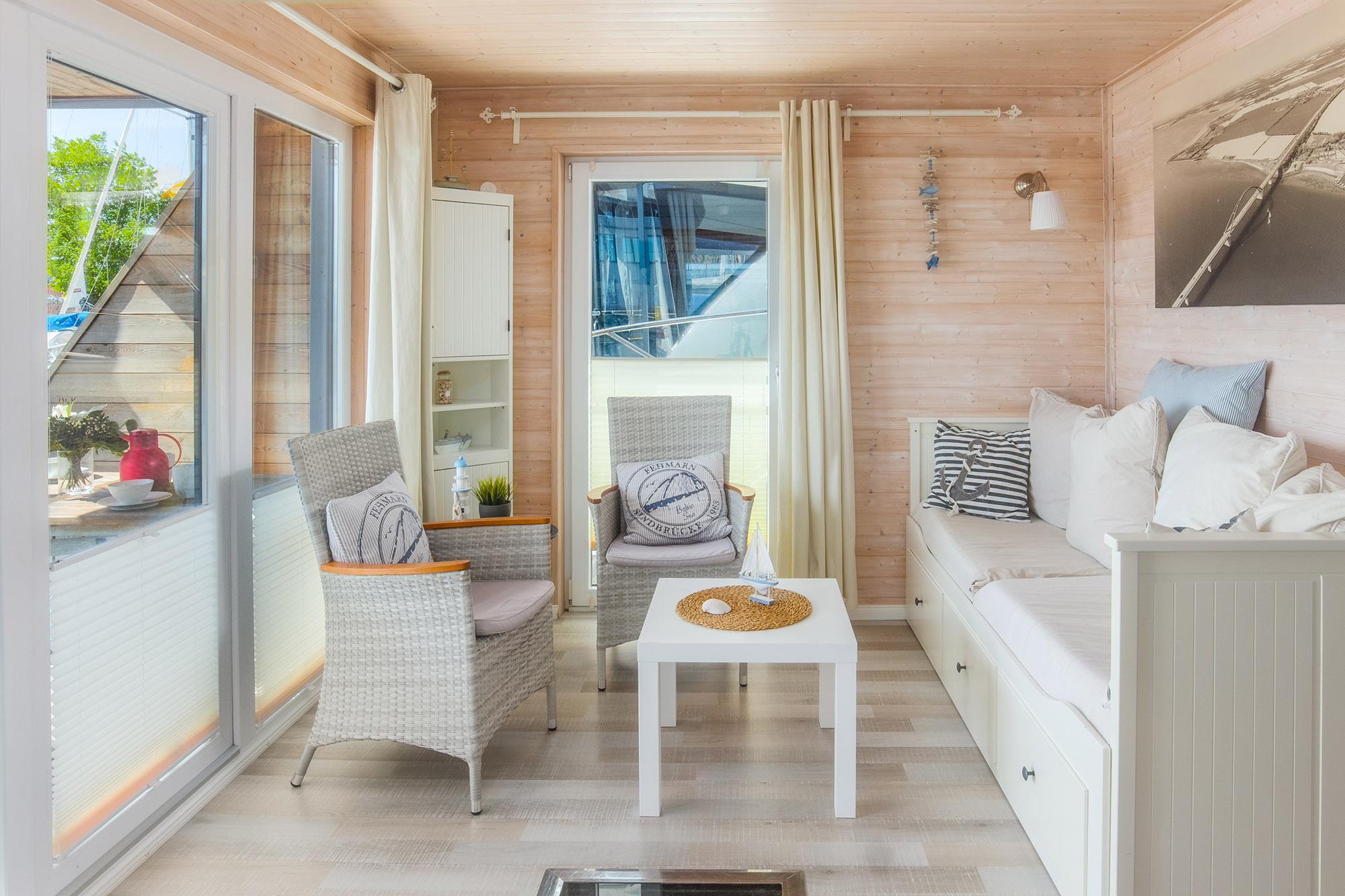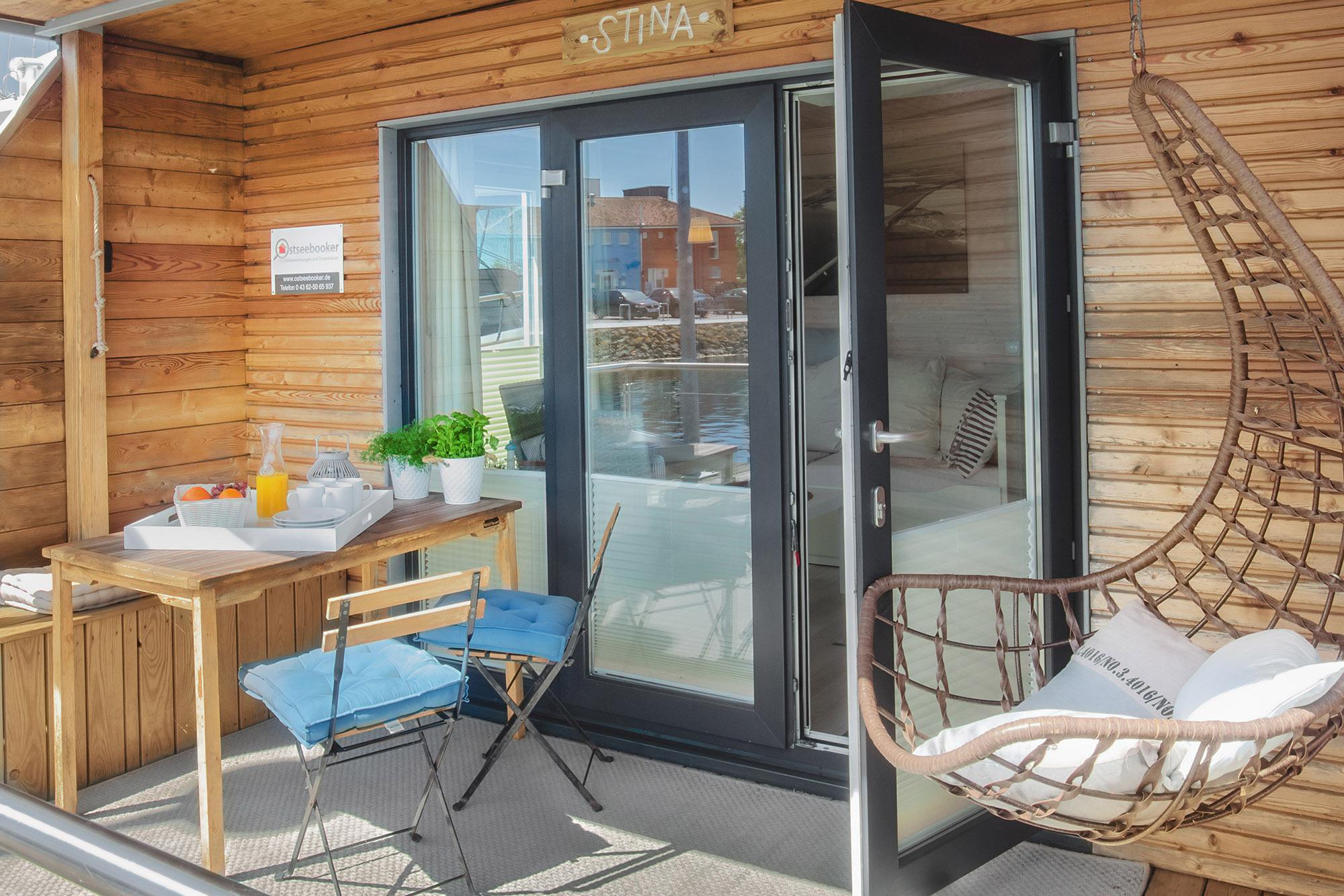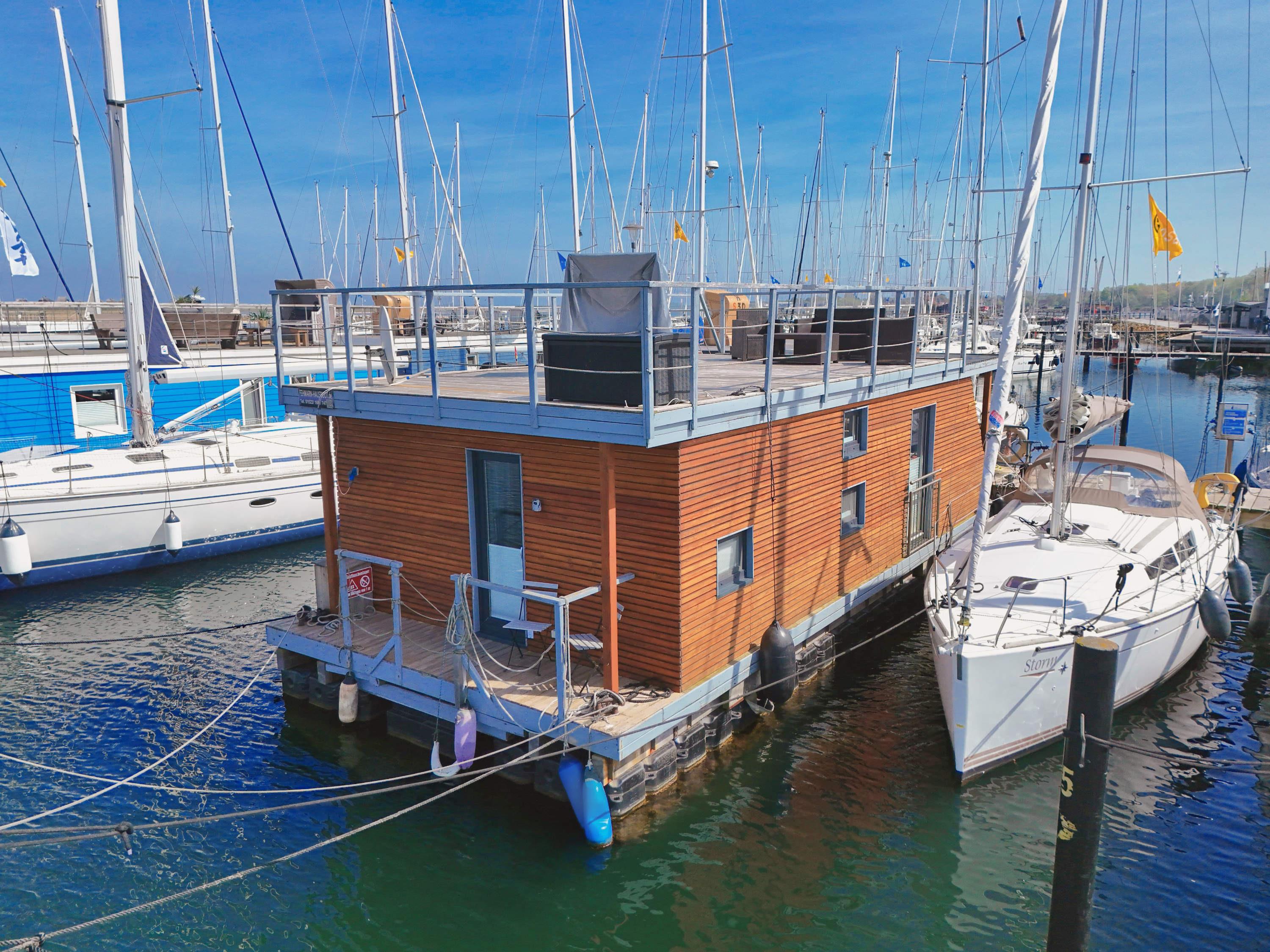 Auf zwei Ebenen erstreckt sich dieses exklusive Hausboot Stina auf ca. 25 m² Wohnfläche und zusätzlich die möblierte Dachterrasse als Sonnendeck, verbunden über eine außenliegende Treppe. Der moderne und konzipierte Wohnbereich bietet Ihnen einen fantastischen Panoramablick über den Jachthafen und vom Sonnendeck über die Ostsee. Näher am Wasser kann man nicht Urlaub machen!