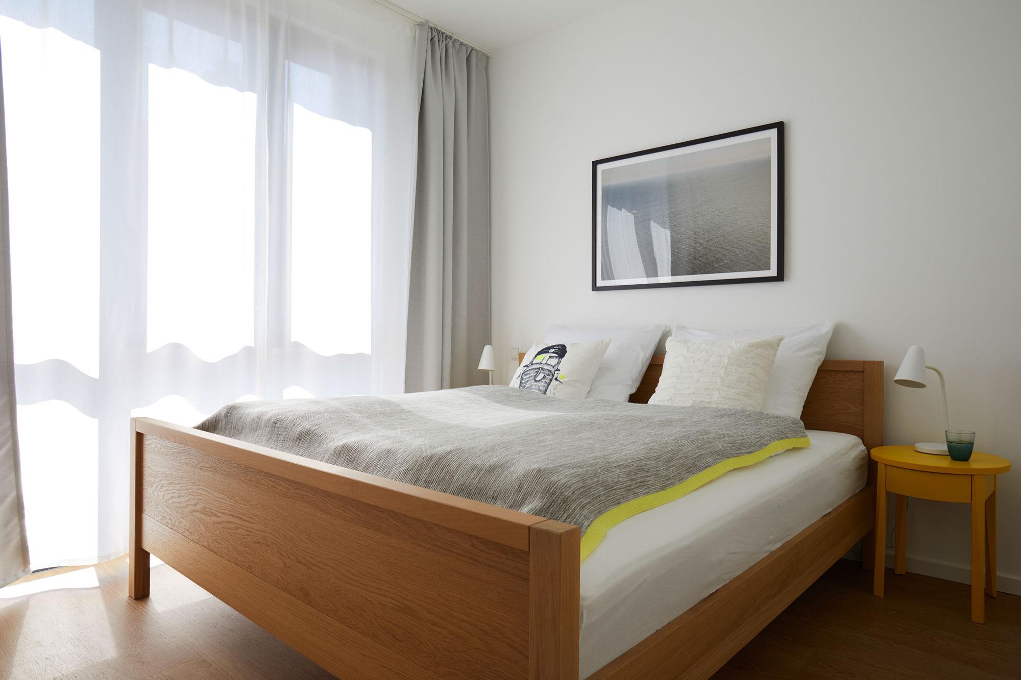 Die Heiligenhafenbude verfügt über ein separates Schlafzimmer mit Doppelbett und eigenem TV. Für zusätzlichen Schlafkomfort sorgt die Schlafcouch im Wohnbereich. Damit ist die Wohnung ideal für kleine Familien oder Paare. Für höchsten Komfort sind elektrische Außenrollos vorhanden, die für angenehme Dunkelheit und ungestörte Nächte sorgen. Allergikerfreundliche Bettwäsche, Handtücher sowie ein Babyreisebett können bei Bedarf gegen Gebühr geliehen werden. Ein Hochstuhl steht kostenlos zur Verfügung.