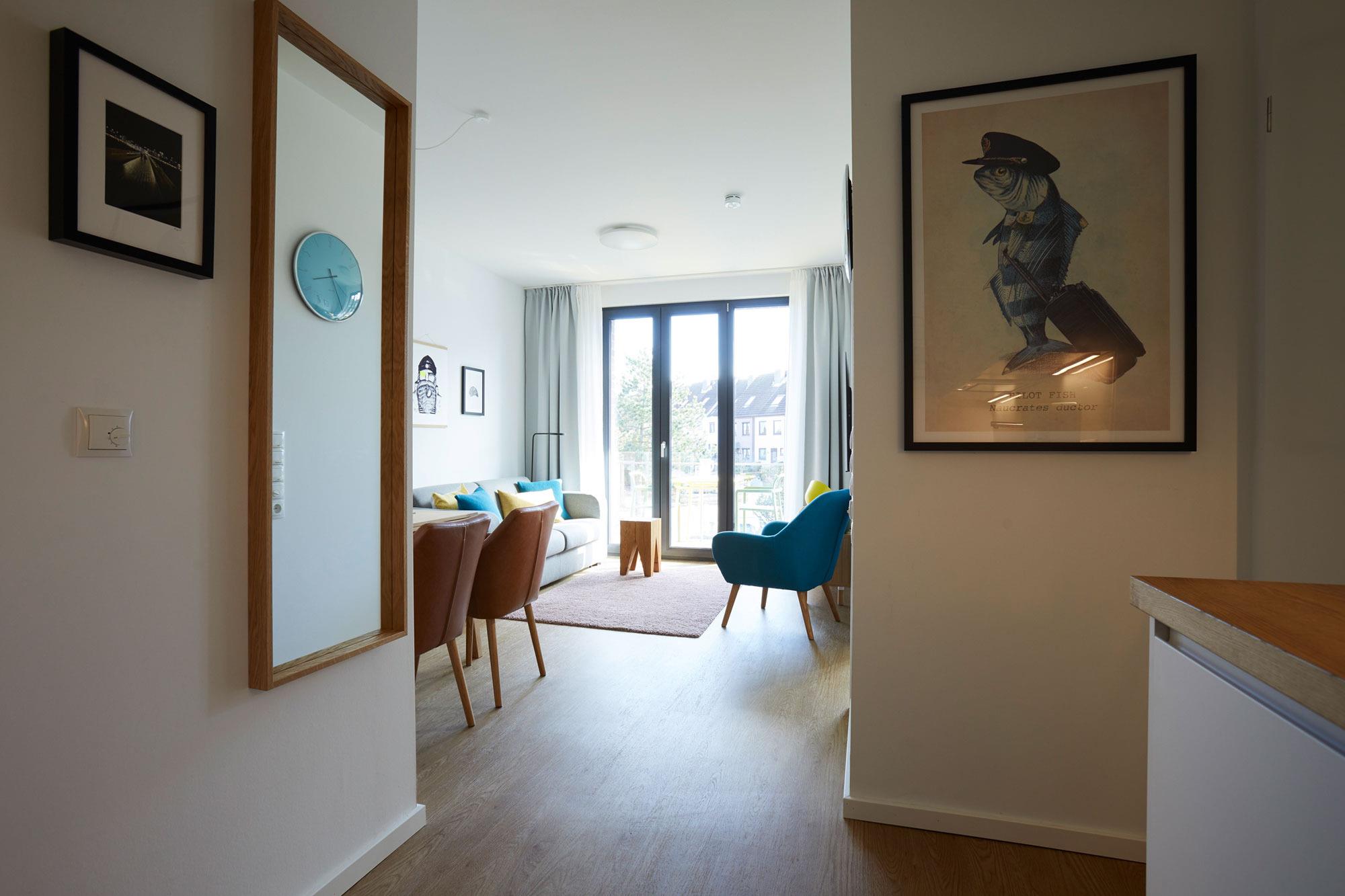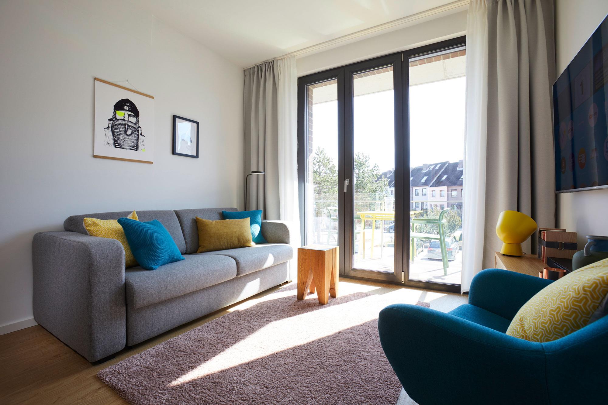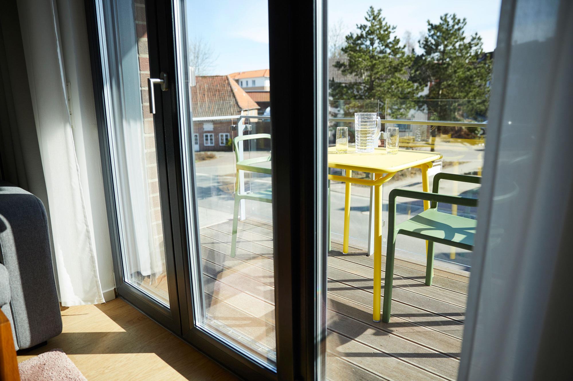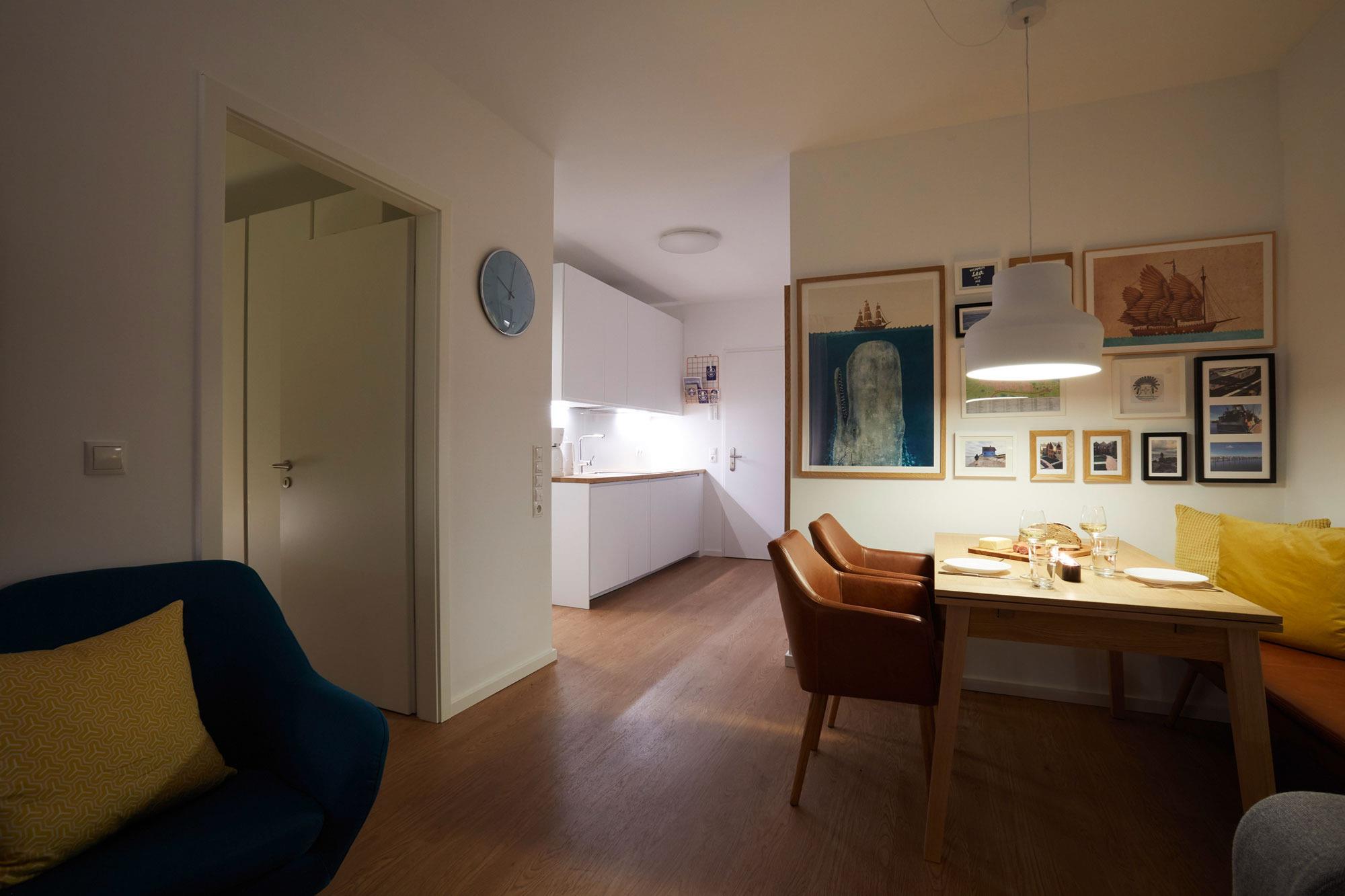 Der geschmackvolle Wohnbereich lädt mit einer bequemen Couch (Schlaffunktion für die 3. und 4. Person) und einem gemütlichen Sessel zum Entspannen ein. Ob nach einem langen Strandspaziergang oder einem Bummel durch Heiligenhafen – hier können Sie es sich einfach gemütlich machen. Zur Unterhaltung stehen Ihnen Smart-TV, Blue-Ray-Player, Musikanlage und kostenfreies WLAN zur Verfügung. Sie möchten Ihre Lieblingsserien oder Filme per Stream schauen? Kein Problem! Die Fußbodenheizung sorgt für wohlige Wärme und ein angenehmes Wohngefühl. Dank der bodentiefen Fenster strömt viel Tageslicht in die Wohnung. Von hier aus gelangen Sie auf den möblierten Südbalkon – ein wunderbarer Ort, um die Sonne zu genießen oder das Treiben in der Umgebung zu beobachten. Perfekt für entspannte Stunden mit einer Tasse Kaffee oder einem Glas Wein.